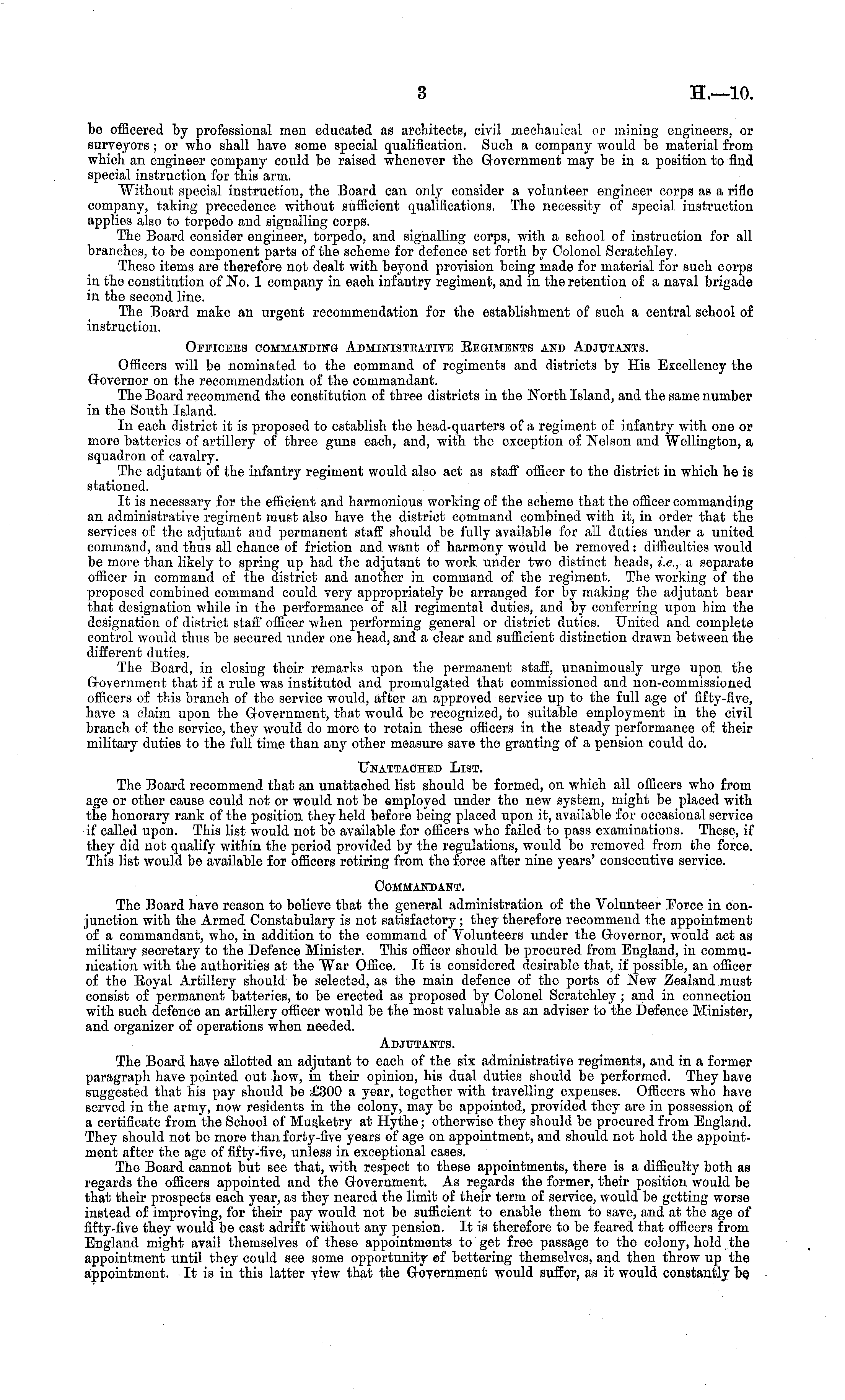 be officered by professional men educated as architects, civil mechanical or mining engineers, or surveyors ;or who shall have some special qualification. Such a company would be material from which an engineer company could be raised whenever the Government may be in a position to find special instruction for this arm. Without special instruction, the Board can only consider a volunteer engineer corps as a rifle company, taking precedence without sufficient qualifications. The necessity of special instruction applies also to torpedo and signalling corps. The Board consider engineer, torpedo, and signalling corps, with a school of instruction for all branches, to be component parts of the scheme for defence set forth by Colonel Scratchley. These items are therefore not dealt with beyond provision being made for material for such corps in the constitution of No. 1 company in each infantry regiment, and in the retention of a naval brigade in the second line. The Board make an urgent recommendation for the establishment of such a central school of instruction. Officers commanding Administrative Eegiments and Adjutants. Officers will be nominated to the command of regiments and districts by His Excellency the Governor on the recommendation of the commandant. The Board recommend the constitution of three districts in the North Island, and the same number in the South Island. In each district it is proposed to establish the head-quarters of a regiment of infantry with one or more batteries of artillery of three guns each, and, with the exception of Nelson and Wellington, a squadron of cavalry. The adjutant of the infantry regiment would also act as staff officer to the district in which he is stationed. It is necessary for the efficient and harmonious working of the scheme that the officer commanding an administrative regiment must also have the district command combined with it, in order that the services of the adjutant and permanent staff should be fully available for all duties under a united command, and thus all chance of friction and want of harmony would be removed: difficulties would be more than likely to spring up had the adjutant to work under two distinct heads, i.e., a separate officer in command of the district and another in command of the regiment. The working of the proposed combined command could very appropriately be arranged for by making the adjutant bear that designation while in the performance of all regimental duties, and by conferring upon him the designation of district staff officer when performing general or district duties. United and complete control would thus be secured under one head, and a clear and sufficient distinction drawn between the different duties. The Board, in closing their remarks upon the permanent staff, unanimously urge upon the Government that if a rule was instituted and promulgated that commissioned and non-commissioned officers of this branch of the service would, after an approved service up to the full age of fifty-five, have a claim upon the Government, that would be recognized, to suitable employment in the civil branch of the service, they would do more to retain these officers in the steady performance of their military duties to the full time than any other measure save the granting of a pension could do. Unattached List. The Board recommend that an unattached list should be formed, on which all officers who from age or other cause could not or would not be employed under the new system, might be placed with the honorary rank of the position they held before being placed upon it, available for occasional service if called upon. This list would not be available for officers who failed to pass examinations. These, if they did not qualify within the period provided by the regulations, would be removed from the force. This list would be available for officers retiring from the force after nine years' consecutive service. Commandant. The Board have reason to believe that the general administration of the Volunteer Force in conjunction with the Armed Constabulary is not satisfactory; they therefore recommend the appointment of a commandant, who, in addition to the command of Volunteers under the Governor, would act as military secretary to the Defence Minister. This officer should be procured from England, in communication with the authorities at the War Office. It is considered desirable that, if possible, an officer of the Eoyal Artillery should be selected, as the main defence of the ports of New Zealand must consist of permanent batteries, to be erected as proposed by Colonel Scratchley; and in connection with such defence an artillery officer would be the most valuable as an adviser to the Defence Minister, and organizer of operations when needed. Adjutants. The Board have allotted an adjutant to each of the six administrative regiments, and in a former paragraph have pointed out how, in their opinion, his dual duties should be performed. They have suggested that his pay should be £300 a year, together with travelling expenses. Officers who have served in the army, now residents in the colony, may be appointed, provided they are in possession of a certificate from the School of Musketry at Hythe; otherwise they should be procured from England. They should not be more than forty-five years of age on appointment, and should not hold the appointment after the age of fifty-five, unless in exceptional cases. The Board cannot but see that, with respect to these appointments, there is a difficulty both as regards the officers appointed and the Government. As regards the former, their position would be that their prospects each year, as they neared the limit of their term of service, would be getting worse instead of improving, for their pay would not be sufficient to enable them to save, and at the age of fifty-five they would be cast adrift without any pension. It is therefore to be feared that officers from England might avail themselves