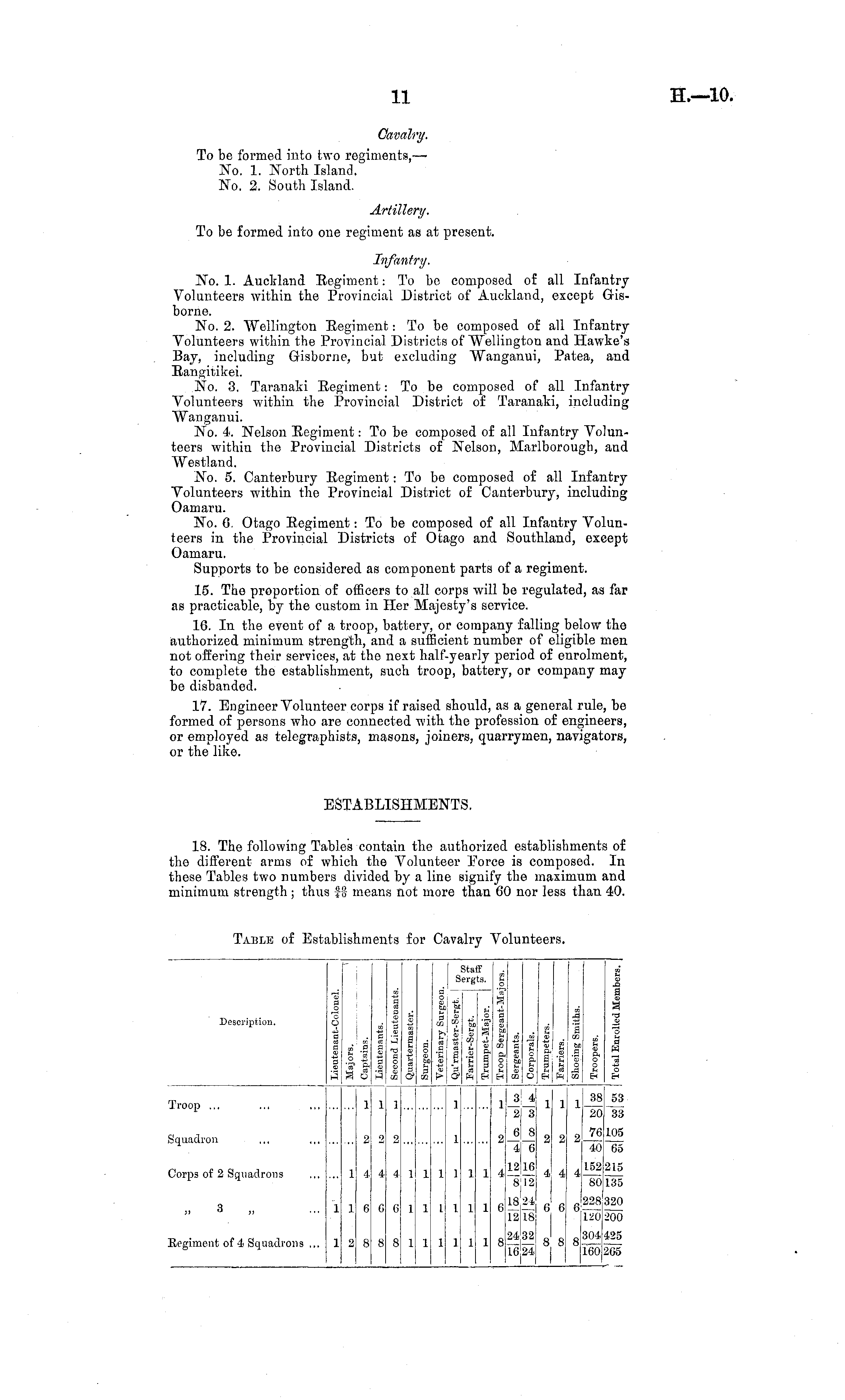 Cavalry. To be formed into two regiments,— No. 1. North Island. No. 2. South Island. Artillery. To be formed into one regiment as at present. Infantry. No. 1. Auckland Regiment: To be composed of all Infantry Volunteers within the Provincial District of Auckland, except Gisborne. No. 2. Wellington Regiment: To be composed of all Infantry Volunteers within the Provincial Districts of Wellington and Hawke's Bay, including Gisborne, but excluding Wanganui, Patea, and Rangitikei. No. 3. Taranaki Regiment: To be composed of all Infantry Volunteers within the Provincial District of Taranaki, including Wanganui. No. 4. Nelson Regiment: To be composed of all Infantry Volunteers within the Provincial Districts of Nelson, Marlborough, and Westland. No. 5. Canterbury Regiment: To be composed of all Infantry Volunteers within the Provincial District of Canterbury, including Oamaru. No. 6. Otago Regiment; To be composed of all Infantry Volunteers in the Provincial Districts of Otago and Southland, except Oamaru. Supports to be considered as component parts of a regiment. 15. The proportion of officers to all corps will be regulated, as far as practicable, by the custom in Her Majesty's service. 16. In the event of a troop, battery, or company falling below the authorized minimum strength, and a sufficient number of eligible men not offering their services, at the next half-yearly period of enrolment, to complete the establishment, such troop, battery, or company may be disbanded. 17. Engineer Volunteer corps if raised should, as a general rule, be formed of persons who are connected with the profession of engineers, or employed as telegraphists, masons, joiners, quarrymen, navigators, or the like. ESTABLISHMENTS. 18. The following Tables contain the authorized establishments of the different arms of which the Volunteer Force is composed. In these Tables two numbers divided by a line signify the maximum and minimum strength ; thus fS means not more than 60 nor less than 40.