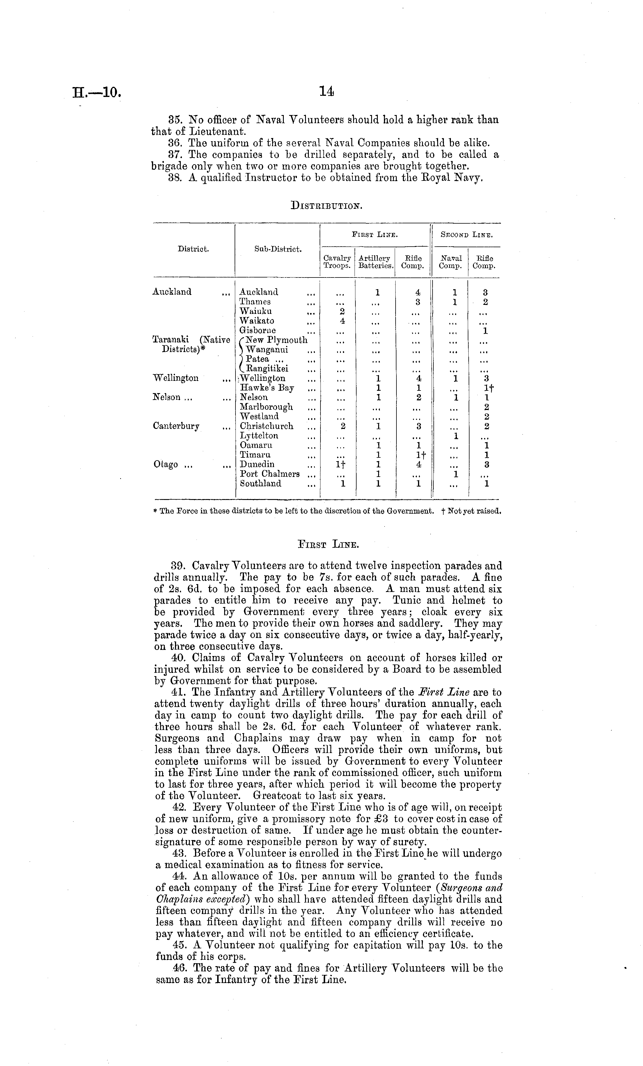 First Line. Second Line. District. Sub-District. Cavalry Artillery Troops. Batteries. Naval Eifle Comp. Comp. Rifle Comp. Auckland Auckland Thames Waiuku Waikato Gisborne (New Plymouth \ Wanganui 1 Patea ... (. Rangitikei Wellington Hawke's Bay Nelson Marlborough Westland Christchureh Lyttelton Oamaru Timaru Dunedin Port Chalmers ... Southland 2 4 1 4 3 1 1 3 2 Taranaki (Native Districts)* i Wellington 1 1 1 4 1 2 1 3 It 1 2 2 2 Nelson ... "i Canterbury 2 i 3 i Otago ... it i l l l l "i It 4 1 1 3 i i "i i
