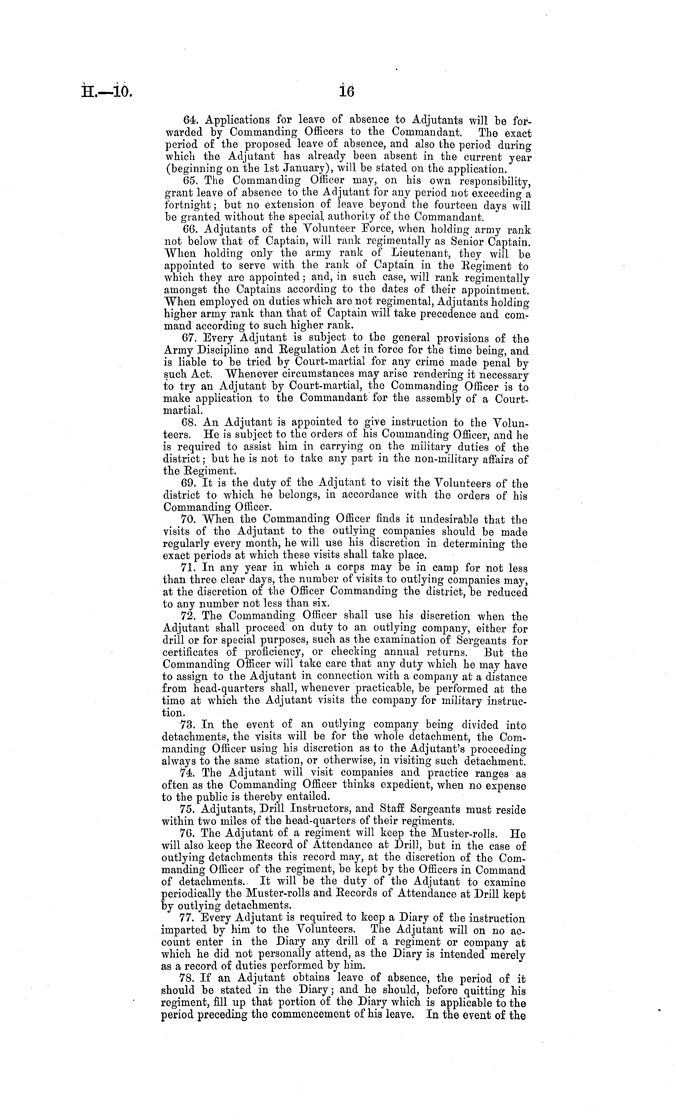 64. Applications for leave of absence to Adjutants will be forwarded by Commanding Officers to the Commandant. The exact period of the proposed leave of absence, and also the period during which the Adjutant has already been absent in the current year (beginning on the Ist January), will be stated on the application. 65. The Commanding Officer may, on his own responsibility, grant leave of absence to the Adjutant for any period not exceeding a fortnight; but no extension of leave beyond the fourteen days will be granted without the special authority of the Commandant. 66. Adjutants of the Volunteer Force, when holding army rank not below that of Captain, will rank regimentally as Senior Captain. When holding only the army rank of Lieutenant, they will be appointed to serve with the rank of Captain in the Regiment to which they are appointed; and, in such case, will rank regimentally amongst the Captains according to the dates of their appointment. When employed on duties which are not regimental, Adjutants holding higher army rank than that of Captain will take precedence and command according to such higher rank. 67. Every Adjutant is subject to the general provisions of the Army Discipline and Regulation Act in force for the time being, and is liable to be tried by Court-martial for any crime made penal by such Act. Whenever circumstances may arise rendering it necessary to try an Adjutant by Court-martial, the Commanding Officer is to make application to the Commandant for the assembly of a Courtmartial. 68. An Adjutant is appointed to give instruction to the Volunteers. He is subject to the orders of his Commanding Officer, and he is required to assist him in carrying on the military duties of the district; but he is not to take any part in the non-military affairs of the Regiment. 69. It is the duty of the Adjutant to visit the Volunteers of the district to which he belongs, in accordance with the orders of his Commanding Officer. 70. When the Commanding Officer finds it undesirable that the visits of the Adjutant to the outlying companies should be made regularly every month, he will use his discretion in determining the exact periods at which these visits shall take place. 71. In any year in which a corps may be in camp for not less than three clear days, the number of visits to outlying companies may, at the discretion of the Officer Commanding the district, be reduced to any number not less than six. 72. The Commanding Officer shall use his discretion when the Adjutant shall proceed on duty to an outlying company, either for drill or for special purposes, such as the examination of Sergeants for certificates of proficiency, or checking annual returns. But the Commanding Officer will take care that any duty which he may have to assign to the Adjutant in connection with a company at a distance from head-quarters shall, whenever practicable, be performed at the time at which the Adjutant visits the company for military instruction. 73. In the event of an outlying company being divided into detachments, the visits will be for the whole detachment, the Commanding Officer using his discretion as to the Adjutant's proceeding always to the same station, or otherwise, in visiting such detachment. 74. The Adjutant will visit companies and practice ranges as often as the Commanding Officer thinks expedient, when no expense to the public is thereby entailed. 75. Adjutants, Drill Instructors, and Staff Sergeants must reside within two miles of the head-quarters of their regiments. 76. The Adjutant of a regiment will keep the Muster-rolls. He will also keep the Record of Attendance at Drill, but in the case of outlying detachments this record may, at the discretion of the Commanding Officer of the regiment, be kept by the Officers in Command of detachments.. It will be the duty of the Adjutant to examine periodically the Muster-rolls and Records of Attendance at Drill kept by outlying detachments. 77. Every Adjutant is required to keep a Diary of the instruction imparted by him to the Volunteers. The Adjutant will on no account enter in the Diary any drill of a regiment or company at which he did not personally attend, as the Diary is intended merely as a record of duties performed by him. 78. If an Adjutant obtains leave of absence, the period of it should be stated in the Diary; and he should, before quitting his regiment, fill up that portion of the Diary which is applicable to the period preceding the commencement of his leave, In the event of the