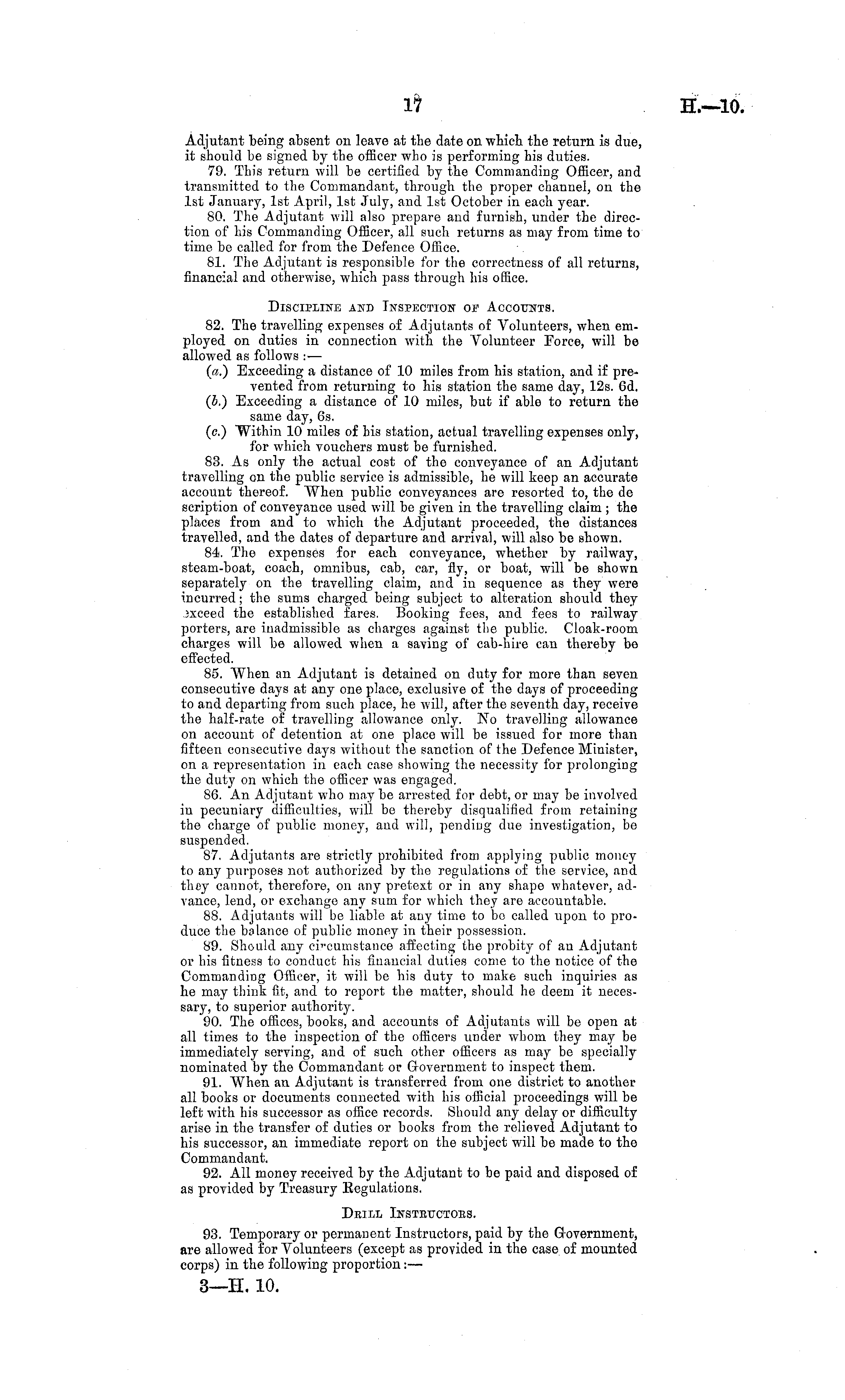 Adjutant being absent on leave at the date on which the return is due, it should be signed by the officer who is performing his duties. 79. This return will be certified by the Commanding Officer, and transmitted to the Commandant, through the proper channel, on the Ist January, Ist April, Ist July, and Ist October in each year. 80. The Adjutant will also prepare and furnish, under the direction of his Commanding Officer, all such returns as may from time to time be called for from the Defence Office. 81. The Adjutant is responsible for the correctness of all returns, financial and otherwise, which pass through his office. Discipline and Inspection oe Accounts. 82. The travelling expenses of Adjutants of Volunteers, when employed on duties in connection with the Volunteer Force, will be allowed as follows :— (a.) Exceeding a distance of 10 miles from his station, and if prevented from returning to his station the same day, 12s. 6d. (b.) Exceeding a distance of 10 miles, but if able to return the same day, 6s. (c.) Within 10 miles of his station, actual travelling expenses only, for which vouchers must be furnished. 83. As only the actual cost of the conveyance of an Adjutant travelling on the public service is admissible, he will keep an accurate account thereof. When public conveyances are resorted to, the de scription of conveyance used will be given in the travelling claim ; the places from and to which the Adjutant proceeded, the distances travelled, and the dates of departure and arrival, will also be shown. 84. The expenses for each conveyance, whether by railway, steam-boat, coach, omnibus, cab, car, fly, or boat, will be shown separately on the travelling claim, and in sequence as they were incurred; the sums charged being subject to alteration should they exceed the established fares. Booking fees, and fees to railway porters, are inadmissible as charges against the public. Cloak-room charges will be allowed when a saving of cab-hire can thereby be effected. 85. When an Adjutant is detained on duty for more than seven consecutive days at any one place, exclusive of the days of proceeding to and departing from such place, he will, after the seventh day, receive the half-rate of travelling allowance only. No travelling allowance on account of detention at one place will be issued for more than fifteen consecutive days without the sanction of the Defence Minister, on a representation in each case showing the necessity for prolonging the duty on which the officer was engaged. 86. An Adjutant who may be arrested for debt, or may be involved in pecuniary difficulties, will be thereby disqualified from retaining the charge of public money, and will, pending due investigation, be suspended. 87. Adjutants are strictly prohibited from applying public money to any purposes not authorized by the regulations of the service, and they cannot, therefore, on any pretext or in any shape whatever, advance, lend, or exchange any sum for which they are accountable. 88. Adjutants will be liable at any time to be called upon to produce the balance of public money in their possession. 89. Should any circumstance affecting the probity of an Adjutant or his fitness to conduct his financial duties come to the notice of the Commanding Officer, it will be his duty to make such inquiries as he may think fit, and to report the matter, should he deem it necessary, to superior authority. 90. The offices, books, and accounts of Adjutants will be open at all times to the inspection of the officers under whom they may be immediately serving, and of such other officers as may be specially nominated by the Commandant or Government to inspect them. 91. When an Adjutant is transferred from one district to another all books or documents connected with his official proceedings will be left with his successor as office records. Should any delay or difficulty arise in the transfer of duties or books from the relieved Adjutant to his successor, an immediate report on the subject will be made to the Commandant. 92. All money received by the Adjutant to be paid and disposed of as provided by Treasury Regulations. Deill Insteuctoes. 93. Temporary or permanent Instructors, paid by the Government, are allowed for Volunteers (except as provided in the case of mounted corps) in the following proportion: — 3—H. 10.
