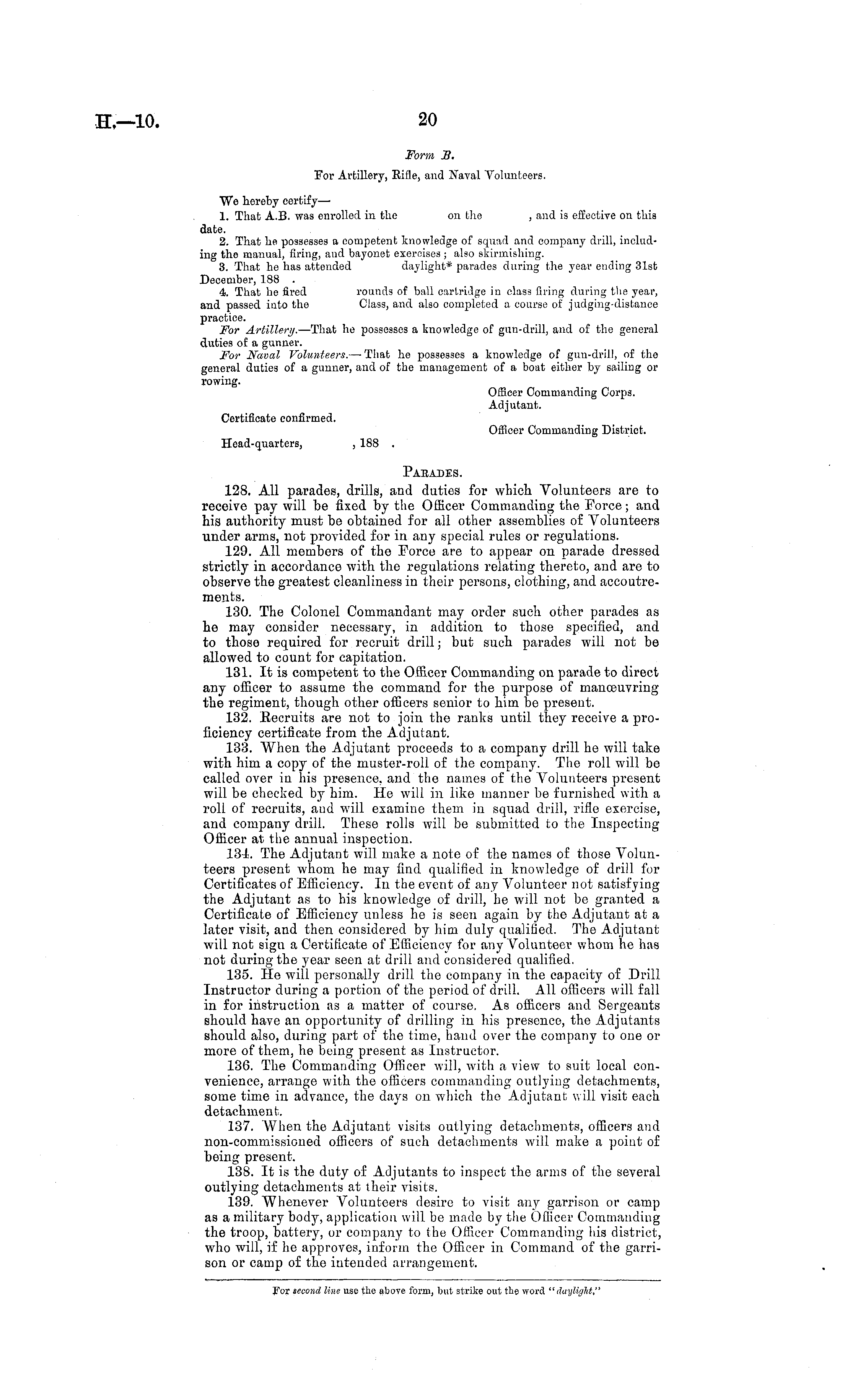 Form 3, For Artillery, Bide, and Naval Volunteers. We hereby certify— 1. That A.B. was enrolled in the on the , and is effective on this date. 2. That he possesses a competent knowledge of squad and company drill, including the manual, firing, and bayonet exercises ; also skirmishing. 3. That he has attended daylight* parades during the year ending 31st December, 188 . 4. That he iired rounds of ball cartridge in class firing during the year, and passed into the Class, and also completed a course of judging-distance practice. For Artillery. —That he possesses a knowledge of gun-drill, and of the general duties of a gunner. For Naval Volunteers. — That he possesses a knowledge of gun-drill, of the general duties of a gunner, and of the management of a boat either by sailing or rowing. Officer Commanding Corps. Adjutant. Certificate confirmed. Officer Commanding District. Head-quarters, , 188 . Paeades. 128. All parades, drills, and duties for which Volunteers are to receive pay will be fixed by the Officer Commanding the Force; and his authority must be obtained for all other assemblies of Volunteers under arms, not provided for in any special rules or regulations. 129. All members of the Force are to appear on parade dressed strictly in accordance with the regulations relating thereto, and are to observe the greatest cleanliness in their persons, clothing, and accoutrements. 130. The Colonel Commandant may order such other parades as he may consider necessary, in addition to those specified, and to those required for recruit drill • but such parades will not be allowed to count for capitation. 131. It is competent to the Officer Commanding on parade to direct any officer to assume the command for the purpose of manoeuvring the regiment, though other officers senior to him be present. 132. Recruits are not to join the ranks until they receive a proficiency certificate from the Adjutant. 133. When the A.djutant proceeds to a company drill he will take with him a copy of the muster-roll of the company. The roll will be called over in his presence, and the names of the Volunteers present will be checked by him. He will in like manner be furnished with a roll of recruits, and will examine them in squad drill, rifle exercise, and company drill. These rolls will be submitted to the Inspecting Officer at the annual inspection. 134. The Adjutant will make a note of the names of those Volunteers present whom he may find qualified in knowledge of drill for Certificates of Efficiency. In the event of any Volunteer not satisfying the Adjutant as to his knowledge of drill, he will not be granted a Certificate of Efficiency unless he is seen again by the Adjutant at a later visit, and then considered by him duly qualified. The Adjutant will not sign a Certificate of Efficiency for any Volunteer whom he has not during the year seen at drill and considered qualified. 135. He will personally drill the company in the capacity of Drill Instructor during a portion of the period of drill. All officers will fall in for instruction as a matter of course. As officers and Sergeants should have an opportunity of drilling in his presence, the Adjutants should also, during part of the time, hand over the company to one or more of them, he being present as Instructor. 136. The Commanding Officer will, with a view to suit local convenience, arrange with the officers commanding outlying detachments, some time in advance, the days on which the Adjutant will visit each detachment. 137. When the Adjutant visits outlying detachments, officers and non-commissioned officers of such detachments will make a point of being present. 138. It is the duty of Adjutants to inspect the arms of the several outlying detachments at their visits. 139. Whenever Volunteers desire to visit any garrison or camp as a military body, application will be made by the Officer Commanding the troop, battery, or company to the Officer Commanding his district, who will, if he approves, inform the Officer in Command of the garrison or camp of the intended arrangement.