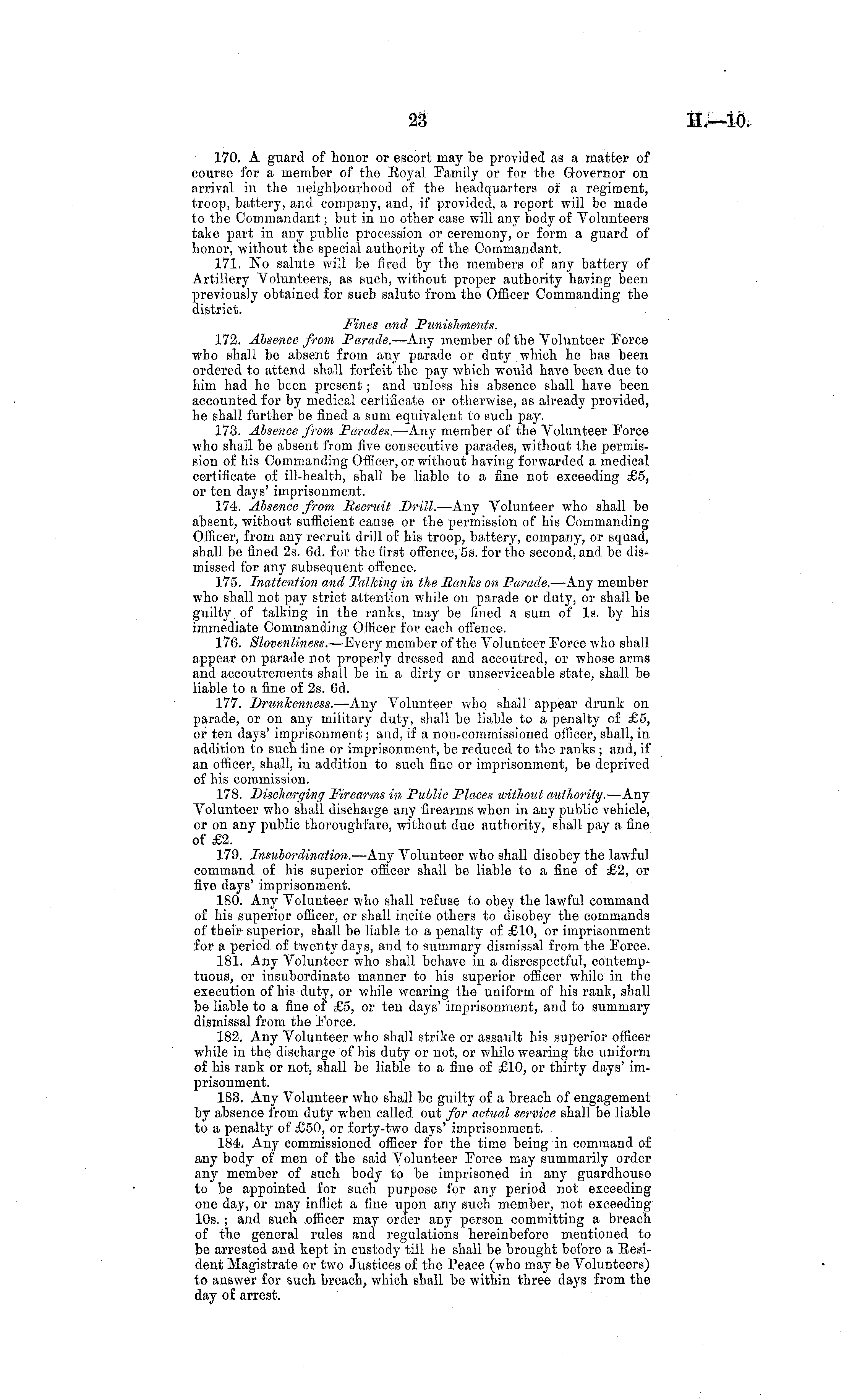 170. A guard of honor or escort may be provided as a matter of course for a member of the Royal Family or for the Governor on arrival in the neighbourhood of the headquarters of a regiment, troop, battery, and company, and, if provided, a report will be made to the Commandant; but in no other case will any body of Volunteers take part in any public procession or ceremony, or form a guard of honor, without the special authority of the Commandant. 171. No salute will be fired by the members of any battery of Artillery Volunteers, as such, without proper authority having been previously obtained for such salute from the Officer Commanding the district. Fines and Punishments. 172. Absence from Parade. —Any member of the Volunteer Force who shall be absent from any parade or duty which he has been ordered to attend shall forfeit the pay which would have been due to him had he been present; and unless his absence shall have been accounted for by medical certificate or otherwise, as already provided, he shall further be fined a sum equivalent to such pay. 173. Absence from Parades. —Any member of the Volunteer Force who shall be absent from five consecutive parades, without the permission of his Commanding Officer, or without having forwarded a medical certificate of ill-health, shall be liable to a fine not exceeding £5, or ten days' imprisonment. 174. Absence from Pecruit Drill.- —Any Volunteer who shall be absent, without sufficient cause or the permission of his Commanding Officer, from any recruit drill of his troop, battery, company, or squad, shall be fined 2s. 6d. for the first offence, ss. for the second, and be dismissed for any subsequent offence. 175. Inattention and Talking in the Panics on Parade. —Any member who shall not pay strict attention while on parade or duty, or shall be guilty of talking in the ranks, may be fined a sum of Is. by his immediate Commanding Officer for each offence. 176. Slovenliness. —Every member of the Volunteer Force who shall appear on parade not properly dressed and accoutred, or whose arms and accoutrements shall be in a dirty or unserviceable state, shall be liable to a fine of 2s. 6d. 177. Drunkenness. —Any Volunteer who shall appear drunk on parade, or on any military duty, shall be liable to a penalty of £5, or ten days' imprisonment; and, if a non-commissioned officer, shall, in addition to such fine or imprisonment, be reduced to the ranks ; and, if an officer, shall, in addition to such fine or imprisonment, be deprived of his commission. 178. Discharging Firearms in Public Places without authority.—Nay Volunteer who shall discharge any firearms when in any public vehicle, or on any public thoroughfare, without due authority, shall pay a fine of £2. 179. Insubordination. —Any Volunteer who shall disobey the lawful command of his superior officer shall be liable to a fine of £2, or five days' imprisonment. 180. Any Volunteer who shall refuse to obey the lawful command of his superior officer, or shall incite others to disobey the commands of their superior, shall be liable to a penalty of £10, or imprisonment for a period of twenty days, and to summary dismissal from the Force. 181. Any Volunteer who shall behave in a disrespectful, contemptuous, or insubordinate manner to his superior officer while in the execution of his duty, or while wearing the uniform of his rank, shall be liable to a fine of £5, or ten days' imprisonment, and to summarydismissal from the Force. 182. Any Volunteer who shall strike or assault his superior officer while in the discharge of his duty or not, or while wearing the uniform of his rank or not, shall be liable to a fine of £10, or thirty days' imprisonment. 183. Any Volunteer who shall be guilty of a breach of engagement by absence from duty when called out for actual service shall be liable to a penalty of £50, or forty-two days' imprisonment. 184. Any commissioned officer for the time being in command of any body of men of the said Volunteer Force may summarily order any member of such body to be imprisoned in any guardhouse to be appointed for such purpose for any period not exceeding one day, or may inflict a fine upon any such member, not exceeding 10s. ; and such .officer may order any person committing a breach of the general rules and regulations hereinbefore mentioned to be arrested and kept in custody till he shall be brought before a Resident Magistrate or two Justices of the Peace (who may be Volunteers) to answer for such breach, which shall be within three days from the day of arrest.
