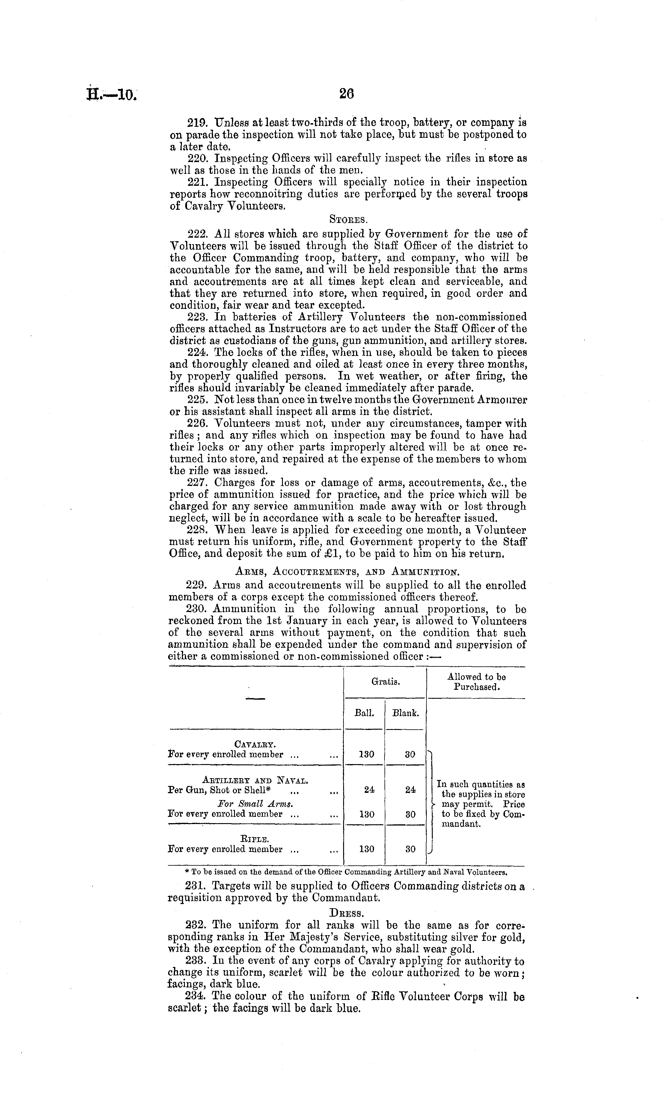 219. Unless at least two-thirds of the troop, battery, or company is on parade the inspection will not take place, but must be postponed to a later date. 220. Inspecting Officers will carefully inspect the rifles in store as well as those in the hands of the men. 221. Inspecting Officers will specially notice in their inspection reports how reconnoitring duties are performed by the several troops of Cavalry Volunteers. Stoees. 222. All stores which are supplied by Government for the use of Volunteers will be issued through the Staff Officer of the district to the Officer Commanding troop, battery, and company, who will be accountable for the same, and will be held responsible that the arms and accoutrements are at all times kept clean and serviceable, and that they are returned into store, when required, in good order and condition, fair wear and tear excepted. 223. In batteries of Artillery Volunteers the non-commissioned officers attached as Instructors are to act under the Staff Officer of the district as custodians of the guns, gun ammunition, and artillery stores. 224. The locks of the rifles, when in use, should be taken to pieces and thoroughly cleaned and oiled at least once in every three months, by properly qualified persons. In wet weather, or after firing, the rifles should invariably be cleaned immediately after parade. 225. Not less than once in twelve months the Government Armourer or his assistant shall inspect all arms in the district. 226. Volunteers must not, under any circumstances, tamper with rifles ; and any rifles which on inspection may be found to have had their locks or any other parts improperly altered will be at once returned into store, and repaired at the expense of the members to whom the rifle was issued. 227. Charges for loss or damage of arms, accoutrements, &c, the price of ammunition issued for practice, and the price which will be charged for any service ammunition made away with or lost through neglect, will be in accordance with a scale to be hereafter issued. 228. When leave is applied for exceeding one month, a Volunteer must return his uniform, rifle, and Government property to the Staff Office, and deposit the sum of £1, to be paid to him on his return. Aems, Accouteements, and Ammunition. 229. Arms and accoutrements will be supplied to all the enrolled members of a corps except the commissioned officers thereof. 230. Ammunition in the following annual proportions, to be reckoned from the Ist January in each year, is allowed to Volunteers of the several arms without payment, on the condition that such ammunition shall be expended under the command and supervision of either a commissioned or non-commissioned officer :—