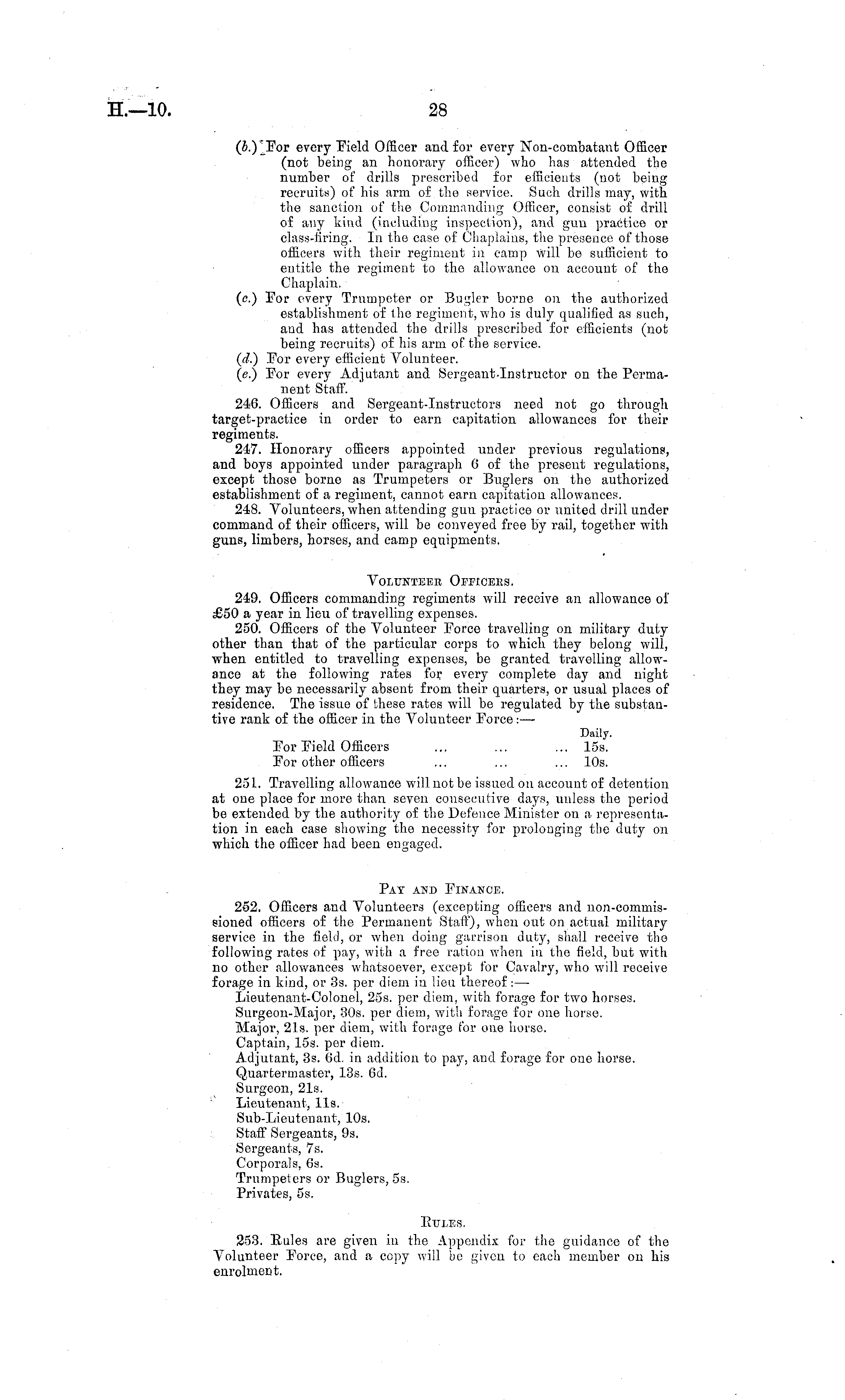 (b.) For every Field Officer and for every Non-combatant Officer (not being an honorary officer) who has attended the number of drills prescribed for efficients (not being recruits) of his arm of the service. Such drills may, with the sanction of the Commanding Officer, consist of drill of any kind (including inspection), and gun practice or class-firing. In the case of Chaplains, the presence of those officers with their regiment in camp will be sufficient to entitle the regiment to the allowance on account of the Chaplain. (c.) For every Trumpeter or Bugler borne on the authorized establishment of the regiment, who is duly qualified as such, and has attended the drills prescribed for efficients (not being recruits) of his arm of the service. ((".) For every efficient Volunteer. (e.) For every Adjutant and Sergeant-Instructor on the Permanent Staff. 246. Officers and Sergeant-Instructors need not go through target-practice in order to earn capitation allowances for their regiments. 247. Honorary officers appointed under previous regulations, and boys appointed under paragraph 6 of the present regulations, except those borne as Trumpeters or Buglers on the authorized establishment of a regiment, cannot earn capitation allowances. 248. Volunteers, when attending gun practice or united drill under command of their officers, will be conveyed free by rail, together with guns, limbers, horses, and camp equipments. VOLUNTEEE OeEICEES. 249. Officers commanding regiments will receive an allowance of £50 a year in lieu of travelling expenses. 250. Officers of the Volunteer Force travelling on military duty other than that of the particular corps to which they belong will, when entitled to travelling expenses, be granted travelling allowance at the following rates for every complete day and night they may be necessarily absent from their quarters, or usual places of residence. The issue of these rates will be regulated by the substantive rank of the officer in the Volunteer Force:— Daily. For Field Officers ... ... ... 15s. For other officers ... ... ... 10s. 251. Travelling allowance will not be issued on account of detention at one place for more than seven consecutive days, unless the period be extended by the authority of the Defence Minister on a representation in each case showing the necessity for prolonging the duty on which the officer had been engaged. Pat amd Finance. 252. Officers and Volunteers (excepting officers and non-commis-sioned officers of the Permanent Staff), when out on actual military service in the field, or when doing garrison duty, shall receive the following rates of pay, with a free ration when in the field, but with no other allowances whatsoever, except for Cavalry, who will receive forage in kind, or 3s. per diem in lieu thereof: — Lieutenant-Colonel, 255. per diem, with forage for two horses. Surgeon-Major, 30s. per diem, with forage for one horse. Major, 21s. per diem, with forage for one horse. Captain, 15s. per diem. Adjutant, 3s. 6d. in addition to pay, and forage for one horse. Quartermaster, 13s. 6d. Surgeon, 21s. Lieutenant, lis. Sub-Lieutenant, 10s. Staff Sergeants, 9s. Sergeants, 7s. Corporals, 6s. Trumpeters or Buglers, ss. Privates, ss. Rules. 253. Rules are given in the Appendix for the guidance of the Volunteer Force, and a copy will be given to each member on his enrolment.