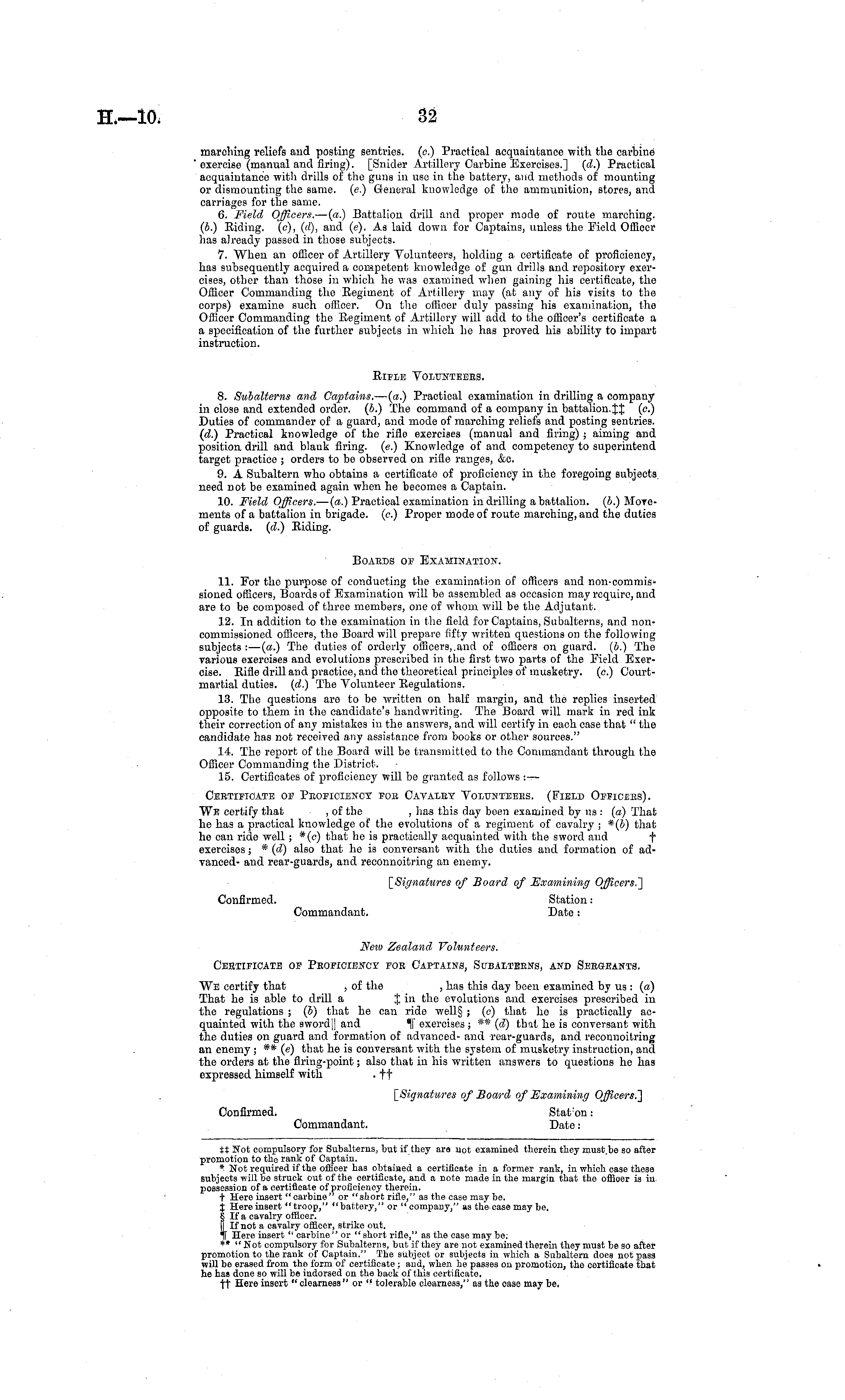marching reliefs and posting sentries, (c.) Practical acquaintance with the carbine ' exercise (manual and firing). [Snider Artillery Carbine Exercises.] (d.) Practical acquaintance with drills of the guns in use in the battery, and methods of mounting or dismounting the same, (e.) General knowledge of the ammunition, stores, and carriages for the same. 6. Field Officers. — (a.) Battalion drill and proper mode of route marching. (b.) Riding, (e), (d), and (e). As laid down for Captains, unless the Field Officer has already passed in those subjects. 7. When an officer of Artillery Volunteers, holding a certificate of proficiency, has subsequently acquired a competent knowledge of gun drills and repository exercises, other than those in which he was examined when gaining his certificate, the Officer Commanding the Regiment of Artillery may (at any of his visits to the corps) examine Buch officer. On the officer duly passing his examination, the Officer Commanding the Regiment of Artillery will add to the officer's certificate a a specification of the further subjects in which he has proved his ability to impart instruction. Rifle Volunteees. 8. Subalterns and Captains. — (a.) Practical examination in drilling a company in close and extended order, (b.) The command of a company in battalion. J J (c.) Duties of commander of a guard, and mode of marching reliefs and posting sentries. (d.) Practical knowledge of the rifle exercises (manual and firing); aiming and position drill and blank firing, (e.) Knowledge of and competency to superintend target practice ; orders to be observed on rifle ranges, &c. 9. A Subaltern who obtains a certificate of proficiency in the foregoing subjects. need not be examined again when he becomes a Captain. 10. Field Officers. — (a.) Practical examination in drilling a battalion, (6.) Movements of a battalion in brigade, (c.) Proper mode of route marching, and the duties of guards, (d.) Riding. Boaeds oe Examination. 11. For the purpose of conducting the examination of officers and non-commis-sioned officers, Boards of Examination will be assembled as occasion may require, and are to be composed of three members, one of whom will be the Adjutant. 12. In addition to the examination in the field for Captains, Subalterns, and noncommissioned officers, the Board will prepare fifty written questions on the following subjects :— (a.) The duties of orderly officers, and of officers on guard, (b.) The variouß exercises and evolutions prescribed in the first two parts of the Field Exercise. Rifle drill and practice, and the theoretical principles of musketry, (c.) Courtmartial duties, (d.) The Volunteer Regulations. 13. The questions are to be written on half margin, and the replies inserted opposite to them in the candidate's handwriting. The Board will mark in red ink their correction of any mistakes in the answers, and will certify in each case that " the candidate has not received any assistance from books or other sources." 14. The report of the Board will be transmitted to the Commandant through the Officer Commanding the District. 15. Certificates of proficiency will be granted as follows :— Ceetieicate oe Peoeiciency eoe Cavalby Volunteees. (Field Oeeicebs). We certify that , of the , has this day been examined by us : («) That he has a practical knowledge of the evolutions of a regiment of cavalry ; *(b) that he can ride well; *(c) that he is practically acquainted with the sword and f exercises; * (d) also that he is conversant with the duties and formation of advanced- and rear-guards, and reconnoitring an enemy. [Signatures of Board of Examining Officers. .] Confirmed. Station: Commandant. Date: New Zealand Volunteers. Ceetieicate oe Peoeiciency toe Captains, Subalteens, and Seeo-eants. We certify that , of the , has this day been examined by us: (a) That he is able to drill a % in the evolutions and exercises prescribed in the regulations ; (b) that he can ride well§ ; (c) that he is practically acquainted with the sword 1| and % exercises ; ** (<?) that he is conversant with the duties on guard and formation of advanced- and rear-guards, and reconnoitring an enemy ; ** (e) that he is conversant with the system of musketry instruction, and the orders at the firing-point; also that in his written answers to questions he has expressed himself with . ft \_Signatures of Board of Examining Officers.'} Confirmed. Station: Commandant. Date: