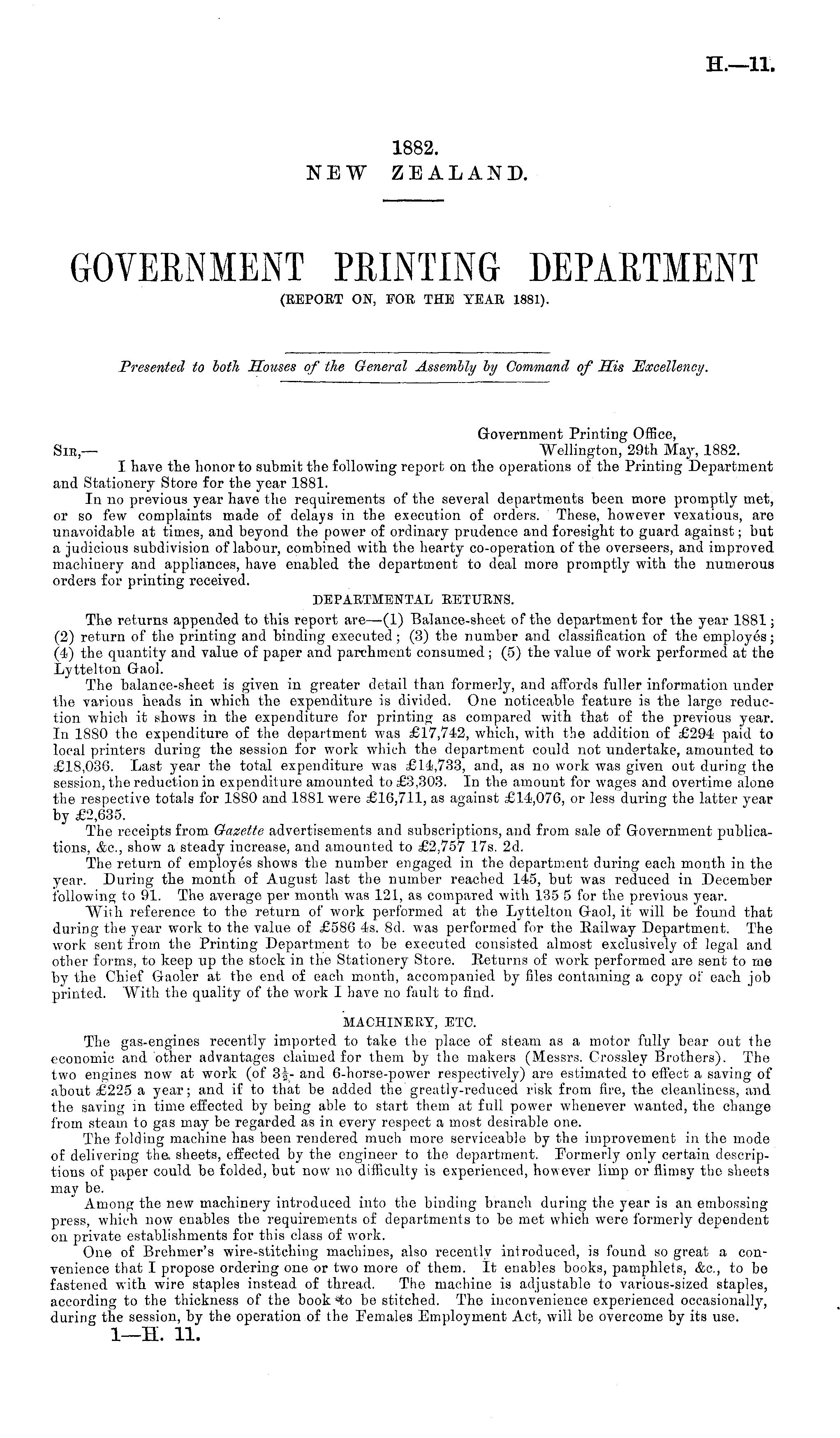 GOVERNMENT PRINTING DEPARTMENT (REPORT ON, FOR THE YEAR 1881).