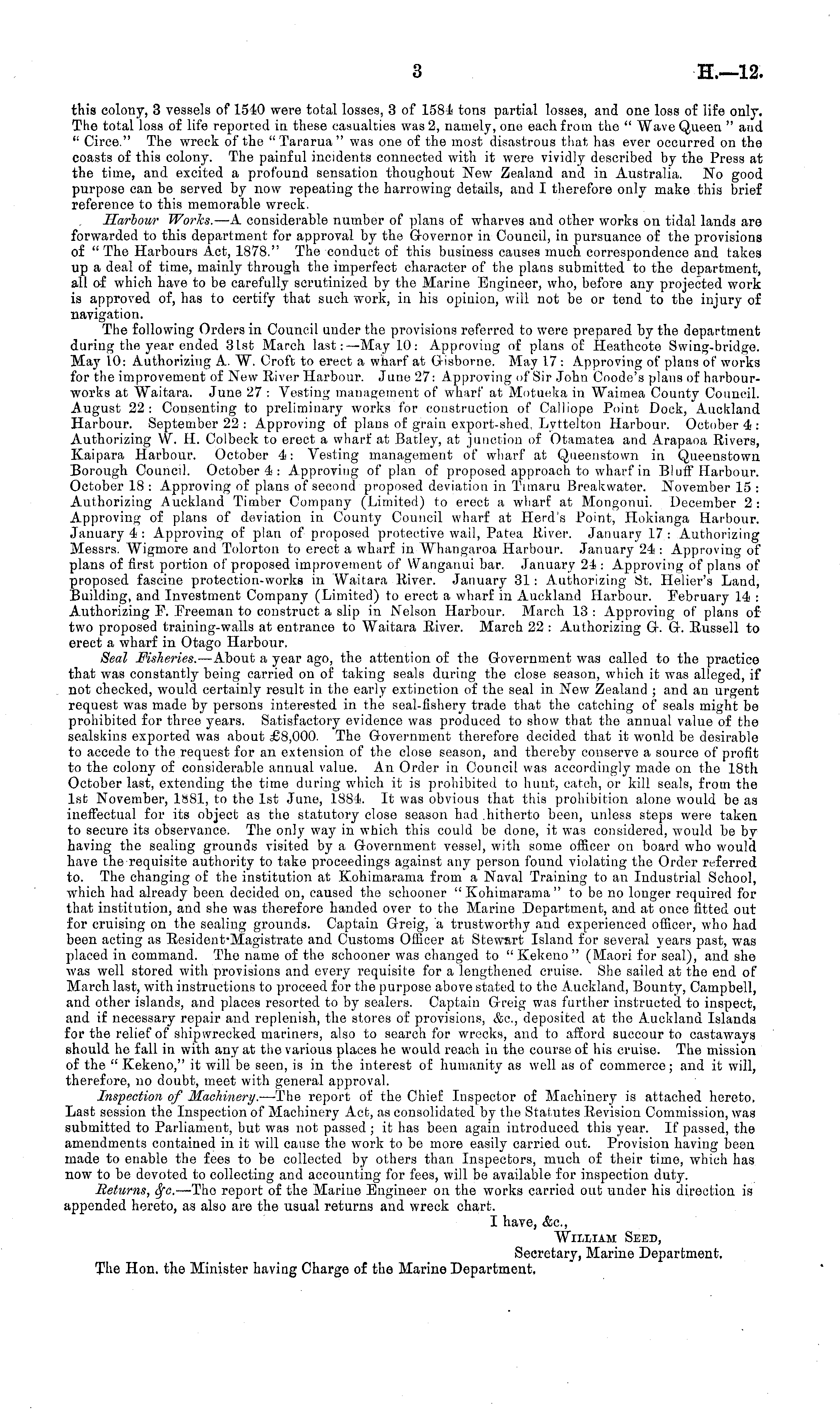 this colony, 3 vessels of 1540 were total losses, 3 of 1584 tons partial losses, and one loss of life only. The total loss of life reported in these casualties was 2, namely, one each from the " Wave Queen " and " Circe." The wreck of the "Tararua" was one of the most disastrous that has ever occurred on the coasts of this colony. The painful incidents connected with it were vividly described by the Press at the time, and excited a profound sensation thoughout New Zealand and in Australia. No good purpose can be served by now repeating the harrowing details, and I therefore only make this brief reference to this memorable wreck. Harbour Works. —-A considerable number of plans of wharves and other works on tidal lands are forwarded to this department for approval by the Governor in Council, in pursuance of the provisions of "The Harbours Act, 1878." The conduct of this business causes much correspondence and takes up a deal of time, mainly through the imperfect character of the plans submitted to the department, all of which have to be carefully scrutinized by the Marine Engineer, who, before any projected work is approved of, has to certify that such work, in his opinion, will not be or tend to the injury of navigation. The following Orders in Council under the provisions referred to were prepared by the department during the year ended 3lst March last: —May 10: Approving of plans of Heathcote Swing-bridge. May 10: Authorizing A. W. Croft to erect a wharf at Gisborne. May 17 : Approving of plans of works for the improvement of New River Harbour. June 27: Approving of Sir John Coode's plans of harbourworks at Waitara. June 27 : Vesting management of wharf at Motueka in Waimea County Council. August 22: Consenting to preliminary works for construction of Calliope Point Dock, Auckland Harbour. September 22 : Approving of plans of grain export-shed, Lyttelton Harbour. October 4<: Authorizing W. H. Colbeck to erect a wharf at Batley, at junction of Otamatea and Arapaoa Rivers, Kaipara Harbour. October 4: Vesting management of wharf at Queenstown in Queenstown Borough Council. October 4 : Approving of plan of proposed approach to wharf in Bluff Harbour. October 18 : Approving of plans of second proposed deviation in Timaru Breakwater. November 15 : Authorizing Auckland Timber Company (Limited) to erect a wharf at Mongonui. December 2: Approving of plans of deviation in County Council wharf at Herd's Point, Hokianga Harbour. January 4 : Approving of plan of proposed protective wail, Patea River. January 17 : Authorizing Messrs. Wigmore and Tolorton to erect a wharf in Whangaroa Harbour. January 24 : Approving of plans of first portion of proposed improvement of Wanganui bar. January 24 : Approving of plans of proposed fascine protection-works in Waitara River. January 31 : Authorizing St. Helier's Land, Building, and Investment Company (Limited) to erect a wharf in Auckland Harbour. February 14 : Authorizing F. Freeman to construct a slip in Nelson Harbour. March 13 : Approving of plans of two proposed training-walls at entrance to Waitara River. March 22 : Authorizing G. G. Russell to erect a wharf in Otago Harbour. Seal Fisheries. —About a year ago, the attention of the Government was called to the practice that was constantly being carried on of taking seals during the close season, which it was alleged, if not checked, would certainly result in the early extinction of the seal in New Zealand ; and an urgent request was made by persons interested in the seal-fishery trade that the catching of seals might be prohibited for three years. Satisfactory evidence was produced to show that the annual value of the sealskins exported was about £8,000. The Government therefore decided that it wonld be desirable to accede to the request for an extension of the close season, and thereby conserve a source of profit to the colony of considerable annual value. An Order in Council was accordingly made on the 18th October last, extending the time during which it is prohibited to hunt, catch, or kill seals, from the Ist November, 1881, to the Ist June, 1884. It was obvious that this prohibition alone would be as ineffectual for its object as the statutory close season had .hitherto been, unless steps were taken to secure its observance. The only way in which this could be done, it was considered, would be by having the sealing grounds visited by a Government vessel, with some officer on board who would have the requisite authority to take proceedings against any person found violating the Order referred to. The changing of the institution at Kohimarama from a Naval Training to an Industrial School, which had already been decided on, caused the schooner "Kohimarama" to be no longer required for that institution, and she was therefore handed over to the Marino Department, and at once fitted out for cruising on the sealing grounds. Captain Greig, a trustworthy and experienced officer, who had been acting as Resident-Magistrate and Customs Officer at Stewnrt Island for several years past, was placed in command. The name of the schooner was changed to " Kekeno " (Maori for seal), and she was well stored with provisions and every requisite for a lengthened cruise. She sailed at the end of March last, with instructions to proceed for the purpose above stated to the Auckland, Bounty, Campbell, and other islands, and places resorted to by sealers. Captain Greig was further instructed to inspect, and if necessary repair and replenish, the stores of provisions, &c, deposited at the Auckland Islands for the relief of shipwrecked mariners, also to search for wrecks, and to afford succour to castaways should he fall in with any at the various places he would reach in the course of his cruise. The mission of the " Kekeno," it will be seen, is in the interest of humanity as well as of commerce; and it will, therefore, no doubt, meet with general approval. Inspection of Machinery. —The report of the Chief Inspector of