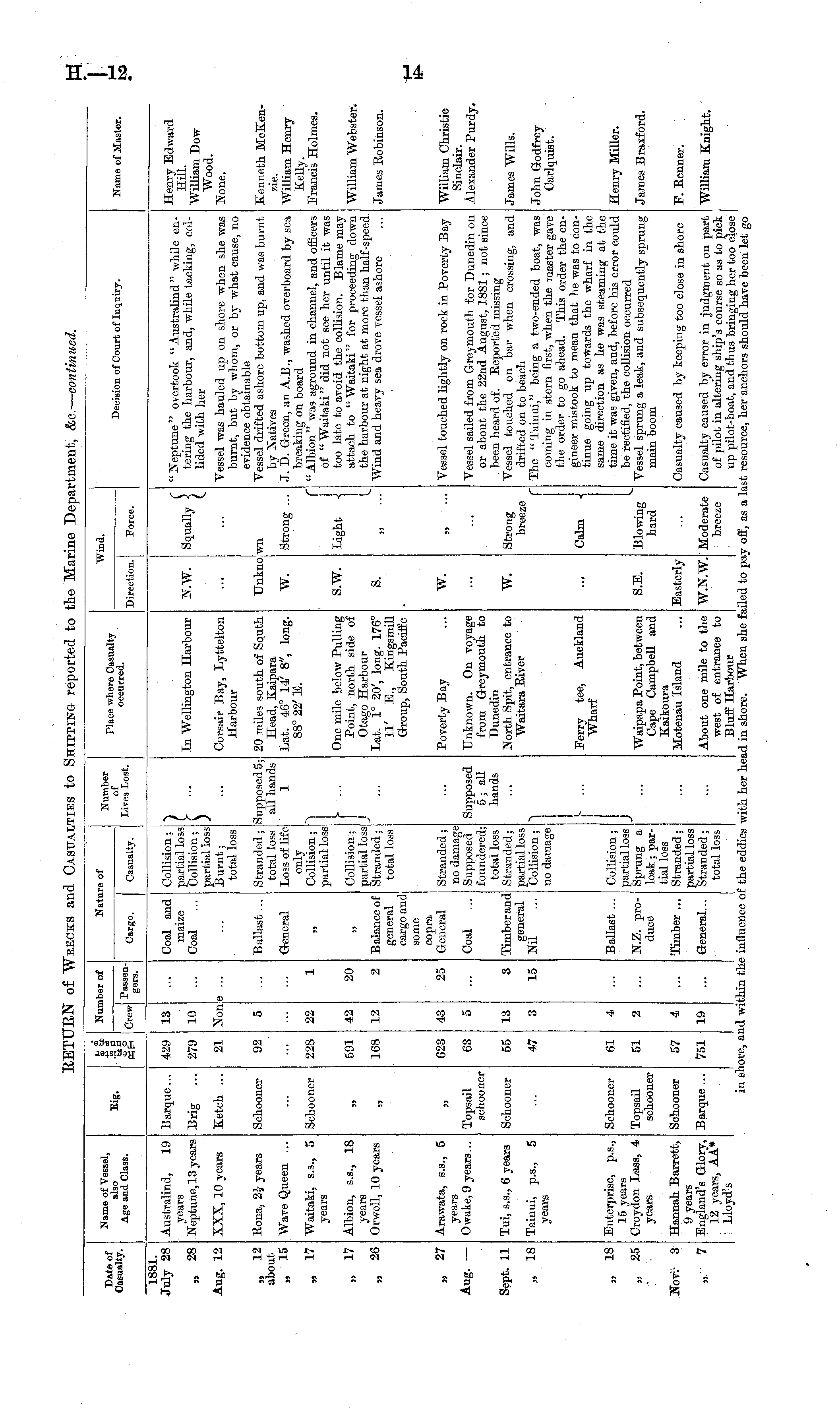 Name of Vessel, also Age and Class. E t£ .__ G Ntu iber of Nature of Number ind. I. Force. Date of Casualty. Rig. Place where Casualty occurred. Decision of Court of Inquiry. Name of Master. _ o Crew Passengers. Cargo. Casualty. Lives Lost. Direction. 1881. July 28 Australind, 19 years Neptune, 13 years Barque... 429 13 Coal and maize Coal ... Coal and Collision; maize partial loss Coal ... Collision; partial loss Burnt; total loss Henry Edward Hill. William Dow Wood. None. ,, 28 Brig ... 279 10 In Wellington Harbour N.W. Squally < "Neptune" overtook "Australind" while entering the harbour, and, while tacking, collided with her Aug. 12 XXX, 10 years Ketch ... 21 Non ,e ... Corsair Bay, Lyttelton Harbour Vessel was hauled up on shore when she was burnt, but by whom, or by what cause, no evidence obtainable Vessel drifted ashore bottom up, and was burnt by Natives J. D. Green, an A.B., washed overboard by sea breaking on board "Albion" was aground in channel, and officers of "Waitaki" did not see her until it was too late to avoid the collision. Blame may attach to "Waitaki" for proceeding down the harbour at night at more than half-speed Wind and heavy sea drove vessel ashore „ 12 about „ 15 Rona, 2i years Schooner 92 5 Ballast ... Ballast... Stranded; total loss General Loss of life only „ Collision; partial loss Supposed 5; all hands 1 20 miles south of South Head, Kaipara Lat. 46° 14' 8", long. 88° 22' E. Unknoi iwn Kenneth McKenzie. William Henry Kelly. Francis Holmes. Wave Queen ... General W. Strong ... ,, 17 Waitaki, s.s., 5 years Schooner 228 22 1 jj 1 ... J S.W. r Light -j „ 17 „ 26 Albion, s.s., 18 years Orwell, 10 years » 591 168 42 12 20 2 „ Collision; partial loss Balance of Stranded; general total loss cargo and SOTT1A Balance of general cargo and some One mile below Pulling Point, north side of Otago Harbour Lat. 1° 20', long. 176° 11' E., Kingsmill Group, South Pacific s. William Webster. James Robinson. » - Arawata, s.s., 5 j, some copra General Stranded; no damage Coal ... Supposed foundered; total loss Timber and Stranded; general partial loss Nil ... Collision; no damage copra General Poverty Bay w. Vessel touched lightly on rock in Poverty Bay William Christie Sinclair. Alexander Purdy, „ 27 623 ■13 25 years Owake, 9 years... „ Aug. — Topsail schooner 63 o Coal ... Supposed 5; all hands Unknown. On voyage from Greymouth to Dunedin North Spit, entrance to Waitara River Vessel sailed from Greymouth for Dunedin on or about the 22nd August, 1881; not since . been heard of. Reported missing Vessel touched on bar when crossing, and drifted on to beach The " Tainui," being a two-ended boat, was coming in stern first, when the master gave the order to go ahead. This order the engineer mistook to mean that he was to continue going up towards the wharf in the same direction as he was steaming at the time it was given, and, before his error could be rectified, the collision occurred Vessel sprung a leak, and subsequently sprung main boom Sept. 11 Tui, s.s., 6 years Schooner 55 13 3 Timber and general Nil w. Strong breeze James Wills. ,. 18 Tainui, p.s., 5 year3 47 3 15 . Calm -{ John Godfrey Carlquist. Enterprise, p.s., 15 years Croydon Lass, 4 years Ballast ... Collision ; partial loss N.Z. pro- Sprung a duce leak; partial loss Timber ... Stranded; partial loss General... Stranded; total loss Ferry tee, Auckland Wharf „ 18 Schooner Henry Miller. 61 4 S.E. „ 25 Topsail schooner 51 2 Waipapa Point, between Cape Campbell and Kaikoura Motenau Island Blowing hard James Braxford. Nov. 3 Hannah Barrett, 9 years England's Glory, 12 years, AA* : Lloyd's Schooner 57 4 Easterly Casualty caused by keeping too close in shore F. Renner. ,„" 7 Barque ... 751 19 About one mile to the west of entrance to Bluff Harbour id in shore. When she fi W.N.W. Moderate : breeze Casualty caused by error in judgment on part of pilot in altering ship's course so as to pick up pilot-boat, and thus bringing her too close ist resource, her anchors should have been let go William Knight. in si ithin th< influence of the eddies with, her he. iled to pa ty off, as a la tore, ai