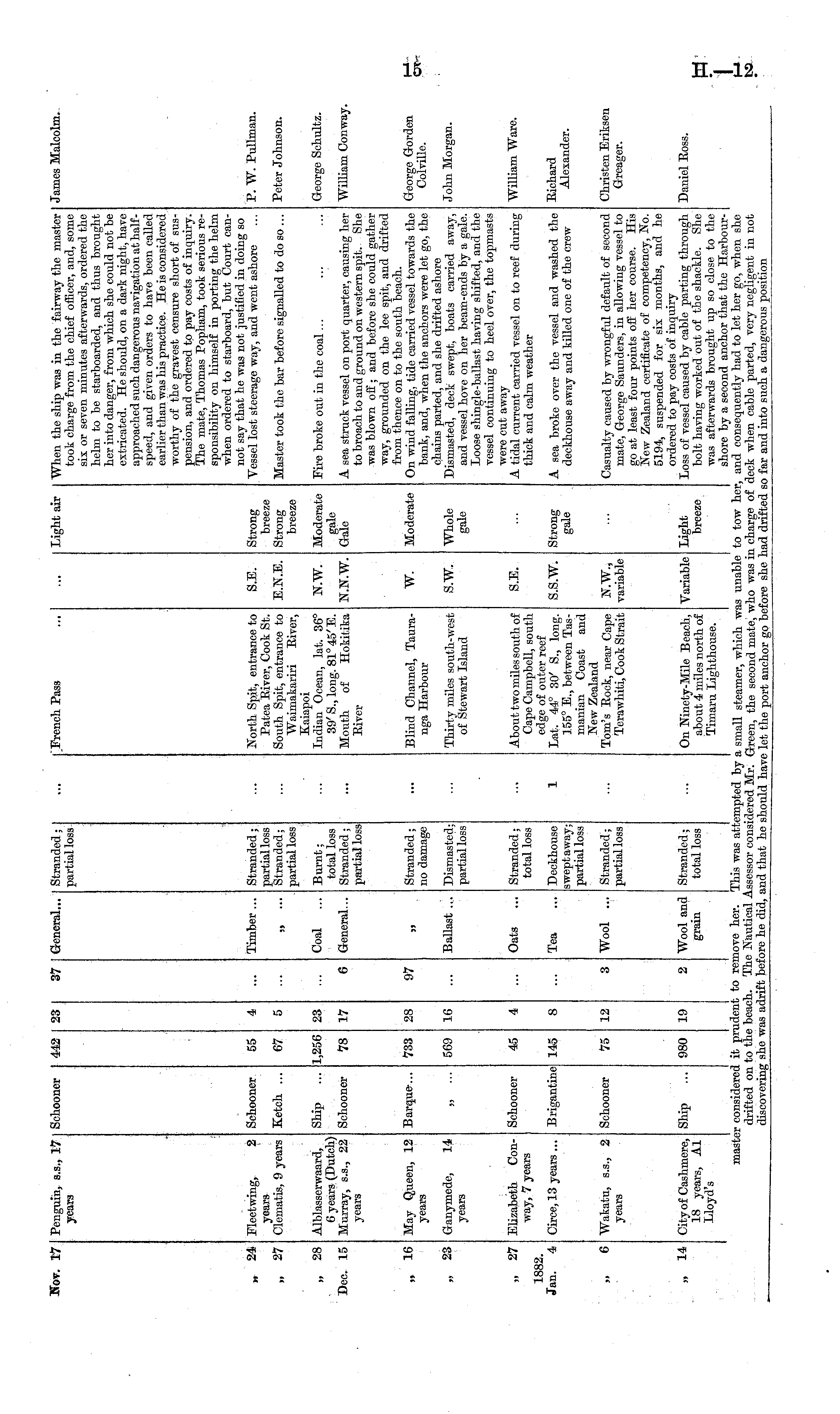 Kb v. 17 Penguin, s.s., 17 years Schooner 23 37 General... Stranded; partial loss ['French Pass Light air When the ship was in the fairway the master took charge from the chief officer, and, some six or seven minutes afterwards, ordered the helm to be starboarded, and thus brought her into danger, from which she could not be extricated. He should, on a dark night, have approached such dangerous navigation at halfspeed, and given orders to have been called earlier than was his practice. He is considered worthy of the gravest censure short of suspension, and ordered to pay costs of inquiry. The mate, Thomas Popham, took serious responsibility on himself in porting the helm when ordered to starboard, but Court cannot say that he was not justified in doing so Vessel lost steerage way, and went ashore James Malcolm., Fleetwing, 2 years Clematis, 9 years Schooner 55 4 ... Timber... Stranded; partial loss Ketch ... 67 5 ... „ ... Stranded; partial loss P. W. Pullman. „ 24 Schooner 55 4 Timber ... North Spit, entrance to S.E. Patea River, Cook St. South Spit, entrance to E.N.E. Waimakariri River, Kaiapoi Indian Ocean, lat. 36° N.W. 39' S., long. 81° 45' E. Mouth of Hokitika N.N.W. River S.E. Strong breeze „ 27 Ketch ... 67 5 „ E.N.E. Strong breeze Master took the bar before signalled to do so ... Peter Johnson. „ 28 Alblasserwaard, 6 years (Dutch) Murray, s.s., 22 years Ship ... 1,256 23 ... Coal ... Burnt; total loss Schooner 78 17 6 General... Stranded; partial loss Ship ... 1,256 23 Coal ... N.W. Moderate gale Gale Fire broke out in the coal... George Schultz. Dec. 15 Schooner 78 17 6 General... N.N.W. A sea struck vessel on port quarter, causing her to broach to and ground on western spit. She was blown off; and before she could gather way, grounded on the lee spit, and drifted from thence on to the south beach. On wind falling, tide carried vessel towards the bank, and, when the anchors were let go, the chains parted, and she drifted ashore Dismasted, deck swept, boats carried away, and vessel hove on her beam-ends by a gale. Loose shingle-ballast having shifted, and the vessel continuing to heel over, the topmasts were cut away A tidal current carried vessel on to reef during thick and calm weather William Conway. „ 16 May Queen, 12 years Barque-... 733 28 97 „ Stranded; no damage Barque-... 733 97 Blind Channel, Taura- W. nga Harbour W. Moderate George Gordon Colville. » „ 23 Ganymede, 14 years „ ... 569 16 ... Ballast .... Dismasted; partial loss jj 569 Thirty miles south-west S.W. of Stewart Island S.W. Whole gale John Morgan. 16 Ballast .... „ 27 Elizabeth Conway, 7 years i Schooner 45 4 ... Oats ... Stranded; total loss Schooner Oats About two miles south of S.E. Cape Campbell, south edge of outer reef 1 Lat. 44° 30' S., long. S.S.W. 155° E., between Tasmanian Coast and New Zealand Tom's Rock, near Cape N.W., Terawhiti, Cook Strait variable William Ware. 45 S.E. 1882. Jan. 4 Circe, 13 years... Brigantine 145 8 ... Tea ... Deckhouse swept away; partial loss Brigantine 145 Tea 1 S.S.W. Strong gale A sea broke over the vessel and washed the deckhouse away and killed one of the crew Richard Alexander. „ 6 Wakatu, s.s., 2 years Schooner Wool ... N.W., variable Casualty caused by wrongful default of second mate, George Saunders, in allowing vessel to go at least four points off her course. His New Zealand certificate of competency, No. 5194, suspended for six months, and he ordered to pay costs of inquiry Loss of vessel caused by cable parting through bolt having worked out of the shackle. She was afterwards brought up so close to the shore by a second anchor that the Harbour- ', and consequently had to let her go, when she deck when cable parted, very negligent in not io far and into such a dangerous position Christen Eriksen Greager. Schooner 75 12 3 Wool ... Stranded; partial loss 75 12 j, 14 City of Cashmere, 18 years, Al Lloyd's Ship ... 980 19 2 Wool and Stranded; grain total loss 980 19 On Ninety-Mile Beach, Variable about 4 miles north of Timaru Lighthouse. Light breeze Daniel Ross. maste I I I I I I I ir considered it prudent to remove her. This was at. drifted on to the beach. The Nautical Assessor consi discovering she was adrift before he did, and that he empted by a small steamer, which was unable :dered Mr. Green, the second mate, who was ii should have let the port anchor go before she 1 to tow hei i charge of tad drifted s