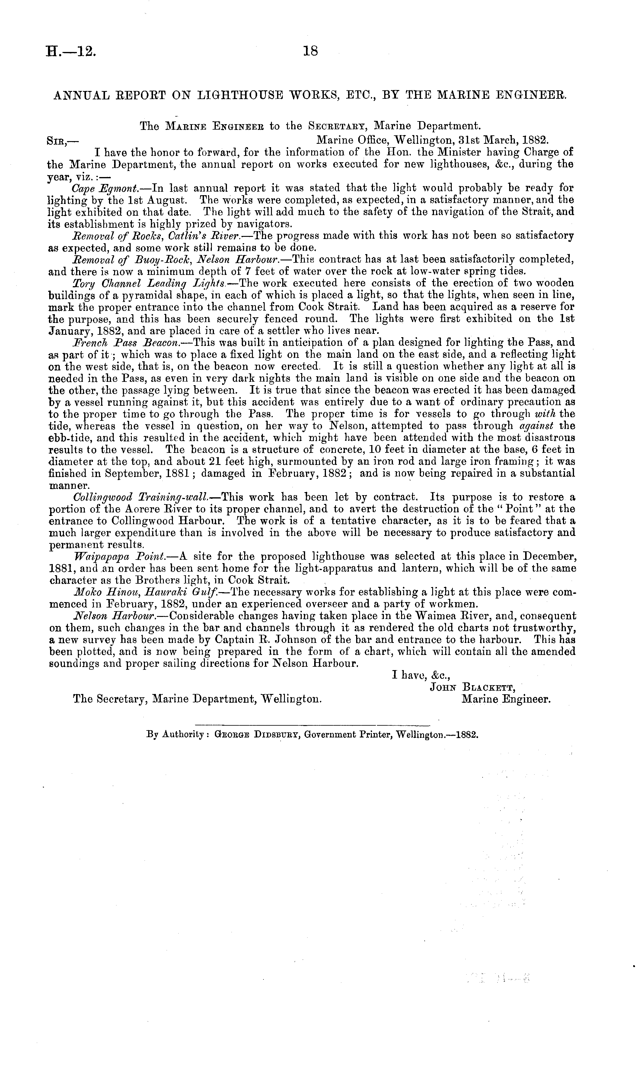 ANNUAL REPORT ON LIGHTHOUSE WORKS, ETC., BT THE MARINE ENGINEER. The Marine Engineer to the Secretary, Marine Department. Sir,— Marine Office, Wellington, 31st March, 1882. I have the honor to forward, for the information of the Hon. the Minister having Charge of the Marine Department, the annual report on works executed for new lighthouses, &c, during the year, viz.: — Cape Fgmont. —In last annual report it was stated that the light would probably be ready for lighting by the Ist August. The works were completed, as expected, in a satisfactory manner, and the light exhibited on that date. The light will add much to the safety of the navigation of the Strait, and its establishment is highly prized by navigators. Bemoval of Bocks, Catlin's Biver. —The progress made with this work has not been so satisfactory as expected, and some work still remains to be done. Bemoval of Buoy-Bock, Nelson Harbour. —This contract has at last been satisfactorily completed, and there is now a minimum depth of 7 feet of water over the rock at low-water spring tides. Tory Channel Leading Lights. —The work executed here consists of the erection of two wooden buildings of a pyramidal shape, in each of which is placed a light, so that the lights, when seen in line, mark the proper entrance into the channel from Cook Strait. Land has been acquired as a reserve for the purpose, and this has been securely fenced round. The lights were first exhibited on the Ist January, 1882, and are placed in care of a settler w;ho lives near. French Pass Beacon. —This was built in anticipation of a plan designed for lighting the Pass, and as part of it; which was to place a fixed light on the main land on the east side, and a reflecting light on the west side, that is, on the beacon now erected. It is still a question whether any light at all is needed in the Pass, as even in very dark nights the main land is visible on one side and. the beacon on the other, the passage lying between. It is true that since the beacon was erected it has been damaged by a vessel running against it, but this accident was entirely due to a want of ordinary precaution as to the proper time to go through the Pass. The proper time is for vessels to go through with the tide, whereas the vessel in question, on her way to Nelson, attempted to pass through against the ebb-tide, and this resulted in the accident, which might have been attended with the most disastrous results to the vessel. The beacon is a structure of concrete, 10 feet in diameter at the base, 6 feet in diameter at the top, and about 21 feet high, surmounted by an iron rod and large iron framing; it was finished in September, 1881; damaged in February, 1882; and is now being repaired in a substantial manner. Collingwood Training-wall. —This work has been let by contract. Its purpose is to restore a portion of the Aorere River to its proper channel, and to avert the destruction of the " Point" at the entrance to Collingwood Harbour. The work is of a tentative character, as it is to be feared that a much larger expenditure than is involved in the above will be necessary to produce satisfactory and permanent results. Waipapapa Point. —A site for the proposed lighthouse was selected at this place in December, 1881, and an order has been sent home for the light-apparatus and lantern, which will be of the same character as the Brothers light, in Cook Strait. Moko Hinou, Hauraki Gulf. —The necessary works for establishing a light at this place were commenced in February, 1882, under an experienced overseer and a party of workmen. Nelson Harbour. —Considerable changes having taken place in the Waimea River, and, consequent on them, such changes in the bar and channels through it as rendered the old charts not trustworthy, a new survey has been made by Captain R. Johnson of the bar and entrance to the harbour. This has been plotted, and is now being prepared in the form of a chart, which will contain all the amended soundings and proper sailing directions for Nelson Harbour. I have, &c, John Blackett, The Secretary, Marine Department, Wellington. Marine Engineer.