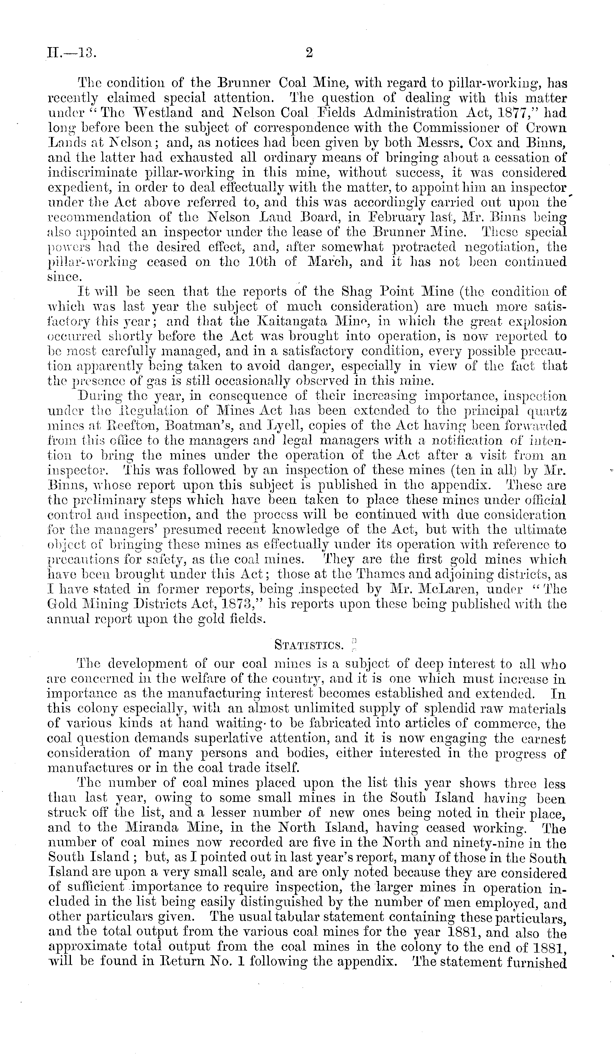 The condition of the Brunner Coal Mine, with regard to pillar-working, has recently claimed special attention. The question of dealing Avith this matter under " The Westland and Nelson Coal Melds Administration Act, 1877," had long before been the subject of correspondence with the Commissioner of Crown Lands at Kelson; and, as notices had been given by both Messrs. Cox and Binns, and the latter had exhausted all ordinary means of bringing about a cessation of indiscriminate pillar-working in this mine, without success, it was considered expedient, in order to deal effectually with the matter, to appoint him an inspector under the Act above referred to, and this was accordingly carried out upon the recommendation of the Nelson Land Board, in February last, Mr. Binns being also appointed an inspector under the lease of the Brunner Mine. These special ] lowers had the desired effect, and, after somewhat protracted negotiation, the pillar-working ceased on the 10th of March, and it has not been continued since. It will be seen that the reports of the Shag Point Mine (the condition of which was last year the subject of much consideration) are much more satisfactory this year; and that the Kaitangata Mine, in which the great explosion occurred shortly before the Act was brought into operation, is now reported to be most carefully managed, and in a satisfactory condition, every possible precaution apparently being taken to avoid danger, especially in view of the fact that the presence of gas is still occasionally observed in this mine. During the year, in consequence of their increasing importance, inspection under the Regulation of Mines Act has been extended to the principal quartz mines at Reef ton, Boatman's, and Lyell, copies of the Act having been forwarded from this office to the managers and legal managers with a notification of intention to bring the mines under the operation of the Act after a visit from an inspector. This was followed by an inspection of these mines (ten in all) by Mr. Binns, whose report upon this subject is published in the appendix. These are the preliminary steps which have been taken to place these mines under official control and inspection, and the process will be continued with due consideration for the managers' presumed recent knowledge of the Act, but with the ultimate object of bringing these mines as effectually under its operation with reference to precautions for safety, as the coal mines. They are the first gold mines which have been brought under this Act; those at the Thames and adjoining districts, as I have stated in former reports, being inspected by Mr. McLaren, under " The Gold Mining Districts Act, 1873," his reports upon these being published with the annual report upon the gold fields. Statistics. ° The development of our coal mines is a subject of deep interest to all who are concerned in the welfare of the country, and it is one which must increase in importance as the manufacturing interest becomes established and extended. In this colony especially, with an almost unlimited supply of splendid raw materials of various kinds at hand waiting- to be fabricated into articles of commerce, the coal question demands superlative attention, and it is now' engaging the earnest consideration of many persons and bodies, either interested in the progress of manufactures or in the coal trade itself. The number of coal mines placed upon the list this year shows three less than last year, owing to some small mines in the South Island having been struck off the list, and a lesser number of new ones being noted in their place, and to the Miranda Mine, in the North Island, having ceased working. The number of coal mines now recorded are five in the North and ninety-nine in the South Island ; but, as I pointed out in last year's report, many of those in the South Island are upon a very small scale, and are only noted because they are considered of sufficient importance to require inspection, the larger mines in operation included in the list being easily distinguished by the number of men employed, and other particulars given. The usual tabular statement containing these particulars, and the total output from the various coal mines for the year 1881, and also the approximate total output from the coal mines in the colony to the end of 1881, will be found in Return No. 1 following the appendix. The statement furnished