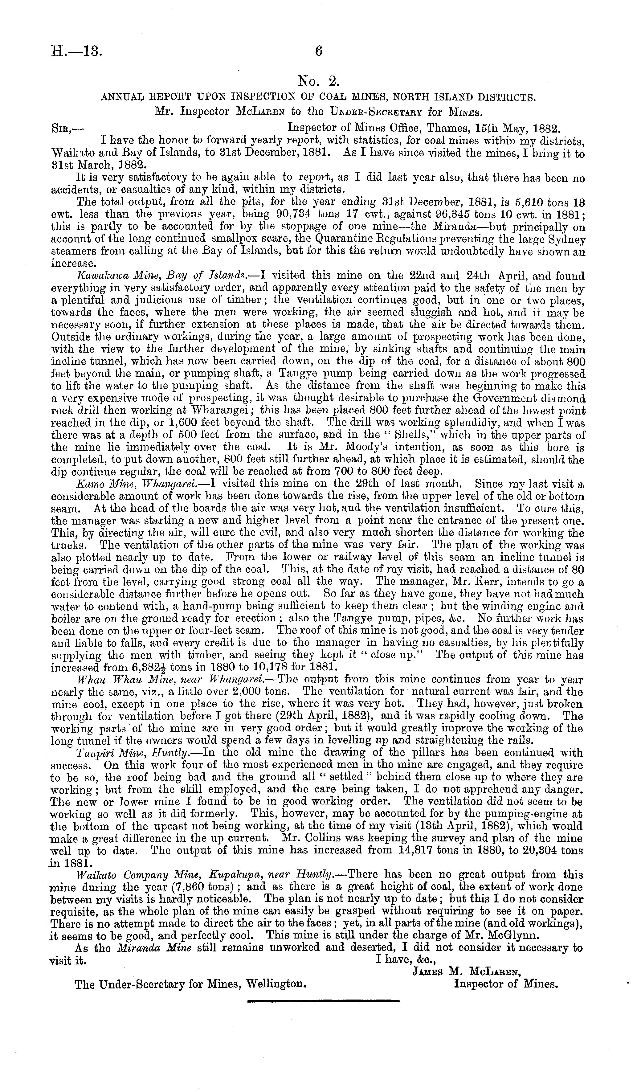 No. 2. ANNUAL REPORT UPON INSPECTION OF COAL MINES, NORTH ISLAND DISTRICTS. Mr. Inspector McLaren to the Under-Secretary for Mines. Sir,— Inspector of Mines Office, Thames, 15th May, 1882. I have the honor to forward yearly report, with statistics, for coal mines within my districts, Waikato and Bay of Islands, to 31st December, 1881. As I have since visited the mines, I bring it to 31st March, 1882. It is very satisfactory to be again able to report, as I did last year also, that there has been no accidents, or casualties of any kind, within my districts. The total output, from all the pits, for the year ending 31st December, 1881, is 5,610 tons 18 cwt. less than the previous year, being 90,734 tons 17 cwt., against 96,345 tons 10 cwt. in 1881; this is partly to be accounted for by the stoppage of one mine—the Miranda—but principally on account of the long continued smallpox scare, the Quarantine Begulations preventing the large Sydney steamers from calling at the Bay of Islands, but for this the return would undoubtedly have shown an increase. Eawakawa Mine, Bay of Islands. —I visited this mine on the 22nd and 24th April, and found everything in very satisfactory order, and apparently every attention paid to the safety of the men by a plentiful and judicious use of timber; the ventilation continues good, but in one or two places, towards the faces, where the men were working, the air seemed sluggish and hot, and it may be necessary soon, if further extension at these places is made, that the air be directed towards them. Outside the ordinary workings, during the year, a large amount of prospecting work has been done, with the view to the further development of the mine, by sinking shafts and continuing the main incline tunnel, which has now been carried down, on the dip of the coal, for a distance of about 800 feet beyond the main, or pumping shaft, a Tangye pump being carried down as the work progressed to lift the water to the pumping shaft. As the distance from the shaft was beginning to make this a very expensive mode of prospecting, it was thought desirable to purchase the Government diamond rock drill then working at Wharangei; this has been placed 800 feet further ahead of the lowest point reached in the dip, or 1,600 feet beyond the shaft. The drill was working splendidiy, and when I was there was at a depth of 500 feet from the surface, and in the " Shells," which in the upper parts of the mine lie immediately over the coal. It is Mr. Moody's intention, as soon as this bore is completed, to put down another, 800 feet still further ahead, at which place it is estimated, should the dip continue regular, the coal will be reached at from 700 to 800 feet deep. Kamo Mine, Whangarei. —l visited this mine on the 29th of last month. Since my last visit a considerable amount of work has been done towards the rise, from the upper level of the old or bottom seam. At the head of the boards the air was very hot, and the ventilation insufficient. To cure this, the manager was starting a new and higher level from a point near the entrance of the present one. This, by directing the air, will cure the evil, and also very much shorten the distance for working the trucks. The ventilation of the other parts of the mine was very fair. The plan of the working was also plotted nearly up to date. From the lower or railway level of this seam an incline tunnel is being carried down on the dip of the coal. This, at the date of my visit, had reached a distance of 80 feet from the level, carrying good strong coal all the way. The manager, Mr. Kerr, intends to go a considerable distance further before he opens out. So far as they have gone, they have not had much water to contend with, a hand-pump being sufficient to keep them clear ; but the winding engine and boiler are on the ground ready for erection ; also the Tangye pump, pipes, &c. No further work has been done on the upper or four-feet seam. The roof of this mine is not good, and the coal is very tender and liable to falls, and every credit is due to the manager in having no casualties, by his plentifully supplying the men with timber, and seeing they kept it " close up." The output of this mine has increased from 6,382^ tons in 1880 to 10,178 for 1881. Whau Whau Mine, near Whangarei. —The output from this mine continues from year to year nearly the same, viz., a little over 2,000 tons. The ventilation for natural current was fair, and the mine cool, except in one place to the rise, where it was very hot. They had, however, just broken through for ventilation before I got there (29th April, 1882), and it was rapidly cooling down. The working parts of the mine are in very good order; but it would greatly improve the working of the long tunnel if the owners would spend a few days in levelling up and straightening the rails. Taupiri Mine, Huntly. —ln the old mine the drawing of the pillars has been continued with success. On this work four of the most experienced men in the mine are engaged, and they require to be so, the roof being bad and the ground all " settled " behind them close up to where they are working ; but from the skill employed, and the care being taken, I do not apprehend any danger. The new or lower mine I found to be in good working order. The ventilation did not seem to be working so well as it did formerly. This, however, may be accounted for by the pumping-engine at the bottom of the upcast not being working, at the time of my visit (13th April, 1882), which would make a great difference in the up current. Mr. Collins was keeping the survey and plan of the mine well up to date. The output of this mine has increased from 14,817 tons in 1880, to 20,304 tons in 1881. Waikato Company Mine, Eupakupa, near Huntly. —There has been no great output from this mine during the year (7,860 tons) ; and as there is a great height of coal, the extent of work done between my visits is hardly noticeable. The plan is not nearly up to 