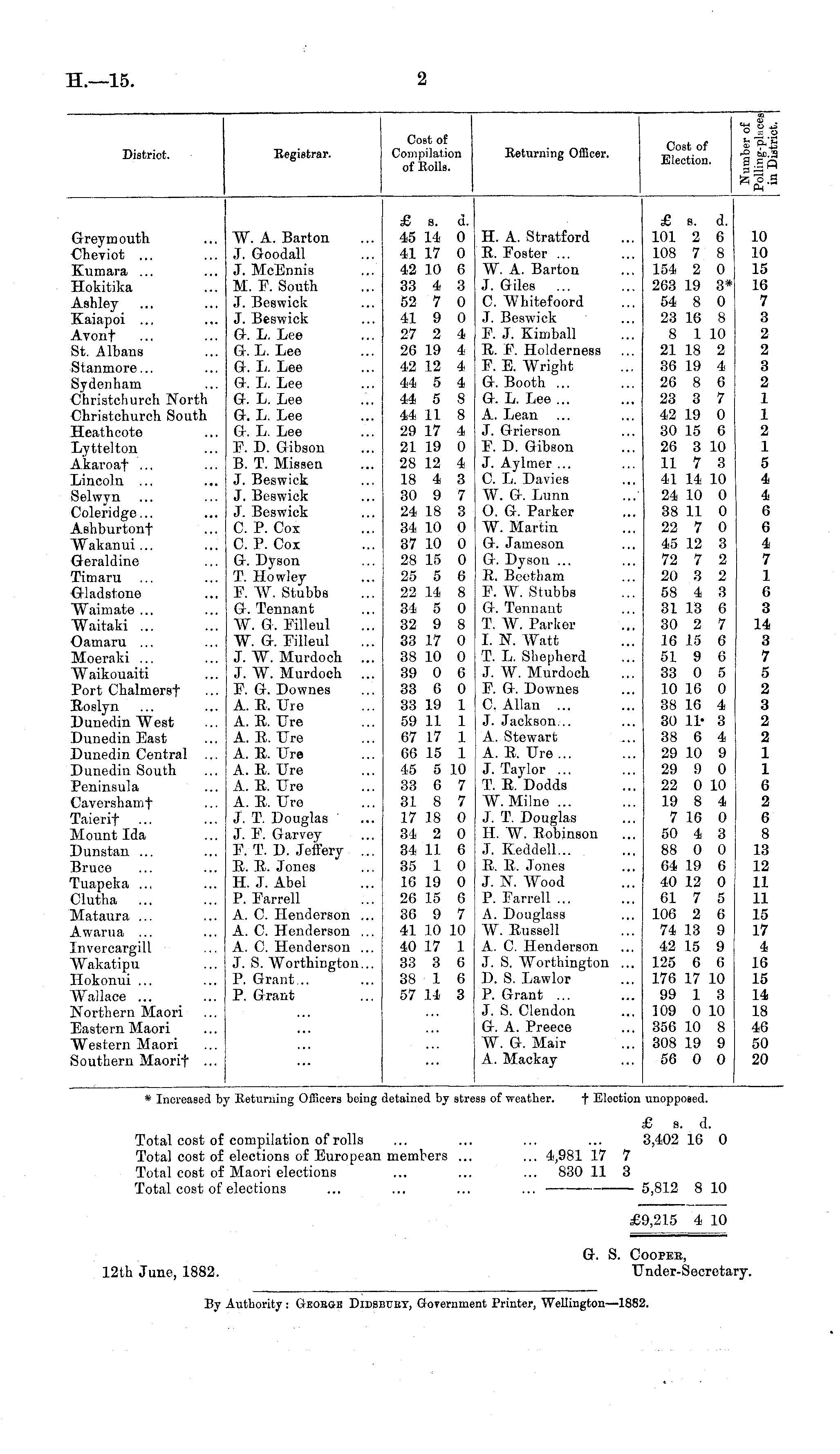 £ s. d. Total cost of compilation of rolls ... ... ... ... 3,402 16 0 Total cost of elections of European members ... ... 4,981 17 7 Total cost of Maori elections ... ... ... 830 11 3 Total cost of elections ... ... ... ... 5,812 8 10 £9,215 4 10 G. S. Cooper, 12th June, 1882. Under-Secretary.