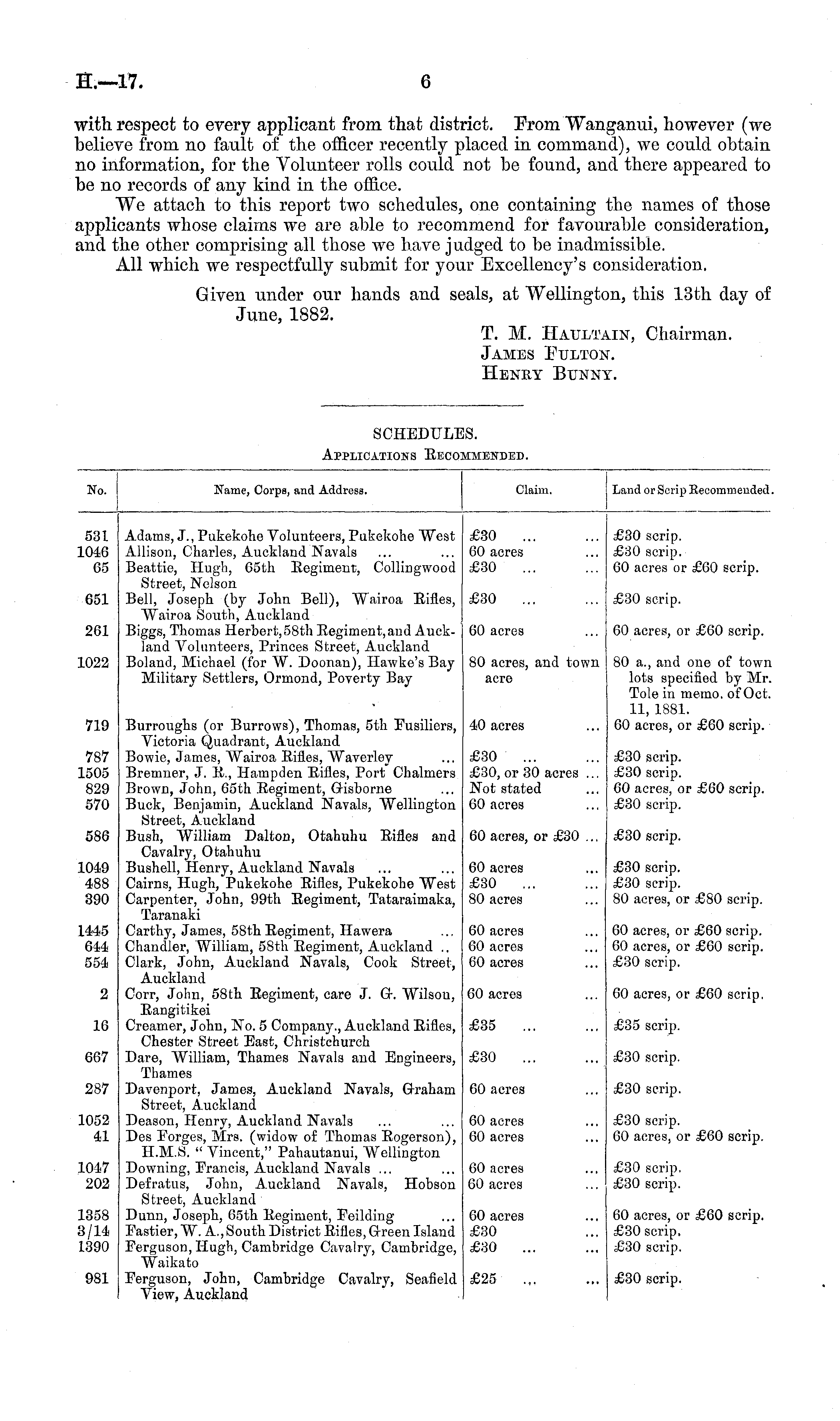 with respect to every applicant from that district. Erom Wanganui, however (we believe from no fault of the officer recently placed in command), we could obtain no information, for the Volunteer rolls could not be found, and there appeared to be no records of any kind in the office. We attach to this report two schedules, one containing the names of those applicants whose claims we are able to recommend for favourable consideration, and the other comprising all those we have judged to be inadmissible. All which we respectfully submit for your Excellency's consideration. Given under our hands and seals, at Wellington, this 13th day of June, 1882. T. M. Haultain, Chairman. James Eulton. Henry Bunny.