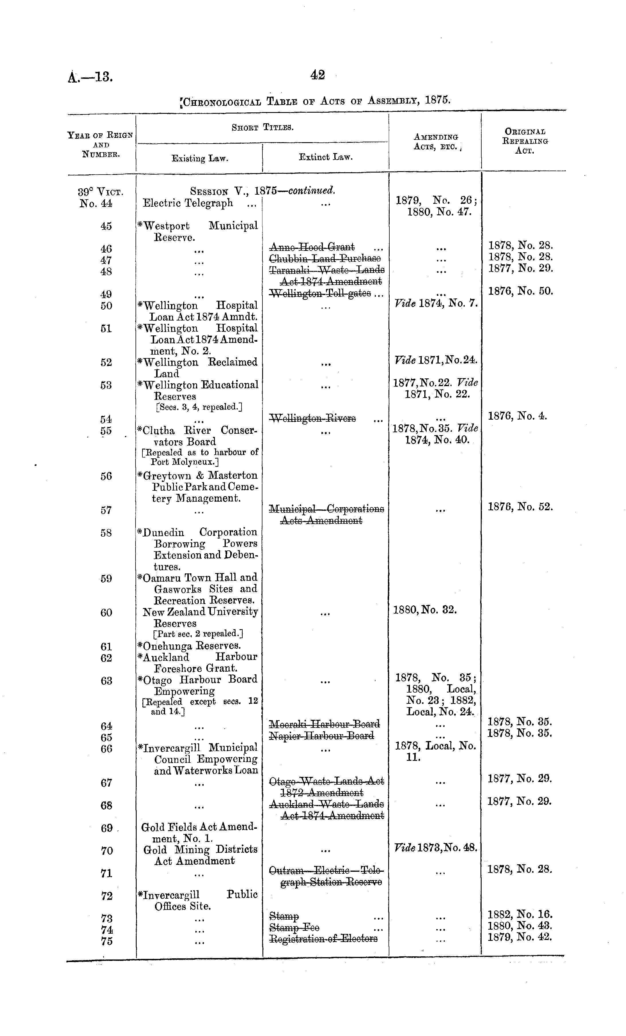 Shobt Titles. 'BAB OP KEIOffl AND NUMBEB. Amending Acts, etc. \ Oeiginai Repealing Aot. Existing Law. Extinct Law. 39° Vict. No. 44 Session V., li Electric Telegraph i75— continued. 1879, No. 26; 1880, No. 47. 45 *Westport Municipal lleserve. Aaae-IIood Grant Chubbin Laad-Jgafefeaee Steaaafei—^W-aste—Laads Act 1871-Amondmeat Toll-gates ... 46 47 48 1878, No. 28. 1878, No. 28. 1877, No. 29. 49 50 Vide 1874," No. 7. 1876, No. 50. 51 52 *'Wellington Hospital Loan Act 1874 Amndt. *Wellington Hospital Loan Act 1874 Amendment, No. 2. ♦Wellington Eeclaimed Land *Wellington Educational Reserves [Seca. 3, 4, repealed.] F^el871,No.24. 53 1877,No.22. Vide 1871, No. 22. 54 55 *Clutha River Conservators Board [Eepealed as to harbour of Port Molyneux.] *G-reytown & Masterton Public Parkand Cemetery Management. 1878,No.'35. Vide 1874, No. 40. 1876, No. 4. 56 M-aaieipal—<3«§ei#iea6 A-oto Ameadaeat 1876, No. 52. 57 58 *Dunedin Corporation Borrowing Powers Extension and Debentures. 59 *Oamaru Town Hall and Gasworks Sites and Recreation Reserves. New Zealand University Reserves [Part see. 2 repealed.] *Onehunga Reserves. *Auckland Harbour Foreshore Grant. *Otago Harbour Board Empowering [Eepealed except sees. 12 and 14.] 60 1880, No. 32. 61 62 1878, No. 35; 1880, Local, No. 23; 1882, Local, No. 24. 63 64 65 66 Meefatei Harbear-Jieafd Kapior Hnrbour Beard 1878, No. 35. 1878, No. 35. *Invercargill Municipal Council Empowering and Waterworks Loan 1878, Local, No. 11. 1877, No. 29. 67 68 Otago "Waoto Lando Act 1872 Ameafaeat Auokland-Waoto Landa Aot 1871 Amondmcnt 1877, No. 29. 69 70 Gold Fields Act Amendment, No. 1. Gold Mining Districts Act Amendment Fwfel873,No.48. 1878, No. 28. 71 Qatram Elootrio—5Pekgtapa Station Booorro 72 *Invercargill Public Offices Site. 1882, No. 16. 1880, No. 43. 1879, No. 42. 73 74 75 i_?Ltxiiiyj t ft ■ Begietratiea-ef Eloctoro