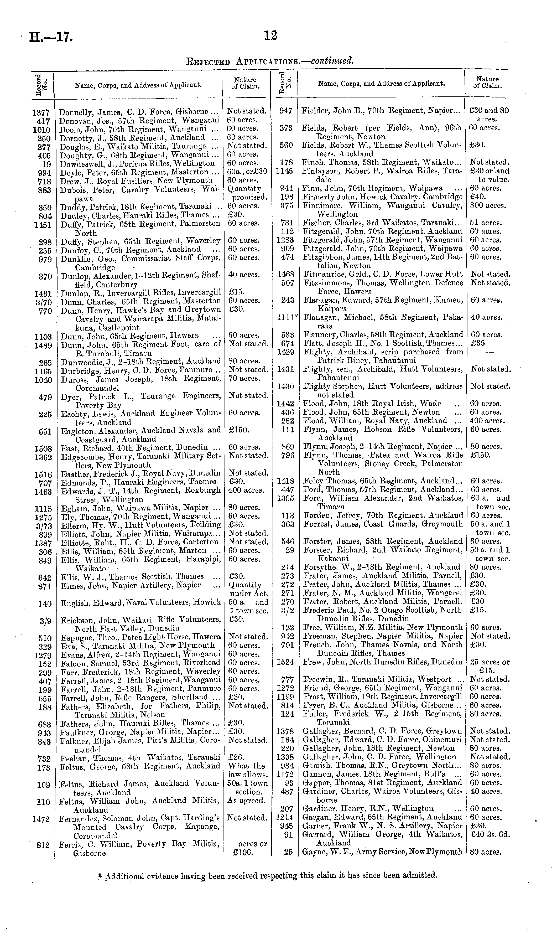 ■a . o o M Name, Corps, and Address of Applicant. Nature of Claim. u . O o Name, Corps, and Address of Applicant. Nature of Claim. 1377 417 1010 250 277 405 19 994 718 883 Donnelly, James, C. D. Force, Gisborne ... Donovan, Jos., 57th Regiment, Wanganui Doole, John, 70th Regiment, Wanganui ... Dornetty, J., 58th Regiment, Auckland ... Douglas, E., Waikato Militia, Tauranga ... Doughty, G., 68th Regiment, Wanganui... Dowdeswell, J., Porirua Rifles, Wellington Doyle, Peter, 65th Regiment, Masterton ... Drew, J., Royal Fusiliers, New Plymouth Dubois, Peter, Cavalry Volunteers, Waipawa Duddy,Patrick, 18thRegiment, Taranaki ... Dudley, Charles, Hauraki Rifles, Thames ... Duffy, Patrick, 65th Regiment, Palmerston North Duffy, Stephen, 65th Regiment, Waverley Dunfoy, O, 70th Regiment, Auckland Dunklin, Geo., Commissariat Staff Corps, Cambridge Dunlop, Alexander, l-12th Regiment, Sheffield, Canterbury Dunlop, R., Invercargill Rifles, Invercargill Dunn, Charles, 65th Regiment, Masterton Dunn, Henry, Hawke's Bay and Greytown Cavalry and Wairarapa Militia, Mataikuna, Castlepoint Dunn, John, 65th Regiment, Hawera Dunn, John, 65th Regiment Foot, care of R. Turnbul!, Timaru Dunwoodie, J., 2-18th Regiment, Auckland Durbridge, Henry, CD. Force,Panmure... Duross, James Joseph, 18th Regiment, Coromandel Dyer, Patrick L., Tauranga Engineers, Poverty Bay Eachty, Lewis, Auckland Engineer Volunteers, Auckland Eagleton, Alexander, Auckland Navals and Coastguard, Auckland East, Richard, 40th Regiment, Dunedin ... Edgecombe, Henry, Taranaki Military Settlers, New Plymouth Easther, Frederick J., Royal Navy, Dunedin Edmonds, P., Hauraki Engineers, Thames Edwards, J. T., 14th Regiment, Roxburgh Street, Wellington Egham, John, Waipawa Militia, Napier ... Ely, Thomas, 70th Regiment, Wanganui... Ellerm, Hy. W., Hutt Volunteers, Feilding Elliott, John, Napier Militia, Wairarapa... Elliotte, Robt., H., C. D. Force, Carterton Ellis, William, 65th Regiment, Marton ... Ellis, William, 65th Regiment, Harapipi, Waikato Ellis, W. J., Thames Scottish, Thames ... Elmes, John, Napier Artillery, Napier Not stated. 60 acres. 60 acres. 60 acres. Not stated. 60 acres. 60 acres. 60a.,or£30 60 acres. Quantity promised. 60 acres. £30. 60 acres. 947 373 560 178 1145 Fielder, John B., 70th Regiment, Napier... Fields, Robert (per Fields, Ann), 96th Regiment, Newton Fields, Robert W., Thames Scottish Volunteers, Auckland Finch, Thomas, 58th Regiment, Waikato,.. Finlayson, Robert P., Wairoa Rifles, Taradale Finn, John, 70th Regiment, Waipawa Finnerty John, Howick Cavalry, Cambridge Finnimore, William, Wanganui Cavalry, Wellington Fischer, Charles, 3rd Waikatos, Taranaki... Fitzgerald, John, 70th Regiment, Auckland Fitzgerald, John, 57th Regiment, Wanganui Fitzgerald, John, 70th Regiment, Waipawa Fitzgibbon, James, 14th Regiment, 2nd Battalion, Newton Fitmaurice, Grid., C. D. Force, Lower Hutt Fitzsimmons, Thomas, Wellington Defence Force, Hawera Flanagan, Edward, 57th Regiment, Kumeu, Kaipara Flanagan, Michael, 58th Regiment, Pakaraka £30 and 80 acres. 60 acres. £30. Not stated. £30 or land to value. 60 acres. £40. 800 acres. 944 198 375 350 804 1451 731 112 1283 909 474 51 acres. 60 acres. 60 acres. 60 acres. 60 acres. 298 255 979 60 acres. 60 acres. 60 acres. 370 40 acres. 1468 507 Not stated. Not stated. 1461 3/79 770 £15. 60 acres. £30. 243 60 acres. 1111* 40 acres. 1103 1489 60 acres. Not stated. 533 674 1429 Flannery, Charles, 58th Regiment, Auckland Flatt, Joseph H., No. 1 Scottish, Thames... Flighty, Archibald, scrip purchased from Patrick Biney, Pahautanui Fiighty, sen., Archibald, Hutt Volunteers, Pahautanui Flighty Stephen, Hutt Volunteers, address not stated Flood, John, 18th Royal Irish, Wade Flood, John, 65th Regiment, Newton Flood, William, Royal Navy, Auckland ... Flynn, James, Hobson Rifle Volunteers, Auckland Flynn, Joseph, 2-llth Regiment, Napier ... Flynn, Thomas, Patea and Wairoa Rifle Volunteers, Stoney Creek, Palmerston North Foley Thomas, 65th Regiment, Auckland... Ford, Thomas, 57th Regiment, Auckland... Ford, William Alexander, 2nd Waikatos, Timaru Forden, Jefrey, 70th Regiment, Auckland Forrest, James, Coast Guards, Greymouth 60 acres. £35 265 1165 1040 80 acres. Not stated. 70 acres. 1431 Not stated. 1430 Not stated. 479 Not stated. 1442 436 282 111 60 acres. 60 acres. 400 acres. 60 aeres. 225 60 acres. 551 £150. 1508 1362 60 aeres. Not stated. 869 796 80 acres. £150. 1516 707 1463 Not stated. £30. 400 acres. 1418 447 1395 60 acres. 60 acres. 60 a. and town sec. 60 aeres. 50 a. and 1 town sec. 60 acres. 50 a. and 1 town sec. 80 acres. £30. £30. £30. £30 £15. 1115 1275 3/73 899 1387 306 849 80 acres. 60 acres. £30. Not stated. Not stated. 60 acres. 60 acres. 113 363 546 29 642 871 140 English, Edward, Naval Volunteers, Howick £30. Quantity under Act. 50 a. and 1 town sec. £30. 214 273 272 271 270 3/2 Forster, James, 58th Regiment, Auckland Forster, Richard, 2nd Waikato Regiment, Kakanni Forsythe, W., 2-18th Regiment, Auckland Frater, James, Auckland Militia, Parnell, Frater, John, Auckland Militia, Thames ... Frater, N. M., Auckland Militia, Wangarei Frater, Robert, Auckland Militia, Parnell. Frederic Paul, No. 2 Otago Scottish, North Dunedin Rifles, Dunedin Free, William, N.Z. Militia, New Plymouth Freeman, Stephen. Napier Militia, Napier French, John, Thames Navals, and North Dunedin Rifles, Tliames Frew, John, North Dunedin Rifles, Dunedin 3/9 Erickson, John, Waikari Rifle Volunteers, North East Valley, Dunedin Espugne, Theo., Patea Light Horse, Hawera Eva, S., Taranaki Militia, New Plymouth Evans, Alfred, 2-14th Regiment, Wanganui Faloon, Samuel, 53rd Regiment, Riverhead Farr, Frederick, 18th Regiment, Waverley Farrell, James, 2-18th Regiment/Wanganui Farrell, John, 2-18th Regiment, Panmuro Farrell, John, Rifle Rangers, Shortland ... Fathers, Elizabeth, for Fathers, Philip, Taranaki Militia, Nelson Fathers, John, Hauraki Rifles, Thames ... Faulkner, George, Napier Militia, Napier... Falkn