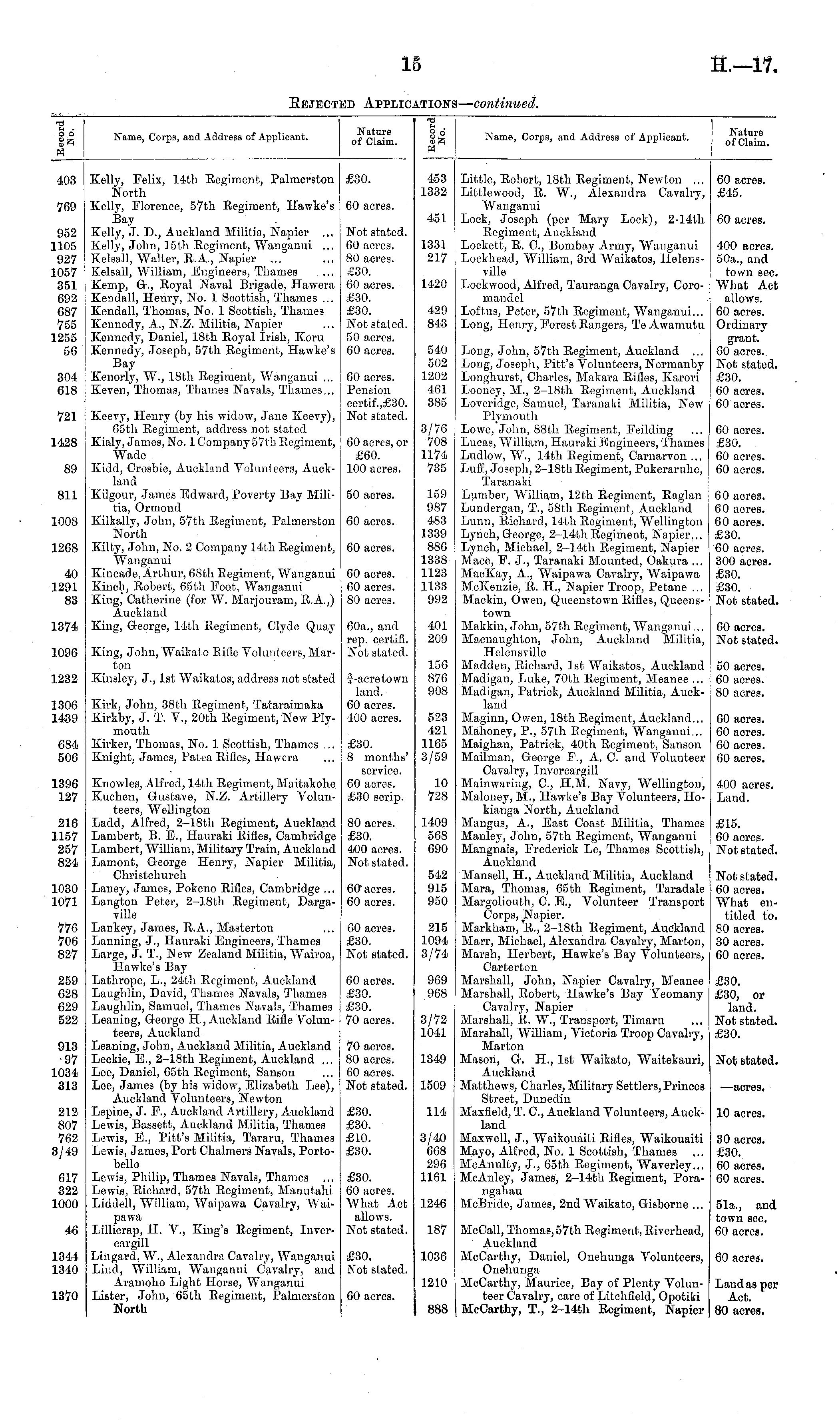 o o P. Name, Corps, and Address of Applicant. Nature of Claim. °_ '■ « I Name, Corps, and Address of Applicant. Nature of Claim. 403 769 952 L105 927 .057 351 692 687 755 L255 56 Kelly, Felix, 14th Regiment, Palmerston North Kelly, Florence, 57th Regiment, Hawke's Bay Kelly, J. D., Auckland Militia, Napier ... Kelly, John, 15th Regiment, Wanganui ... Kelsall, Walter, R.A., Napier ... Kelsall, William, Engineers, Tliames Kemp, G-., Royal Naval Brigade, Hawera Kendall, Henry, No. 1 Scottish, Tliames ... Kendall, Thomas, No. 1 Scottish, Thames Kennedy, A., N.Z. Militia, Napier Kennedy, Daniel, 18th Royal Irish, Koru Kennedy, Joseph, 57th Regiment, Hawke's Bay Kenorly, W., 18th Regiment, Wanganui ... Keven, Thomas, Thames Navals, Thames... £30. 60 acres. Not stated. 60 acres. 80 acres. £30. 60 acres. £30. £30. Not stated. 50 acres. 60 acres. 453 1332 451 1331 217 1420 Little, Robert, 18th Regiment, Newton ... Littlewood, R. W., Alexandra Cavalry, Wanganui Lock, Joseph (per Mary Lock), 2-14th Regiment, Auckland Lockett, R. O, Bombay Army, Wanganui Lockhead, William, 3rd Waikatos, Helensville Lockwood, Alfred, Tauranga Cavalry, Coromandel Loftus, Peter, 57th Regiment, Wanganui... Long, Henry, Forest Rangers, Te Awamutu 60 acres. £45. 60 acres. 400 acres. 50a., and town sec. What Act allows. 60 acres. Ordinary grant. 60 acres.. Not stated. £30. 60 acres. 60 acres. 429 843 304 618 721 L428 89 811 LOOS L268 40 L291 83 1374 L096 1232 1306 L439 684 506 L396 127 Keevy, Henry (by his widow, Jane Keevy), 65th Regiment, address not stated Kialy, James, No. 1 Company 57th Regiment, Wade Kidd, Crosbie, Auckland Volunteers, Auckland Kilgour, James Edward, Poverty Bay Militia, Ormond Kilkally, John, 57th Regiment, Palmerston North Kilty, John, No. 2 Company 14th Regiment, Wanganui Kincade, Arthur, 68th Regiment, Wanganui Kinch, Robert, 65th Foot, Wanganui King, Catherine (for W. Marjouram, R.A.,) Auckland King, George, 14th Regiment, Clyde Quay King, John, Waikato Eifle Volunteers, Marton Kinsley, J., 1st Waikatos, address not stated Kirk, John, 38th Regiment, Tataraimaka Kirkby, J. T. V., 20th Regiment, New Plymouth Kirker, Thomas, No. 1 Scottish, Thames .., Knight, James, Patea Rifles, Hawera Knowles, Alfred, 14th Regiment, Maitakohe Kuchen, Gustave, N.Z. Artillery Volunteers, Wellington Ladd, Alfred, 2-18th Regiment, Auckland Lambert, B. E., Hauraki Rifles, Cambridge Lambert, William, Military Train, Auckland Lamont, George Henry, Napier Militia, Christchureh Laney, James, Pokeno Rifles, Cambridge ... Langton Peter, 2-18th Regiment, Dargaville Lankey, James, R.A., Masterton Banning, J., Hauraki Engineers, Thames Large, J. T., New Zealand Militia, Wairoa, Hawke's Bay Lathrope, L., 24th Regiment, Auckland Laughlm, David, Thames Navals, Thames Laughlin, Samuel, Thames Navals, Thames Leaning, George H, Auckland Rifle Volunteers, Auckland Leaning, John, Auckland Militia, Auckland Leckie, E., 2-18th Regiment, Auckland ... Lee, Daniel, 65th Regiment, Sanson Lee, James (by his widow, Elizabeth Lee), Auckland Volunteers, Newton Lepine, J. F., Auckland Artillery, Auckland Lewis, Bassett, Auckland Militia, Thames Lewis, E., Pitt's Militia, Tararu, Thames Lewis, James, Port Chalmers Navals, Portobello Lewis, Philip, Thames Navals, Thames Lewis, Richard, 57th Regiment, Manutahi Liddell, William, Waipawa Cavalry, Waipawa Lillicrap, H. V., King's Regiment, Invercargill Lingard, W., Alexandra Cavalry, Wanganui Lind, William, Wanganui Cavalry, and Aramoho Light Horse, Wanganui Lister, Johu, 65th Regiment, Palmerston North 60 acres. Pension certif.,£30. Not stated. 60 acres, or £60. 100 acres. 50 acres. 60 acres. 60 acres. 60 acres. 60 acres. 80 acres. 60a., and rep. ccrtifi. Not stated. f-acretown land. 60 acres. 400 acres. £30. 8 months' service. 60 acres. £30 scrip. 540 502 1202 461 385 3/76 708 1174 735 159 987 483 1339 886 1338 1123 1133 992 401 209 156 876 908 523 421 1165 3/59 10 728 Long, John, 57th Regiment, Auckland ... Long, Joseph, Pitt's Volunteers, Normanby Longhurst, Charles, Makara Rifles, Karori Looney, M., 2-18th Regiment, Auckland Loveridge, Samuel, Taranaki Militia, New Plymouth Lowe, John, 88th Regiment, Feilding Lucas, William, Hauraki Engineers, Thames Ludlow, W., 14th Regiment, Carnarvon ... Luff, Joseph, 2-18th Regiment, Pukeraruhe, Taranaki Lumber, William, 12th Regiment, Raglan Lundergan, T., 58th Regiment, Auckland Lunn, Richard, 14th Regiment, Wellington Lynch, George, 2-14thRegiment, Napier,.. Lynch, Michael, 2-14th Regiment, Napier Mace, F. J., Taranaki Mounted, Oakura ... MacKay, A., Waipawa Cavalry, Waipawa McKenzie, R. H, Napier Troop, Petane ... Mackin, Owen, Queenstown Rifles, Queenstown Makkin, John, 57th Regiment, Wanganui.., Macnaughton, John, Auckland Militia, Helensville Madden, Richard, 1st Waikatos, Auckland Madigan, Luke, 70th Regiment, Meanee ... Madigan, Patrick, Auckland Militia, Auckland Maginn, Owen, 18th Regiment, Auckland,.. Mahoney, P., 57th Eegiment, Wanganui... Maighan, Patrick, 40th Regiment, Sanson Mailman, George F., A. C. and Volunteer Cavalry, Invercargill Mainwariug, O, H.M. Navy, Wellington, Maloney, M., Hawke's Bay Volunteers, Hokianga North, Auckland Mangus, A., East Coast Militia, Tliames Mauley, John, 57th Regiment, Wanganui Mangnais, Frederick Le, Thames Scottish, Auckland Mansell, H., Auckland Militia, Auckland Mara, Thomas, 65th Regiment, Taradale Margolioulh, C. E., Volunteer Transport Corps, Napier. Markham, *R., 2-18th Regiment, Auckland Man*, Michael, Alexandra Cavaby, Marton, Marsh, Herbert, Hawke's Bay Volunteers, Carterton Marshall, John, Napier Cavalry, Meanee Marshall, Robert, Hawke's Bay Yeomany Cavalry, Napier Marshall, R. W., Transport, Timaru Marshall, William, Victoria Troop Cavalry, Marton Mason, G. H., 1st Waikato, Waitekauri, Auckland Matthews, Charles, Military Settlers, Princes Street, Dunedin Maxfiekl, T. O, Auckland Volunteers, Auckland Maxwell, J., Waikouaiti Rifles, Waikouaiti Mayo, Alfred, No. 1 Scottish, Thames ... 