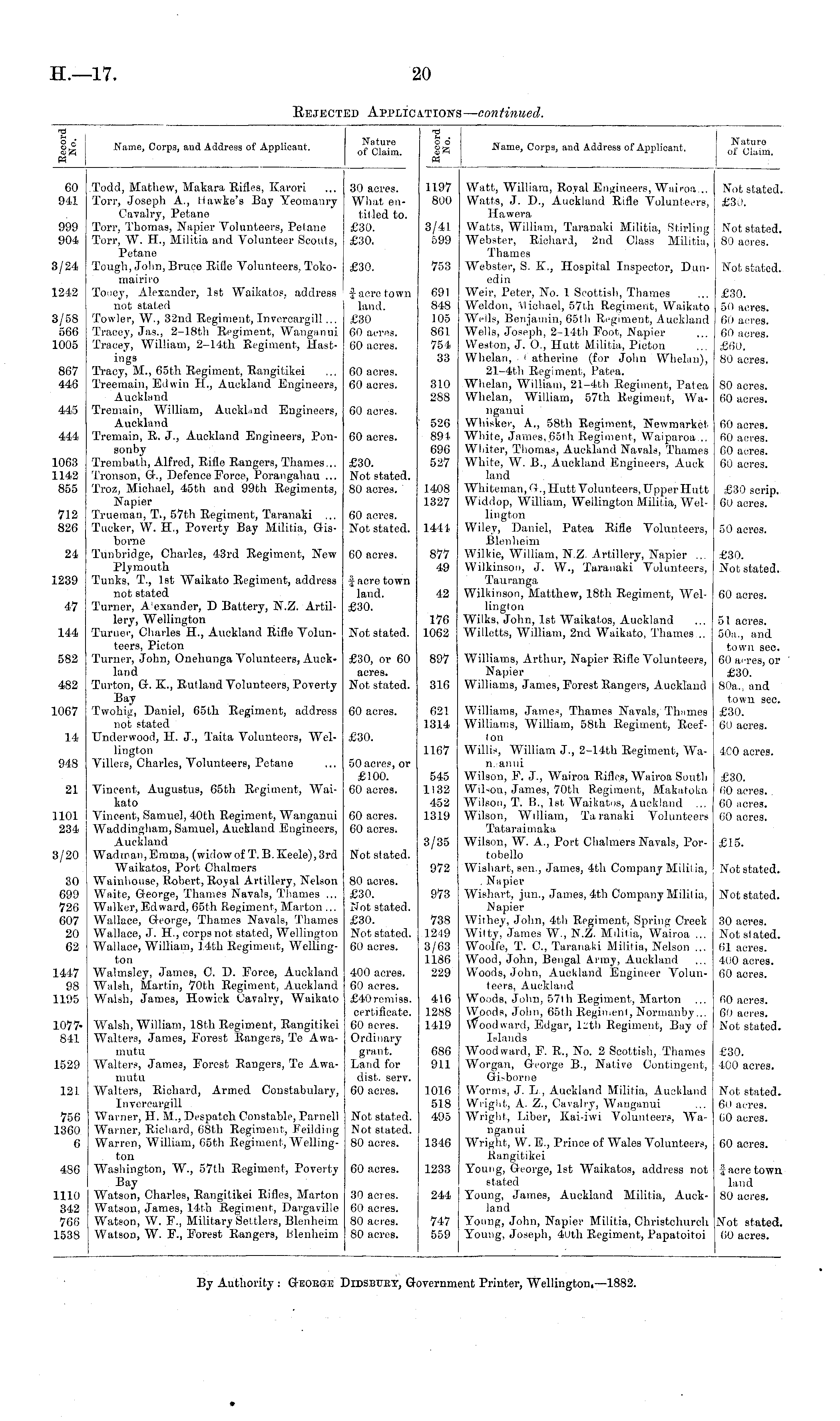 g o* Name, Corps, and Address of Applicant. Nature of Claim. &. . o o g Name, Corps, and Address of Applicant. Nature of Claim. 60 941 999 904 3/24 1242 3/58 566 1005 867 446 445 444 1063 1142 855 712 826 24 1239 47 144 582 482 1067 Todd, Mathew, Makara Rifles, Karori Torr, Joseph A., Hawke's Bay Yeomanry Cavalry, Petane Torr, Thomas, Napier Volunteers, Petane Torr, W. II., Militia and Volunteer Scouts, Petane Tough, John, Bruce Rifle Volunteers, Tokomairiro Tooey, Alexander, 1st Waikatos, address not stated Towler, W., 32nd Regiment, Invercargill... Tracey, Jas., 2-18th Regiment, Wanganui Tracey, William, 2-14th Regiment, Hastings Tracy, M., 65th Regiment, Rangitikei Treemain, Edwin H., Auckland Engineers, Auckland Tremain, William, Auckland Engineers, Auckland Tremain, R. J., Auckland Engineers, Ponsonby Trembath, Alfred, Rifle Rangers, Thames... Tronson, G., Defence Force, Porangahau ... Troz, Michael, 45th and 99th Regiments, Napier Trueman, T., 57th Regiment, Taranaki ... Tucker, W. H., Poverty Bay Militia, Gisborne Tunbridge, Charles, 43rd Regiment, New Plymouth Tunks, T., 1st Waikato Regiment, address not stated Turner, A'exander, D Battery, N.Z. Artillery, Wellington Turner, Charles H., Auckland Rifle Volunteers, Picton Turner, John, Onehunga Volunteers, Auckland Turton, G. K., Rutland Volunteers, Poverty Bay Twohig, Daniel, 65lh Regiment, address not stated Underwood, H. J., Taita Volunteers, Wellington Villers, Charles, Volunteers, Petane 30 acres. What entitled to. £30. £30. £30. £ acre town land. £30 60 acres. 60 aeres. 60 acres. 60 acres. 60 acres. 60 acres. £30. Not stated. 80 acres. 60 acres. Not stated. 60 acres. f acre town land. £30. Not stated. £30, or 60 acres. Not stated. 60 acres. 1197 800 3/4,1 599 753 691 848 105 861 754 33 310 288 526 894 696 527 1408 1327 1441 877 49 42 176 1062 897 316 621 1314 Watt, William, Royal En.ineers, Wairoa... Not stated. Watts, J. D., Auckland Rifle Volunteers, £30. Hawera Watts, William, Taranaki Militia, Stirling Not stated. Webster, Richard, 2nd Class Militia, 80 acres. Thames Webster, S. K., Hospital Inspector, Dun- Not stated. edin Weir, Peter, No. 1 Scottish, Thames ... £30. Weldon, Michael, 57th Regiment, Waikato 50 acres. Wells, Benjamin, 65th Regiment, Auckland 60 acres. Wells, Joseph, 2-14-tli Foot, Napier ... 60 acres. Weston, J. O, Hutt Militia, Picton ... £60. Wlielan, - atherine (for John Wlielan), 80 acres. 21-4'th Regiment, Patea. Whelan, William, 21-4th Regiment, Patea 80 acres. Wlielan, William, 57th Regiment, Wa- 60 acres. nganui Whisker, A., 58th Regiment, Newmarket, 60 aeres. White, James,66th Regiment, Waiparoa... 60 acres. Whiter, Thomas, Auckland Navals, Thames 60 acres. White, W. B., Auckland Engineers, Auck 60 acres. land Whiteman, 1?., Hutt Volunteers, Upper Hutt £30 scrip. Widdop, William, Wellington Militia, Wcl- 60 acres. lington Wiley, Daniel, Patea Rifle Volunteers, 50 aeres. Blenlieim Wilkie, William, N.Z. Artillery, Napier ... £30. Wilkinson, J. W., Taranaki Volunteers, Not stated. Tauranga Wilkinson, Matthew, 18th Regiment, Wei- 60 acres. lington Wilks, John, 1st Waikatos, Auckland ... 51 acres. Willctts, William, 2nd Waikato, Thames... 50a., and town sec. Williams, Arthur, Napier Rifle Volunteers, 60 acres, or Napier £30. Williams, James, Forest Rangers, Auckland 80a., and town sec. Williams, James, Thames Navals, Thames £30. Williams, William, 58th Regiment, Reef- 60 acres. Ion Willis, William J., 2-14th Regiment, Wa- 400 acres. n.-anui Wilson, F. J., Wairoa Rifles, Wairoa South £30. Wilson, James, 70th Regiment, Makatoka 60 acres. Wilson, T. B., 1st, Waikatos, Auckland ... 60 acres. Wilson, William, Taranaki Volunteers 60 acres. Tataraimaka Wilson, W. A., Port Chalmers Navals, Por- £15. tobello Wishart, sen., James, 4th Company Militia, Not stated. . Nil pier Wishart, jun., James, 4th Company Militia, Not stated. Napier Withey, John, 4th Regiment, Spring Creek 30 acres. Wilty, James W., N.Z. Militia, Wairoa ... Not slated. Woolfe, T. O, Taranaki Militia, Nelson ... 61 acres. Wood, John, Bengal Army, Auckland ... 400 acres. Woods, John, Auckland Engineer Volun- 60 acres. tecrs, Auckland Woods, John, 571 h Regiment, Marton ... 60 aeres. Woods, John, 65thRegiment, Normanby... 60 acres. Woodward, Edgar, 1-tli Regiment, Bay of Not stated. Islands Woodward, F. R., No. 2 Scottish, Thames £30. Worgan, George B., Native Contingent, 400 acres. Gisborne Worms, J. L , Auckland Militia, Auckland Not stated. Wright, A. Z., Cavalry, Wanganui ... 60 acres. Wright, Liber, Kai-iwi Volunteers, Wa- 60 acres. nganui Wright, W. E., Prince of Wales Volunteers, 60 acres. Rangitikei Young, George, 1st W raikatos, address not faeretown stated laud Young, James, Auckland Militia, Auck- 80 acres. land Young, John, Napier Militia, Christchureh Not stated. Young, Joseph, 4uth Regiment, Papatoitoi 60 acres. 14 £30. 1167 948 50 acres, or £100. 60 acres. 545 1132 452 1319 21 Vincent, Augustus, 65th Regiment, Waikato Vincent, Samuel, 40th Regiment, Wanganui Waddingham, Samuel, Auckland Engineers, Auckland Wadman, Emma, (widowof T. B. Keele), 3rd Waikatos, Port Chalmers W rainhouse, Robert, Royal Artillery, Nelson Waite, George, Thames Navals, Thames ... Walker, Edward, 65th Regiment, Marton ... Wallace, George, Thames Navals, Thames Wallace, J. H, corps not stated, Wellington Wallace, William, 14th Regiment, Wellington Walmsley, James, C. D. Force, Auckland Walsh, Martin, 70th Regiment, Auckland Walsh, James, Howick Cavalry, Waikato 1101 234 60 acres. 60 acres. 3/20 Not stated. 3/35 80 acres. £30. Not stated. £30. Not stated. 60 acres. 972 30 699 726 607 20 62 973 738 1249 3/63 1186 229 1447 98 1195 1077841 Walsh, William, 18tJi Regiment, Rangitikei Walters, James, Forest Rangers, Te Awamutu Walters, James, Forest Rangers, Te Awamutu Walters, Richard, Armed Constabulary, Invercargill Warner, H. St., Despatch Constable, Parnell Warner, Richard, 68th Regiment,, Feilding Warren, William, 65th Regiment, Wellingto