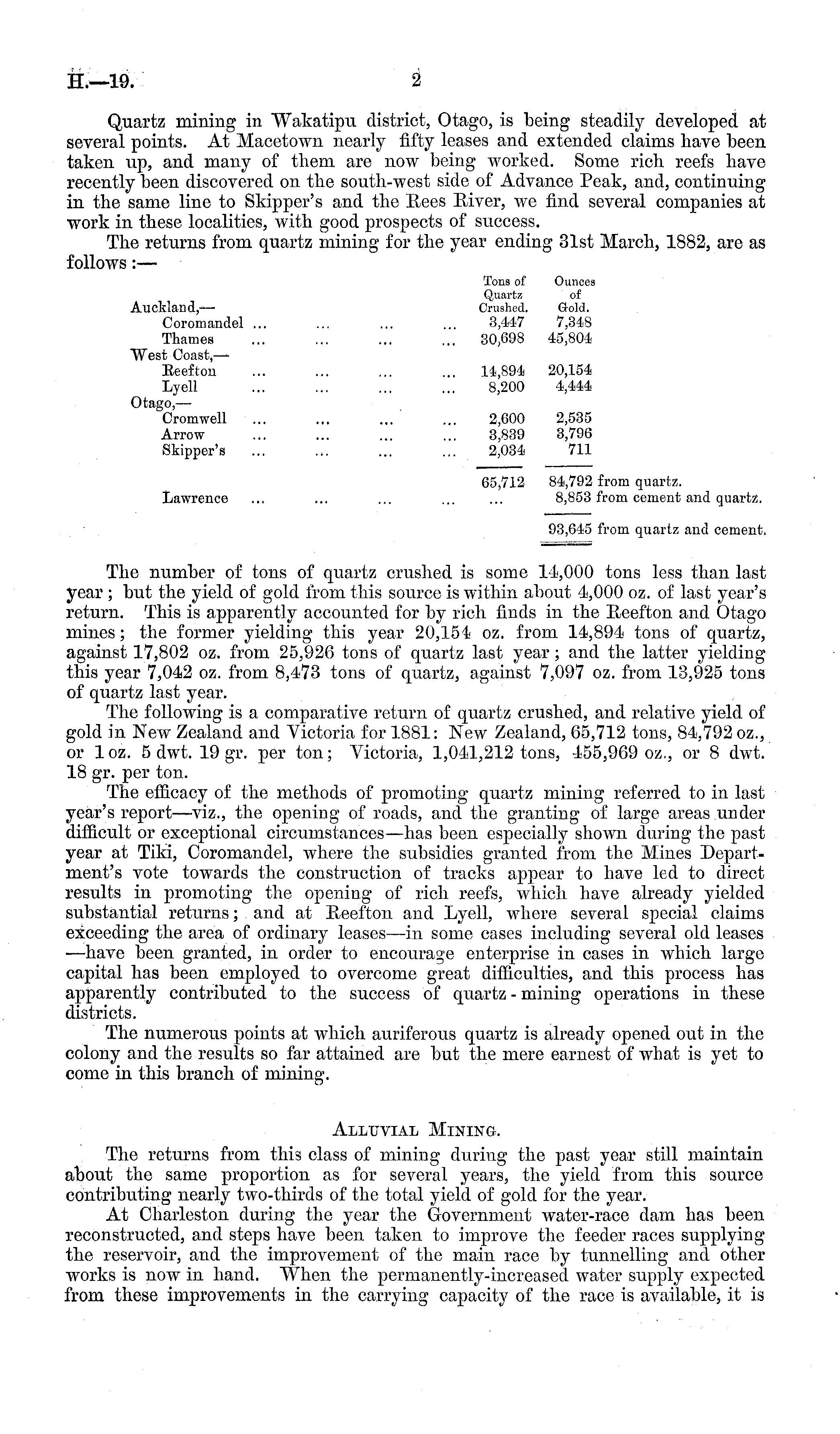 Quartz mining in Wakatipu district, Otago, is being steadily developed at several points. At Macetown nearly fifty leases and extended claims have been taken up, and many of them are now being worked. Some rich reefs have recently been discovered on the south-west side of Advance Peak, and, continuing in the same line to Skipper's and the Rees River, we find several companies at work in these localities, with good prospects of success. The returns from quartz mining for the year ending 31st March, 1882, are as follows:— Tons of Ounces Quartz of Auckland,- — Crushed. G-old. Coromandel ... ... ... ... 3,447 7,348 Thames ... ... ... ... 30,698 45,804 West Coast, —• Eeefton ... ... ... ... 14,894 20,154 Lyell ... ... ... ... 8,200 4,444 Otago, — Cromwell ... ... ... ' ... 2,600 2,535 Arrow ... ... ... ... 3,839 3,796 Skipper's ... ... ... ... 2,034 711 65,712 84,792 from quartz. Lawrence ... ... ... ... ... 8,853 from cement and quartz. 93,645 from quartz and cement. The number of tons of quartz crushed is some 1-4,000 tons less than last year ; but the yield of gold from this source is within about 4,000 oz. of last year's return. This is apparently accounted for by rich finds in the Reefton and Otago mines; the former yielding this year 20,154 oz. from 14,894 tons of quartz, against 17,802 oz. from 25,926 tons of quartz last year; and the latter yielding this year 7,042 oz. from 8,473 tons of quartz, against 7,097 oz. from 13,925 tons of quartz last year. The following is a comparative return of quartz crushed, and relative yield of gold in New Zealand and Victoria for 1881: New Zealand, 65,712 tons, 84,792 oz., or 1 oz. 5 dwt. 19 gr. per ton; Victoria, 1,041,212 tons, 455,969 oz., or 8 dwt. 18 gr. per ton. The efficacy of the methods of promoting quartz mining referred to in last year's report—viz., the opening of roads, and the granting of large areas under difficult or exceptional circumstances—has been especially shown during the past year at Tiki, Coromandel, where the subsidies granted from the Mines Department's vote towards the construction of tracks appear to have led to direct results in promoting the opening of rich reefs, which have already yielded substantial returns; and at Reefton and Lyell, where several special claims exceeding the area of ordinary leases—in some cases including several old leases —have been granted, in order to encourage enterprise in cases in which large capital has been employed to overcome great difficulties, and this process has apparently contributed to the success of quartz - mining operations in these districts. The numerous points at which auriferous quartz is already opened out in the colony and the results so far attained are but the mere earnest of what is yet to come in this branch of mining. Alluvial Mining. The returns from this class of mining during the past year still maintain about the same proportion as for several years, the yield from this source contributing nearly two-thirds of the total yield of gold for the year. At Charleston during the year the Government w rater-race dam has been reconstructed, and steps have been taken to improve the feeder races supplying the reservoir, and the improvement of the main race by tunnelling and other works is now in hand. When the permanently-increased water supply expected from these improvements in the carrying capacity of the race is available, it is