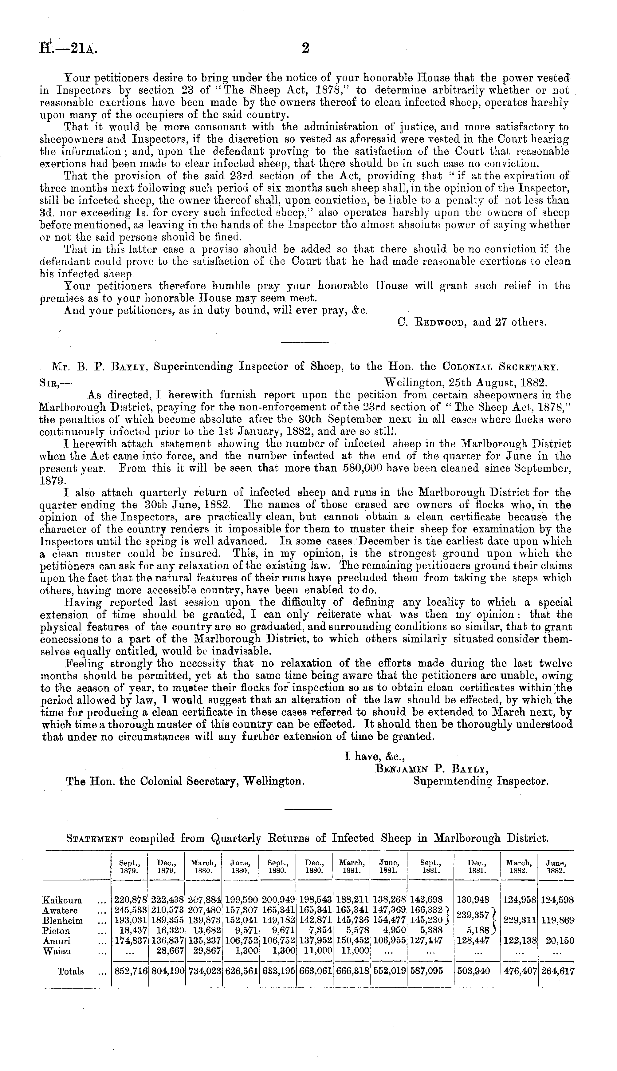 Mr. B. P. Bayly, Superintending Inspector of Sheep, to the Hon. the Colonial Secbetaey. Sib— Wellington, 25th August, 1882. As directed, I herewith furnish report upon the petition from certain sheepowners in the Marlborough District, praying for the non-enforcement of the 23rd section of " The Sheep Act, 1878," the penalties of which become absolute after the 30th September next in all cases where flocks were continuously infected prior to the Ist January, 1882, and are so still. I herewith attach statement showing the number of infected sheep in the Marlborough District when the Act came into force, and the number infected at the end of the quarter for June in the present year. From this it will be seen that more than 580,000 have been cleaned since September, 1879. I also attach quarterly return of infected sheep and runs in the Marlborough District for the quarter ending the 30th June, 1882. The names of those erased are owners of flocks who, in the opinion of the Inspectors, are practically clean, but cannot obtain a clean certificate because the character of the country renders it impossible for them to muster their sheep for examination by the Inspectors until the spring is well advanced. In some cases December is the earliest date upon which a clean muster could, be insured. This, in my opinion, is the strongest ground upon which the petitioners can ask for any relaxation of the existing law. The remaining petitioners ground their claims upon the fact that the natural features of their runs have precluded them from taking the steps which others, having more accessible country, have been enabled to do. Having reported last session upon the difficulty of defining any locality to which a special extension of time should be granted, I can only reiterate what was then my opinion : that the physical features of the country are so graduated, and surrounding conditions so similar, that to grant concessions to a part of the Marlborough District, to which others similarly situated consider themselves equally entitled, would be inadvisable. Peeling strongly the necessity that no relaxation of the efforts made during the last twelve months should be permitted, yet at the same time being aware that the petitioners are unable, owing to the season of year, to muster their flocks for inspection so as to obtain clean certificates within the period allowed by law, I would suggest that an alteration of the law should be effected, by which the time for producing a clean certificate in these cases referred to should be extended to March next, by which time a thorough muster of this country can be effected. It should then be thoroughly understood that under no circumstances will any further extension of time be granted. I have, &e., Benjamin P. Bayly, The Hon. the Colonial Secretary, Wellington. Superintending Inspector.