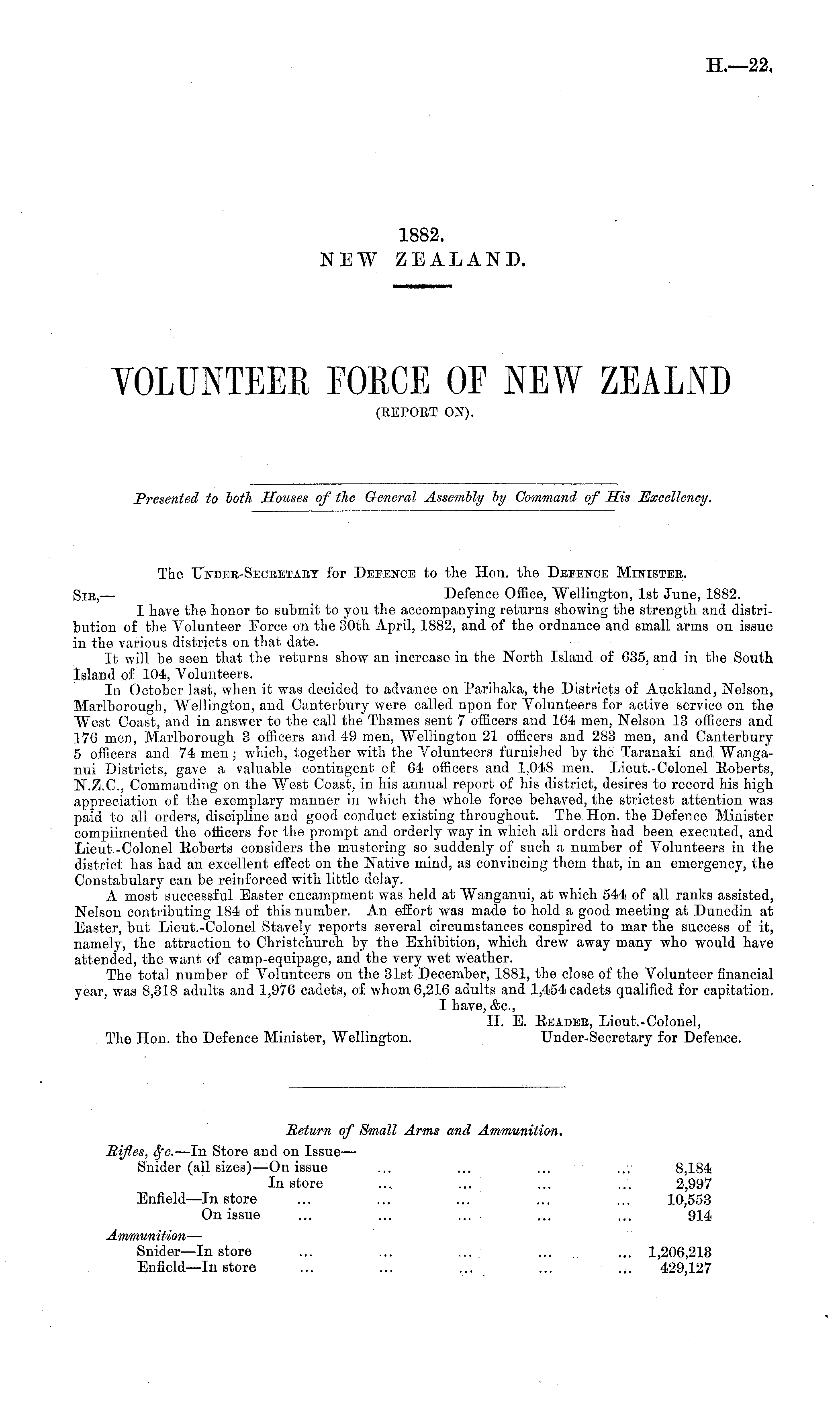 The TTndee-Seceetaby for Defence to the Hon. the Defence Ministeb. Sie,— Defence Office, Wellington, Ist June, 1882. I have the honor to submit to you the accompanying returns showing the strength and distribution of the Volunteer Force on the 30th April, 1882, and of the ordnance and small arms on issue in the various districts on that date. It will be seen that the returns show an increase in the North Island of 635, and in the South Island of 104, Volunteers. In October last, when it was decided to advance on Parihaka, the Districts of Auckland, Nelson, Marlborough, Wellington, and Canterbury were called upon for Volunteers for active service on the West Coast, and in answer to the call the Thames sent 7 officers and 164 men, Nelson 13 officers and 376 men, Marlborough 3 officers and 49 men, Wellington 21 officers and 283 men, and Canterbury 5 officers and 74 men ; which, together with the Volunteers furnished by the Taranaki and Wanganui Districts, gave a valuable contingent of 64 officers and 1,048 men. Lieut.-Colonel Eoberts, N.Z.C., Commanding on the West Coast, in his annual report of his district, desires to record his high appreciation of the exemplary manner in which the whole force behaved, the strictest attention was paid to all orders, discipline and good conduct existing throughout. The Hon. the Defence Minister complimented the officers for the prompt and orderly way in which all orders had been executed, and Lieut.-Colonel Eoberts considers the mustering so suddenly of such a number of Volunteers in the district has had an excellent effect on the Native mind, as convincing them that, in an emergency, the Constabulary can be reinforced with little delay. A most successful Easter encampment was held at Wanganui, at which 544 of all ranks assisted, Nelson contributing 184 of this number. An effort was made to hold a good meeting at Dunedin at Easter, but Lieut.-Colonel Stavely reports several circumstances conspired to mar the success of it, namely, the attraction to Christchurch by the Exhibition, which drew away many who would have attended, the want of camp-equipage, and the very wet weather. The total number of Volunteers on the 31gt December, 1881, the close of the Volunteer financial year, was 8,318 adults and 1,976 cadets, of whom 6,216 adults and 1,454 cadets qualified for capitation. I have, &c.j H. E. Eeadee, Lieut.-Colonel, The Hon. the Defence Minister, Wellington. TJnder-Secretary for Defence.