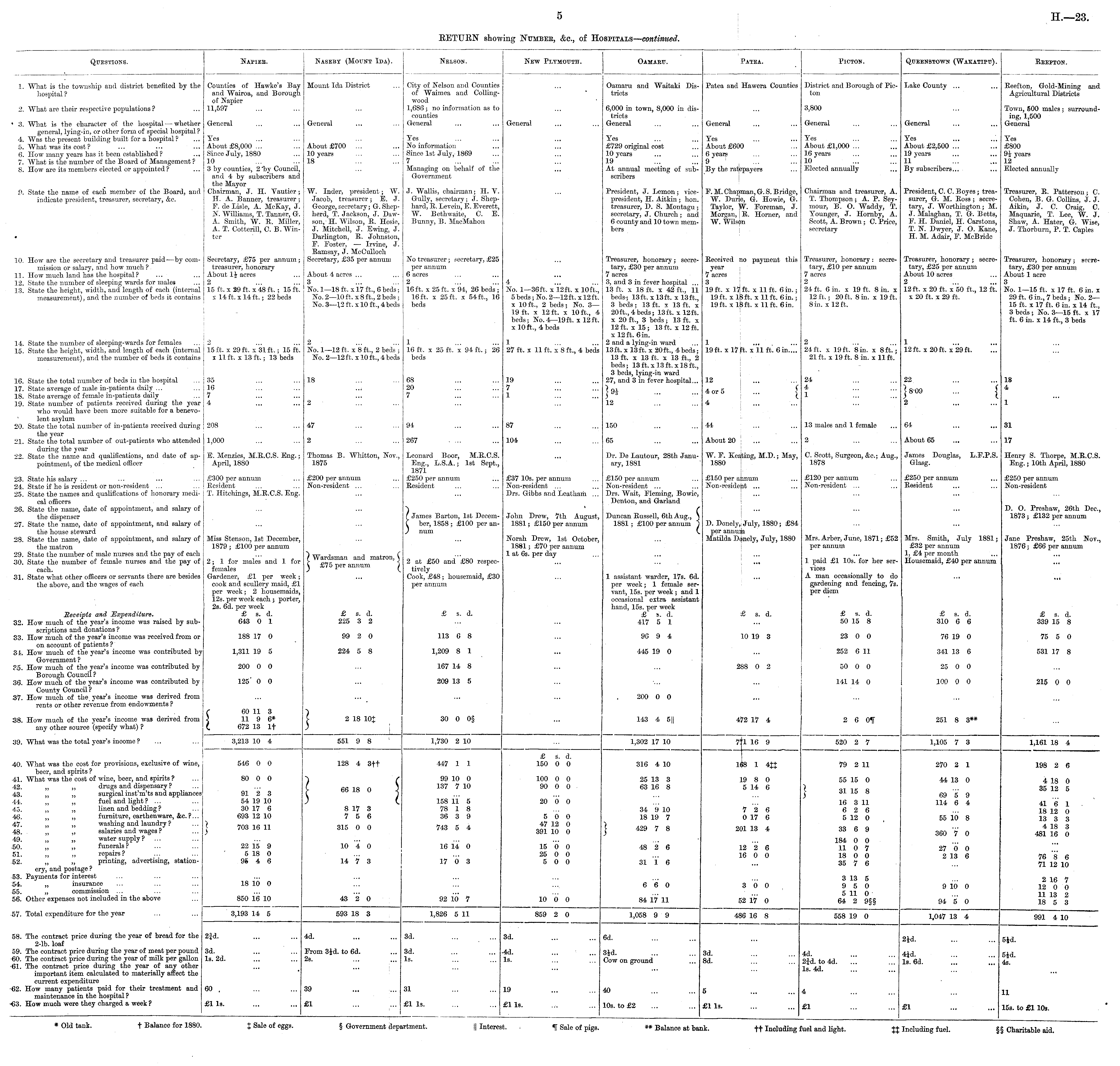 Questions. Napieb. Naseby (Mount Ida). Nelson. New Plymouth. Oamaktt. Patea. Picton. Q.UEENSTOWN (WAKATIPU). Eeefton. 1. What is the township and district benefited by the hospital ? Counties of Hawke's Bay and Wairoa, and Borough of Napier 11,597 Mount Ida District City of Nelson and Counties of Waimea and Collingwood 1,686 ; no information as to counties General Oamaru and Waitaki Districts Patea and Hawera Counties District and Borough of Picton Lake County ... Eeefton, Gold-Mining and Agricultural Districts 2. What are their respective populations ? General General 6,000 in town, 8,000 in districts General 3,800 General Town, BOO males ; surrounding, 1,500 General ' 3. What is the character of the hospital — whether general, lying-in, or other form of special hospital ? 4. Was the present building built for a hospital ? 5. What was its cost ? (!. How many years has it been established? 7. What is the number of the Board of Management ? 8. How are its members elected or appointed ? General General General Yes About £8,000 ... Since July, 1880 10 3 by counties, 2 by Council, and 4 by subscribers and the Mayor Chairman, J. H. Yautier; H. A. Banner, treasurer; F. de Lisle, A. McKay, J. N. Williams, T. Tanner, G. A. Smith, W. B, Miller, A. T. Cotterill, C. B. Winter About £700 ... 10 vears 18" Yes No information Since 1st July, 1869 7 Managing on behalf of the Government Yes £729 original cost 10 years 19 At annual meeting of subscribers Yes About £600 6 years 9 By the ratepayers Yes About £1,000 ... 16 years 10 Elected annually Yes About £2,500 ... 19 years 11 By subscribers... Yes £800 9jj years 12 Elected annually 9. State the name of each member of the Board, and indicate president, treasurer, secretary, &c. W. Inder, president; W. Jacob, treasurer; E. J. George, secretary; G. Shepherd, T. Jackson, J. Dawson, H. Wilson, E. Hosic, J. Mitchell, J. Ewing, J. Darlington, E, Johnston, F. Foster, — Irvine, J. Eamsay, J. McCulloch Secretary, £35 per annum J. Wallis, chairman; H. V. Gully, secretary; J. Shephard, E, Levein, E. Everett, W. Bethwaite, C. E. Bunny, B. MacMahon President, J. Lemon; vicepresident, H. Aitkin; lion, treasurer, D. S. Montagu; secretary, J. Church; and 6 county and 10 town members F. M. Chapman, G. S. Bridge, W. Durie, G. Howie, G. Taylor, W. Foreman, J. Morgan, E. Homer, and W. Wilson Chairman and treasurer, A. T. Thompson; A. P. Seymour, B. O. Waddy, T. Younger, J. Hornby, A. Seott, A. Brown ; C. Price, secretary President, C. C. Boyes; treasurer, G. M. Boss ; secretary, J. Worthington; M. J. Malaghan, T. G. Betts, F. H. Daniel, H. Carstons, T. N. Dwyer, J. O. Kane, H. M. Adair, F. McBridc Treasurer, E. Patterson; C. Cohen, B. G. Collins, J. J. Aikin, J. C. Craig, C. Maquarie, T. Lee, W. J. Shaw, A. Hater, G. Wise, J. Thorburn, P. T. Caples • 10. How are the secretary and treasurer paid—by commission or salary, and how much ? 11. How much land has the hospital ? 12. State the number of sleeping wards for males 13. State the height, width, and length of each (internal measurement), and the number of beds it contains Secretary, £75 per annum; treasurer, honorary About 1J acres 2 15 ft. x 29 ft. x 48 ft. ; 15 ft. x 14 ft. x 14 ft,; 22 beds About 4 acres ... 3 No.l—18ft. xl7ft., 6beds; No. 2—10 ft. x 8 ft., 2 beds ; No. 3—12 ft. x 10 ft., 4 beds No treasurer; secretary, £25 per annum 6 acres 2 16ft, x25ft. x94, 26 beds; 16ft, x 25 ft. x 54ft., 16 beds 4 No. 1—36ft. x 12ft. x 10ft., 5beds; No. 2—12ft. x 12ft. x 10ft., 2 beds; No. 3— 19 ft. x 12 ft, x 10 ft., 4 beds; No. 4—19ft. x 12ft. x 10 ft,, 4 beds Treasurer, honorary; secretary, £30 per annum 7 acres 3, and 3 in fever hospital ... 13 ft. x 18 ft. x 42 ft., 11 beds-; 13ft. x 13ft. x 13ft., 3 beds; 13 ft. x 13 ft. x 20ft.,4beds; 13ft. x 12ft, x 20 ft., 3 beds; 13 ft. x 12 ft. x 15; 13 ft. x 12 ft. x 12 ft. 6 in. 2 and a lying-in ward 13ft. x 13ft. x 20ft., 4beds; 13 ft. x 13 ft. x 13 ft., 2 beds; 13 ft. x 13 ft. x 18 ft., 3 beds, lying-in ward 27, and 3 in fever hospital... I 9* 12 Eeceived no payment this year 7 acres 3 19 ft. x 17 ft. x 11 ft. 6 in.; 19 ft. xl8ft, xllft. 6 in.; 19 ft, xl8ft. xllft. 6 in. Treasurer, honorary: secretary, £10 per annum 7 acres 2 24 ft. 6 in. x 19 ft. 8 in. x 12 ft.; 20 ft. 8 in. x 19 ft. 8in. x 12ft. Treasurer, honorary; secretary, £25 per annum About 10 acres 2 12 ft. x20ft. x50 ft., 12 ft. x 20 ft. x 29 ft. Treasurer, honorary; secretary, £30 per annum About 1 acre 3 Wo. 1—15 ft. x 17 ft. 6 in. x 29 ft. 6 in., 7 beds; No. 2— 15 ft. x 17 ft, 6 in. x 14 ft., 3 beds ; No. 3—15 ft. x 17 ft. 6 in. x 14 ft., 3 beds 14. State the number of sleeping-wards for females 15. State the height, width, and length of each (internal measurement), and the number of beds it contains 15 ft. x 29 ft. x 31 ft.; 15 ft. x 11 ft. x 13 ft.; 13 beds 2 No. 1—12 ft, x 8 ft., 2 beds; No. 2—12 ft. x 10 ft., 4 beds 1 16 ft, x 25 ft. x 94 ft.; 26 beds 1 27 ft. x 11 ft. x 8 ft,, 4 beds 1 19ft. x 17ft. xllft. 6in.... 2 24 ft. x 19 ft. 8 in. x 8 ft.; 21 ft. x 19 ft. 8 in. x 11 ft. 1 12 ft. x 20 ft. x 29 ft. 16. State the total number of beds in the hospital 17. State average of male in-patients daily ... 18. State average of female in-patients daily 19. State number of patients received during the year who would have been more suitable for a benevolent asylum 20. State the total number of in-patients received during the year 21. State the total number of out-patients who attended during the year 22. State the name and qualifications, and date of appointment, of the medical officer 35 16 7 4 18 68 20 7 19 7 1 12 4 or 5 ... f 4 24 4 1 22 ] 8-09 ... | 2 18 4 2 1 208 47 94 87 150 44 13 males and 1 female 64 31 1,000 2 267 104 65 About 20 2 About 65 17 E. Menzies, M.E.C.S. Eng.; April, 1880 Thomas B. Whitton, Nov., 1875 Leonard Boor, M.E.C.S. Eng., L.S.A.; 1st Sept., 1871 £250 per annum Eesident Dr. De Lautour, 28th January, 1881 W. F. Keating, M.D.; May, 1880 C. Scott, Surgeon
