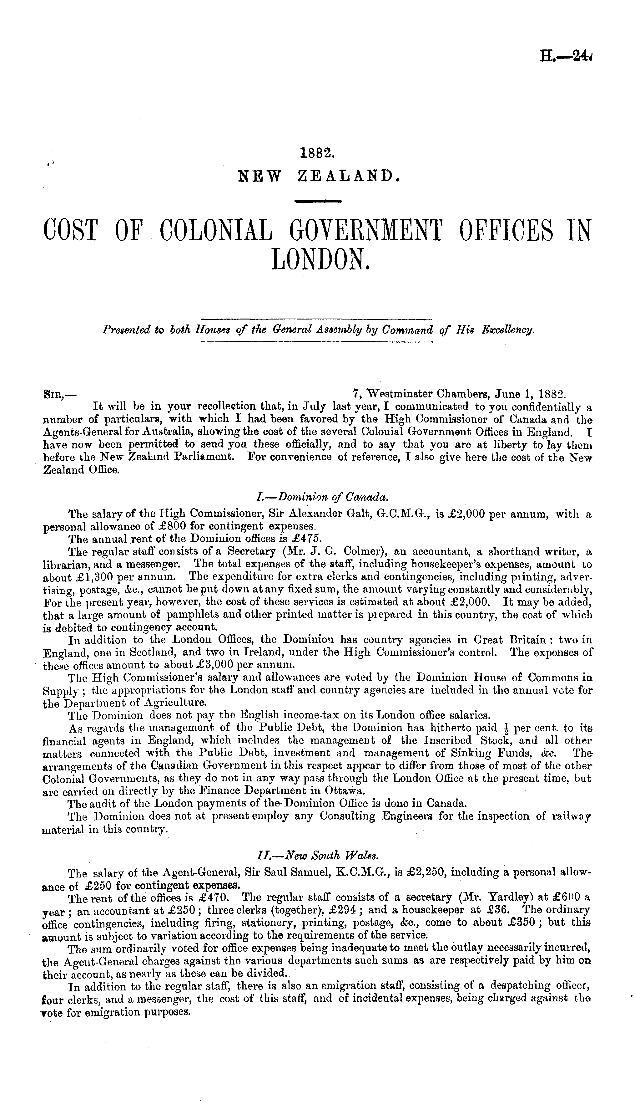 Sir, — 7, Westminster Chambers, June 1, 1882. It will be in your recollection that, in July last year, I communicated to you confidentially a number of particulars, with which I had been favored by the High Commissioner of Canada and the Agents-General for Australia, showing the cost of the several Colonial Government Offices in England. I have now been permitted to send you these officially, and to say that you are at liberty to lay them before the New Zealand Parliament. For convenience of reference, I also give here the cost of tie New Zealand Office. I. — Dominion of Canada. The salary of the High Commissioner, Sir Alexander Gait, G.C.M.G., is £2,000 per annum, with a personal allowance of £800 for contingent expenses. The annual rent of the Dominion offices is £475. The regular staff consists of a Secretary (Mr. J. G. Colmer), an accountant, a shorthand writer, a librarian, and a messenger. The total expenses of the staff, including housekeeper's expenses, amount to about £1,300 per annum. The expenditure for extra clerks and contingencies, including piinting, advertising, postage, &c, cannot be put down at any fixed sum, the amount varying constantly and considerably, For the present year, however, the cost of these services is estimated at about £2,000. It may be added, that a large amount of pamphlets and other printed matter is prepared in this country, the cost of which is debited to contingency account. In addition to the London Offices, the Dominion has country agencies in Great Britain : two in England, one in Scotland, and two in Ireland, under the High Commissioner's control. The expenses of these offices amount to about £3,000 per annum. The High Commissioner's salary and allowances are voted by the Dominion House of Commons in Supply ; the appropriations for the London staff and country agencies are included in the annual vote for the Department of Agriculture. The Dominion does not pay the English income-tax on its London office salaries. As regards the management of the Public Debt, the Dominion has hitherto paid \ per cent, to its financial agents in England, which includes the management of the Inscribed Stock, and all other matters connected with the Public Debt, investment and management of Sinking Funds, <fee. The arrangements of the Canadian Government in this respect appear to differ from those of most of the other Colonial Governments, as they do not in any way pass through the London Office at the present time, but are carried on directly by the Finance Department in Ottawa. The audit of the London payments of the Dominion Office is done in Canada. The Dominion does not at present employ any Consulting Engineers for the inspection of railway material in this country. ll. — New South Wales. The salary of the Agent-General, Sir Saul Samuel, K.C.M.G., is £2,250, including a porsonal allowance of £250 for contingent expenses. The rent of the offices is £470. The regular staff consists of a secretary (Mr. Yardley') at £600 a year ; an accountant at £250; three clerks (together), £294 ; and a housekeeper at £36. The ordinary office contingencies, including firing, stationery, printing, postage, &c, come to about £350; but this amount is subject to variation according to the requirements of the service. The sum ordinarily voted for office expenses being inadequate to meet the outlay necessarily incurred, the Agent-General charges against the various departments such sums as are respectively paid by him on their account, as nearly as these can be divided. In addition to the regular staff, there is also an emigration staff, consisting of a despatching officer, four clerks, and a messenger, the cost of this staff, and of incidental expenses, being charged against the rote for emigration purposes.