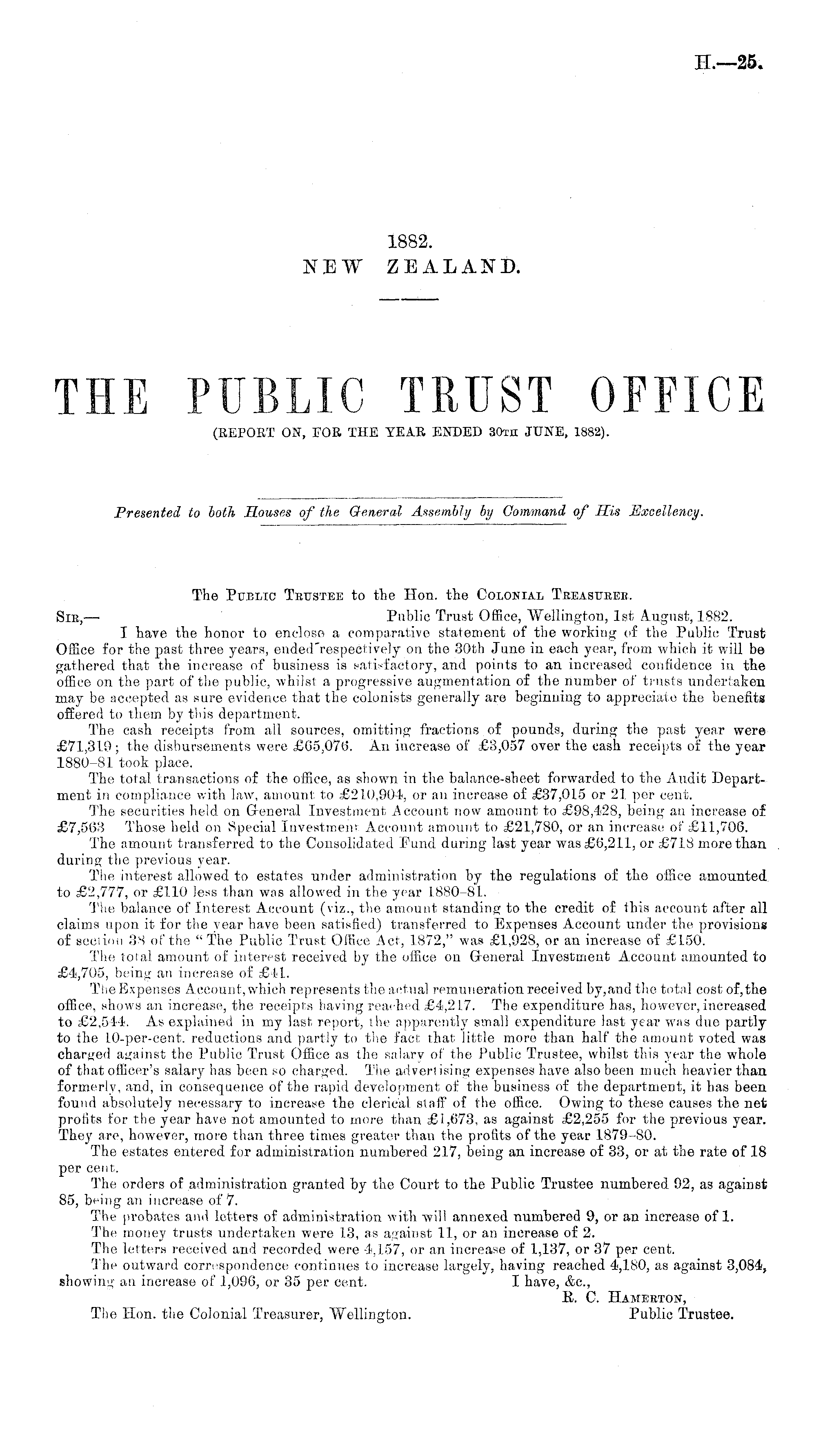 The Public Trustee to the Hon. the Colonial Treasurer. Sir,— Public Trust Office, Wellington, Ist August, 1882. I have the honor to enclose a comparative statement of the working of the Public Trust Office for the past three years, ended'respectively on the 30th June in each year, from which it will be gathered that the increase of business is satisfactory, and points to an increased confidence in the office on the part of the public, whilst a progressive augmentation of the number of trusts undertaken may be accepted as sure evidence that the colonists generally are beginning to appreciate the benefits offered to them by this department. The cash receipts from all sources, omitting fractions of pounds, during the past year were £71,319; the disbursements were £65,076. An increase of £3,057 over the cash receipts of the year 1880-81 took place. The total transactions of the office, as shown in the balance-sheet forwarded to the Audit Department in compliance with law, amount to £210,904, or an increase of £37,015 or 21 per cent. The securities held on G-eneral Investment Account now amount to £98,428, being an increase of £7,563 Those held on Special Investment, Account amount to £21,780, or an increase of £11,706. The amount transferred to the Consolidated Fund during last year was £6,211, or £718 more than during the previous year. The interest allowed to estates under administration by the regulations of the office amounted to £2,777, or £110 less than was allowed in the year 1880-81. The balance of Interest Account (viz., the amount standing to the credit of this account after all claims upon it for the year have been satisfied) transferred to Expenses Account under the provisions of seciinn 38 of the " The Public Trust Office Act, 1872," was £1,928, or an increase of £150. The total amount of interest received by the office on General Investment Account amounted to £4,705, being an increase of £11. Tließxpenses Account, which represents the actual remuneration received by,and the total cost of,the office, shows an increase, the receipts having reached £4,217. The expenditure has, however, increased to £2,544. As explained in my last report, the npparently small expenditure last year was due partly to the LO-per-cent. reductions and partly to the face that little more than half the amount voted was charged against the Public Trust Office as the salary of the Public Trustee, whilst this year the whole of that officer's salary has been so charged. The advertising expenses have also been much heavier than formerly, and, in consequence of the rapid development of the business of the department, it has been found absolutely necessary to increase the clerical staff of the office. Owing to these causes the net profits for- the year have not amounted to more than £i,673, as against £2,255 for the previous year. They are, however, more than three times greater than the profits of the year 1879-80. The estates entered for administration numbered 217, being an increase of 33, or at the rate of 18 per cent. The orders of administration granted by the Court to the Public Trustee numbered 92, as against 85, b<-'ing an increase of 7. The probates and letters of administration with will annexed numbered 9, or an increase of 1. The money trusts undertaken were 13, as against 11, or an increase of 2. The letters received and recorded were 4,157, or an increase of 1,137, or 37 per cent. The outward correspondence continues to increase largely, having reached 4,180, as against 3,084, showing an increase of 1,096, or 35 per cent. I have, &c, J&. C. Hamerton, The Hon. the Colonial Treasurer, Wellington. Public Trustee.