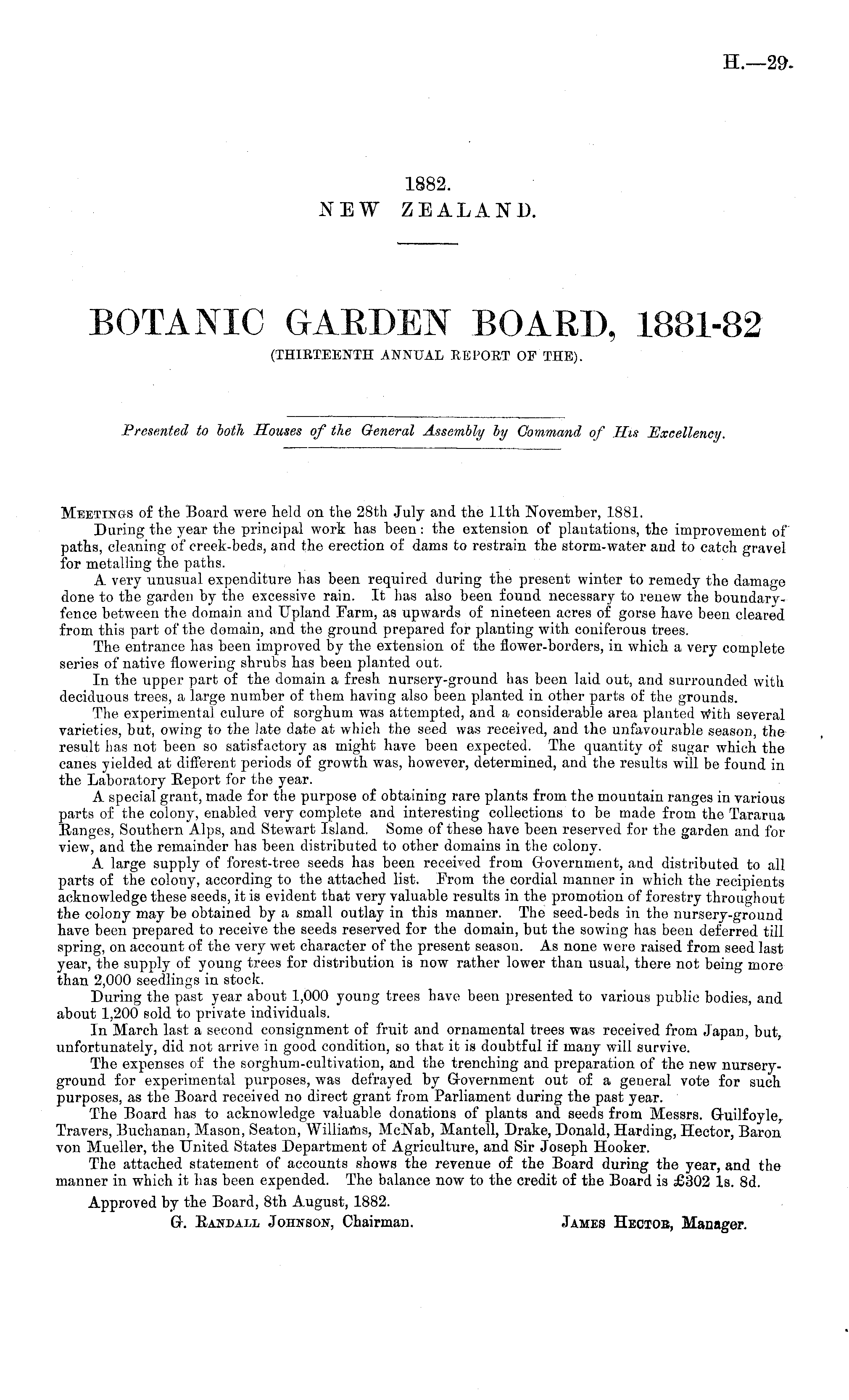 Meetings of the Board w rere held on the 28th July and the 11th November, 1881. During the year the principal work has been: the extension of plantations, the improvement of paths, cleaning of creek-beds, and the erection of dams to restrain the storm-water and to catch gravel for metalling the paths. A very unusual expenditure has been required during the present winter to remedy the damage done to the garden by the excessive rain. It has also been found necessary to renew the boundaryfence between the domain and Upland Farm, as upwards of nineteen acres of gorse have been cleared from this part of the domain, and the ground prepared for planting with coniferous trees. The entrance has been improved by the extension of the flower-borders, in which a very complete series of native flowering shrubs has been planted out. In the upper part of the domain a fresh nursery-ground has been laid out, and surrounded with deciduous trees, a large number of them having also been planted in other parts of the grounds. The experimental culure of sorghum was attempted, and a considerable area planted with several varieties, but, owing to the late date at which the seed was received, and the unfavourable season, the result has not been so satisfactory as might have been expected. The quantity of sugar which the canes yielded at different periods of growth was, however, determined, and the results will be found in the Laboratory Report for the year. A special grant, made for the purpose of obtaining rare plants from the mountain ranges in various parts of the colony, enabled very complete and interesting collections to be made from the Tararua Ranges, Southern Alps, and Stewart Island. Some of these have been reserved for the garden and for view, and the remainder has been distributed to other domains in the colony. A large supply of forest-tree seeds has been received from Government, and distributed to all parts of the colony, according to the attached list. From the cordial manner in which the recipients acknowledge these seeds, it is evident that very valuable results in the promotion of forestry throughout the colony may be obtained by a small outlay in this manner. The seed-beds in the nursery-ground have been prepared to receive the seeds reserved for the domain, but the sowing has been deferred till spring, on account of the very wet character of the present season. As none were raised from seed last year, the supply of young trees for distribution is now rather lower than usual, there not being more than 2,000 seedlings in stock. During the past year about 1,000 young trees have been presented to various public bodies, and about 1,200 sold to private individuals. In March last a second consignment of fruit and ornamental trees was received from Japan, but, unfortunately, did not arrive in good condition, so that it is doubtful if many will survive. The expenses of the sorghum-cultivation, and the trenching and preparation of the new nurseryground for experimental purposes, was defrayed by Government out of a general vote for such purposes, as the Board received no direct grant from Parliament during the past year. The Board has to acknowledge valuable donations of plants and seeds from Messrs. Guilfoyle, Travers, Buchanan, Mason, Seaton, Willianis, McNab, Mantell, Drake, Donald, Harding, Hector, Baron von Mueller, the United States Department of Agriculture, and Sir Joseph Hooker. The attached statement of accounts shows the revenue of the Board during the year, and the manner in which it has been expended. The balance now to the credit of the Board is £302 Is. Bd. Approved by the Board, Bth August, 1882. - G. Randall Johnson, Chairman. James Hectoe, Manager.