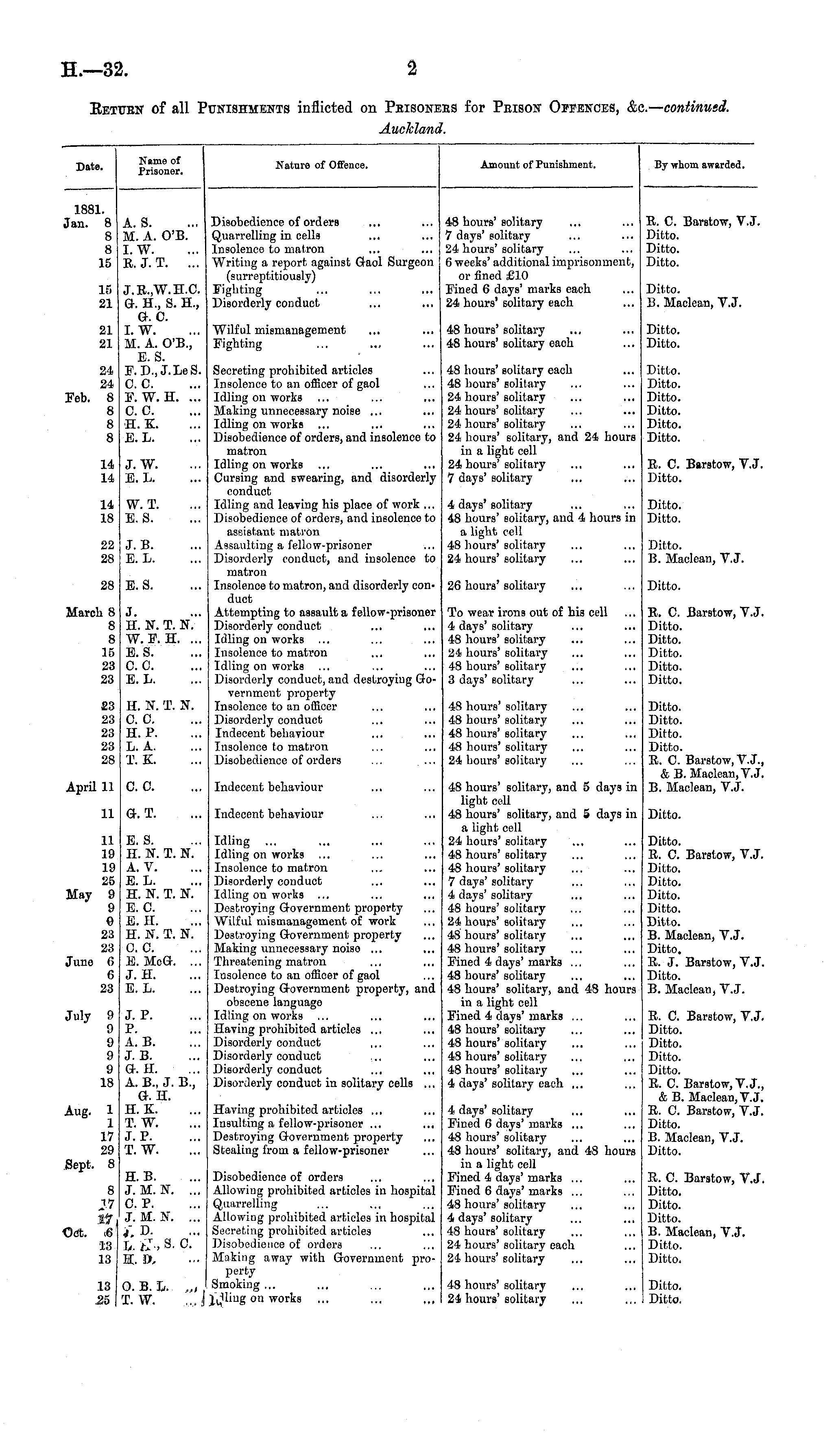 Date. Name of Prisoner. Nature of Offence. Amount of Punishment. By whom awarded. 1881. Jan. 8 A. S. 8 M. A. O'B. 8 I. W. 15 R. J. T. ... Disobedience of orders Quarrelling in cells Insolence to matron Writing a report against Gaol Surgeon (surreptitiously) lighting Disorderly conduct 48 hours'solitary 7 days' solitary 24 hours' solitary 6 weeks' additional imprisonment, or fined £10 Fined 6 days' marks each 24 hours' solitary each B. C. Bar8tow, V.J. Ditto. Ditto. Ditto. 15 J.E..W.H.C. 21 G. H., S. H., G. C. 21 I. W. 21 M. A. O'B., E. S. 24 F. D.,J.LeS. 24 C. C. Feb. 8 F.W. H. ... 8 C. C. 8 H. K. 8 E. L. Wilful mismanagement Fighting ... .., Secreting prohibited articles Insolence to an officer of gaol Idling on works Making unnecessary noiBe ... Idling on works Disobedience of orders, and insolence to matron Idling on works ... ... Cursing and swearing, and disorderly conduct Idling and leaving his place of work ... Disobedience of orders, and insolence to assistant matron Assaulting a fellow-prisoner Disorderly conduct, and insolence to matron Insolence to matron, and disorderly conduct Attempting to assault a fellow-prisoner Disorderly conduct Idling on works ... Insolence to matron Idling on works Disorderly conduct, and destroying Government property Insolence to an officer Disorderly conduct Indecent behaviour Insolence to matron Disobedience of orders 48 hours'solitary 48 hours'solitary each 48 hours' solitary each 48 hours' solitary 24 hours'solitary 24 hours'solitary 24 hours' solitary 24 hours' solitary, and 24 hours in a light cell 24 hours'solitary 7 days' solitary Ditto. B. Maclean, V.J. Ditto. Ditto. Ditto. Ditto. Ditto. Ditto. Ditto. Ditto. 14 J. W. 14 E. L. R. C. Barstow, V.J. Ditto. 14 W. T. 18 E. S. 4 days' solitary 48 hours' solitary, and 4 hours in a light cell 48 hours' solitary 24 hours' Bolitary Ditto. Ditto. 22 J. B. 28 E. L. Ditto. B. Maclean, V.J. 28 E. S. 26 hours'solitary Ditto. March 8 J. 8 H. K.T.N. 8 W. F. H. ... 15 E. S. 23 C. C. 23 E. L. To wear irons out of his cell 4 days' solitary 48 hours' solitary 24 hours' solitary 48 hours' solitary 3 days' solitary E. C. Barstow, V.J. Ditto. Ditto. Ditto. Ditto. Ditto. £3 H.N.T. 1ST. 23 C. C. 23 H. P. 23 L. A. 28 T. K. 48 hours'solitary 48 hours' solitary 48 hours'solitary 48 hours' solitary 24 hours' solitary Ditto. Ditto. Ditto. Ditto. R. 0. Barstow, V.J., & B. Maclean, V.J. B. Maclean, V.J. April 11 C. C. Indecent behaviour 48 hours' solitary, and 5 days in light cell 48 hours' solitary, and 5 days in a light cell 24 hours' solitary 48 hours'solitary 48 hours' solitary 7 days' solitary 4 days' solitary 48 hours' solitary 24 hours' solitary 48 hours'solitary 48 hours' solitary Fined 4 days' marks ... 48 hours' solitary 48 hours' solitary, and 48 hours in a light cell Fined 4 days' marka ... 48 hours' solitary 48 hours'solitary 48 hours'solitary 48 hours'solitary 4 days'solitary each ... 11 G. T. Indecent behaviour Ditto. 11 E. S. 19 H. If. T. If. 19 A. V. 25 E. L. May 9 H. ST. T. K 9 E. C. 6 E. H. 23 H. If. T. N. 23 0. C. Juno 6 El, MeG. ... 6 J. H. 23 E. L. Idling Idling on works ... Insolence to matron Disorderly conduct Idling on works ... Destroying Government property Wilful mismanagement of work Destroying Government property Making unnecessary noise ... Threatening matron Insolence to an officer of gaol Destroying Government property, and obscene language Idling on works Having prohibited articles ... Disorderly conduct Disorderly conduct Disorderly conduct Disorderly conduct in solitary cells ... Ditto. R. C. Barstow, V.J. Ditto. Ditto. Ditto. Ditto. Ditto. B. Maclean, V.J. Ditto. R. J. Barstow, V.J. Ditto. B. Maclean, V.J. July 9 J. P. 9 P. 9 A. B. 9 J. B. 9 G-. H. 18 A. B., J. B., G. H. Aug. 1 H. K. 1 T. W. 17 J. P. 29 T. "W. Sept, 8 H. B 8 J. M. N. ... J7 0. P. %*[ J. M. If. ... Out. <6 i. D13 &'£"., S.O. 13 K. 0, 13 0. B. li. ,,, 2S> T. VV. .,, J Having prohibited articles ... Insulting a fellow-prisoner ... ... Destroying Government property Stealing from a fellow-prisoner 4 days' solitary Fined 6 days' marks ... 48 hours' solitary 48 hours' solitary, and 48 hours in a light cell Fined 4 days'marks ... Fined 6 days'marks ... 48 hours' solitary 4 days' solitary 48 hours'solitary 24 hours'solitary each 24 hours'solitary R. C. Barstow, V.J. Ditto. Ditto. Ditto. Ditto. R. C. Barstow, V. J., & B. Maclean, V.J. R. C. Barstow, V.J. Ditto. B. Maclean, V.J. Ditto. Disobedience of orders Allowing prohibited articles in hospital Quarrelling Allowing prohibited articles in hospital Secreting prohibited articles Disobedience of orders Making away with Government property Smoking ... JiJHug on works ... ... ... R. C. Barstow, V.J. Ditto. Ditto. Ditto. B. Maclean, V.J. Ditto. Ditto. 48 hours' solitary 24 hours' solitary Ditto. Ditto,