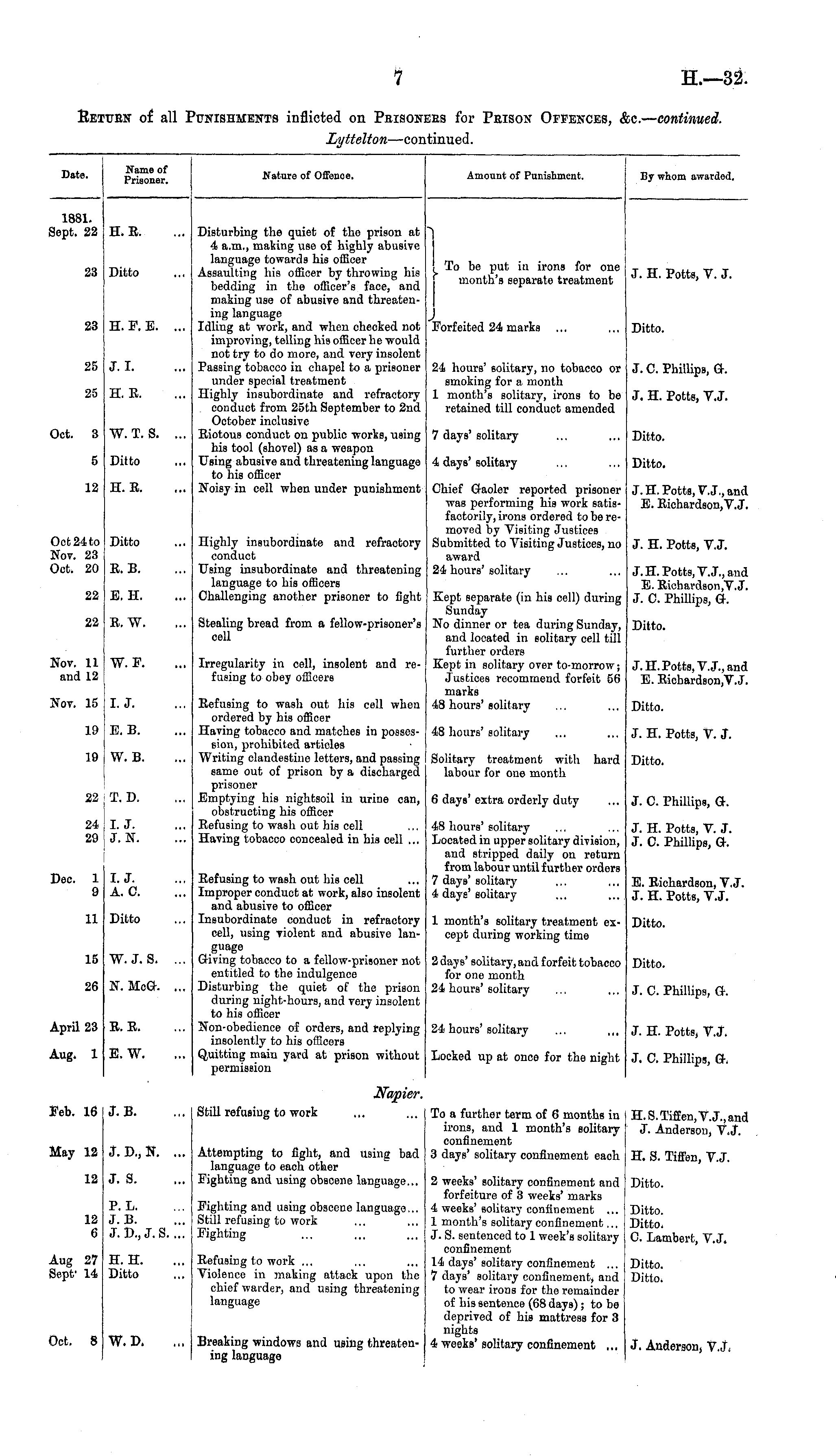 Date. Name of Prisoner. Nature of Offence. Amount of Punishment. By whom awarded. 1881. lept. 22 H. E. Disturbing the quiet of the prison at 4 a.m., making use of highly abusive language towards his officer Assaulting his officer by throwing his bedding in the officer's face, and making use of abusive and threatening language Idling at work, and when checked not improving, telling his officer he would not try to do more, and very insolent Passing tobacco in chapel to a prisoner under special treatment Highly insubordinate and refractory conduct from 25th September to 2nd October inclusive Eiotous conduct on public works, using his tool (shovel) as a weapon Using abusive and threatening language to his officer Noisy in cell when under punishment 1 To be put in irons for one month's separate treatment Forfeited 24 marts ... 23 Ditto J. H. Potts, V. J. 23 H. P. E. Ditto. 25 J.I. 24 hours' solitary, no tobacco or smoking for a month 1 month's solitary, irons to be retained till conduct amended J. C. Phillips, G. 25 H. E. J. H. Potts, V. J. )ct. 3 W. T. S. 7 days' solitary Ditto. 5 Ditto 4 days' solitary Ditto. 12 H. E. Chief G-aoler reported prisoner was performing his work satisfactorily, irons ordered to be removed by Visiting Justices Submitted to Visiting Justices, no award 24 hours' solitary J.H. Potts, V.J.,and E. Eichardson,V.J. )ct24to fov. 23 >ct> 20 Ditto Highly insubordinate and refractory conduct Using insubordinate and threatening language to his officers Challenging another prisoner to fight J. H. Potts, V.J. E. B. J. H. Potts, V.J., and B. Richardson/V.J. J. 0. Phillips, Q-. 22 E. H. Kept separate (in his cell) during Sunday No dinner or tea during Sunday, and located in solitary cell till further orders Kept in solitary over to-morrow; Justices recommend forfeit 56 marks 48 hours'solitary 22 E. W. Stealing bread from a fellow-prisoner's cell Ditto. fov. 11 and 12 W. F. Irregularity in cell, insolent and refusing to obey officers J.H. Potts, V.J., and E. Eichardson.V.J. for. 15 I. J. Eefusing to wash out his cell when ordered by his officer Having tobacco and matches in possession, prohibited articles Writing clandestine letters, and passing same out of prison by a discharged prisoner Emptying his nightsoil in urine can, obstructing his officer Eefusing to wash out his cell Having tobacco concealed in his cell ... Ditto. 19 E. B. 48 hours' solitary J. H. Potts, T. J. 19 W. B. Solitary treatment with hard labour for one month Ditto. 22 T. D. 6 days'extra orderly duty J. C. Phillips, Or. 24 29 I. J. J. N. 48 hours' solitary Located in upper solitary division, and stripped daily on return from labour until further orders 7 days' solitary 4 days' solitary J. H. Potts, V. J. J. 0. Phillips, Gh )ec. 1 9 I. J. A. C. Eefusing to wash out his cell Improper conduct at work, ako insolent and abusive to officer Insubordinate conduct in refractory cell, using violent and abusive language Giving tobacco to a fellow-prisoner not entitled to the indulgence Disturbing the quiet of the prison during night-hours, and very insolent to his officer Non-obedience of orders, and replying insolently to his officers Quitting main yard at prison without permission B. Eichardson, V.J. J. H. Potts, V. J. 11 Ditto 1 month's solitary treatment except during working time Ditto. 15 W. J. S. ... 2 days' solitary, and forfeit tobacco for one month 24 hours' solitary Ditto. 26 N. McGK ... J. 0. Phillips, &. ipril 23 E. E. 24 hours' solitary 3. H. Potts, T.J. LUg. 1 E. W. Locked up at once for the night j. c. Phillips, a. Napier. To a further term of 6 months in irons, and 1 month's solitary confinement 3 days' solitary confinement eaoh H.S.Tiffen,V.J.,and J. Anderson, V.J. ?eb. 16 J.B. Still refusing to work ktay 12 J. D., N. ... Attempting to fight, and using bad language to each other Fighting and using obscene language... H. S. Tiffen, V.J. 12 J. S. 2 weeks' solitary confinement and forfeiture of 3 weeks' marks 4 weeks' solitary confinement ... 1 month's solitary confinement... J. S. sentenced to 1 week's solitary confinement 14 days'solitary confinement ... 7 days' solitary confinement, and to wear irons for the remainder of his sentence (68 days); to be deprived of his mattress for 3 nights 4 weeks' solitary confinement ,,. Ditto. 12 6 P. h. J.B. J. D..J.S. ... Fighting and using obscene language... Still refusing to work Fighting Ditto. Ditto. C. Lambert, V.J, Lug 27 !epf 14 H. H. Ditto Eefusing to work ... Violence in making attack upon the chief warder, and UBing threatening language Ditto. Ditto. W. D. Breaking windows and using threatening language J. Anderson, V.J* •ot. 8