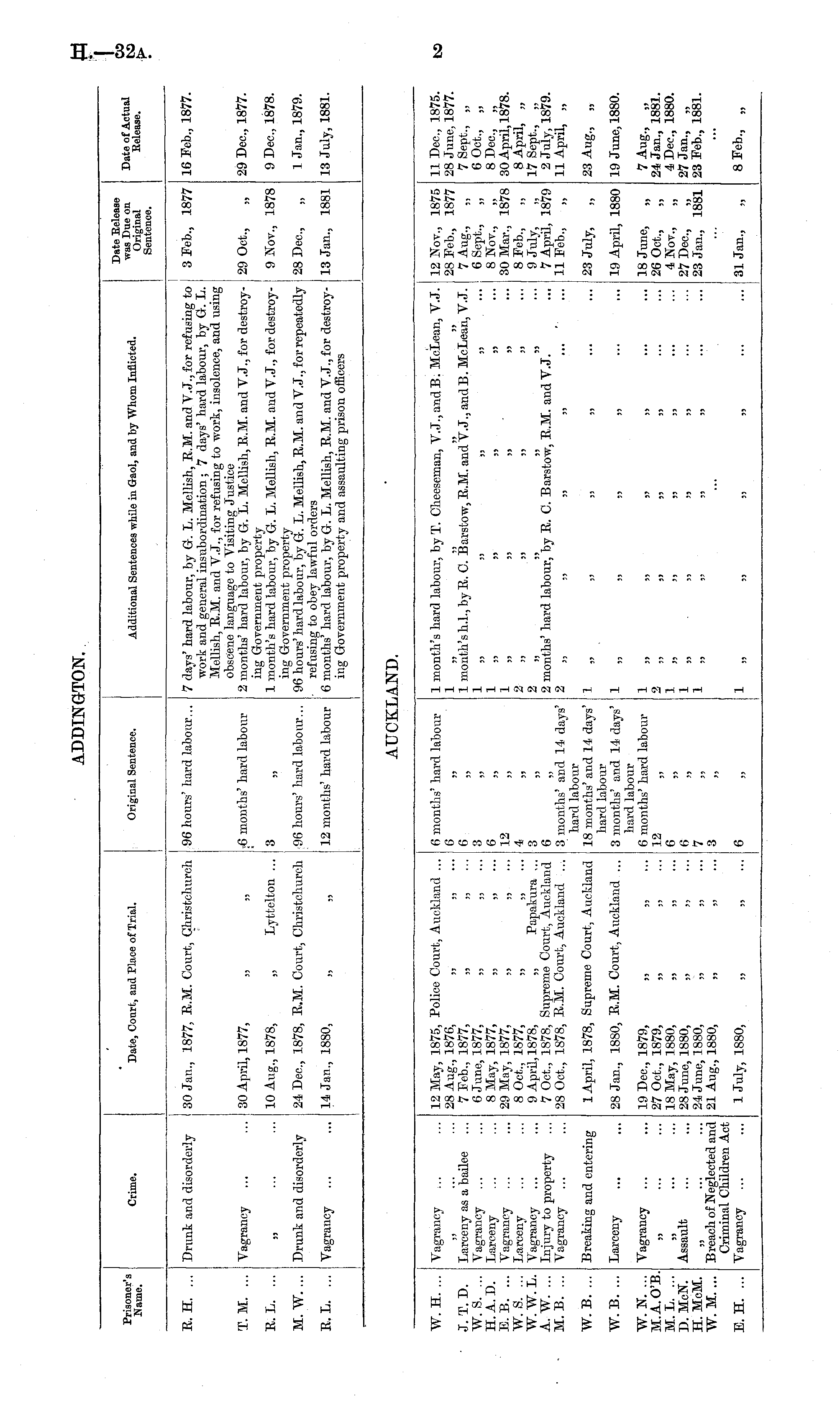Prisoner's Name. Crime. Date, Court, and Place of Trial. Original Sentence. Additional Sentences while in Gaol, and by Whom Inflicted. Date Release was Due on Original Sentence. Date of Actual Release. R. H. ... Drunk and disorderly 30 Jan., 1877, R.M. Court, Christchurch 96 hours' hard labour... 7 days' hard labour, by G. L. Mellish, R.M. and V.J., for refusing to work and general insubordination; 7 days' hard labour, by G. L. Mellish, R.M. and V.J., for refusing to work, insolence, and using obscene language to Visiting Justice 2 months' hard labour, by G. L. Mellish, R.M. and V.J., for destroying Government property 1 month's hard labour, by Gr. L. Mellish, R.M. and V.J., for destroying Government property 96 hours' hard labour, by Gr. L. Mellish, R.M. and V. J., for repeatedly refusing to obey lawful orders 6 months' hard labour, by Gr. L. Mellish, R.M. and V.J., for destroying Government property and assaulting prison officers 3 Feb., 1877 16 Feb., 1877. T.M. ... Vagrancy 30 April, 1877, G months' hard labour 29 Oct., 29 Dec, 1877. R. L. ... ,, ... 10 Aug., 1878, „ Lyttelton... 3 9 Nov., 1878 9 Dec, 1878. M. W.... Drunk and disorderly 24 Dec, 1878, R.M. Court, Christchurch 96 hours' hard labour... 28 Dec, „ 1 Jan., 1879. R, L. ... Vagrancy 14 Jan., 1880, 12 months' hard labour 13 Jan., 1881 13 July, 1881.
