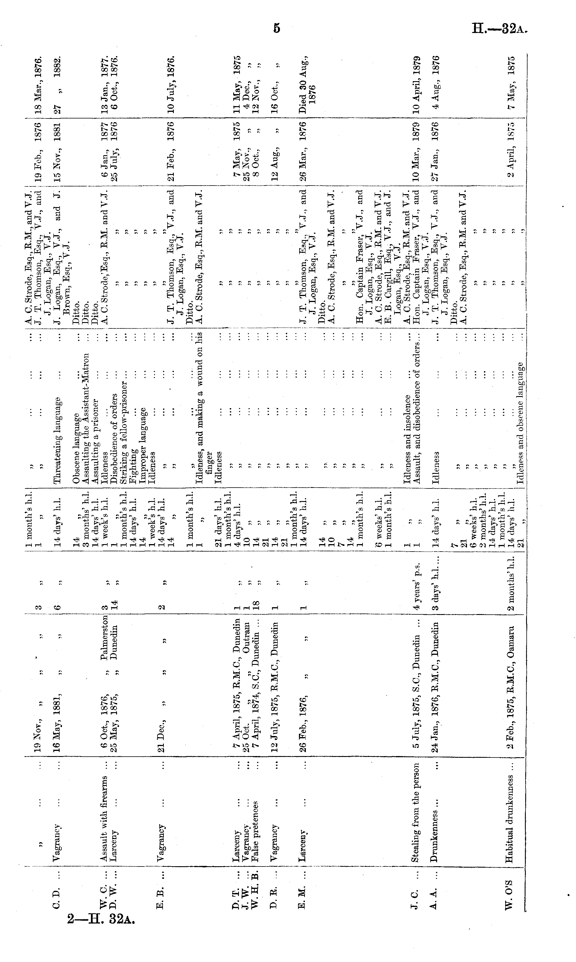 1 month s h.l. „ ... ... ... A. C. Strode, Esq., K.M., and V.J. ,, ... ... ... J. T. Thomson, Esq., V.J., and J. Logan, Esq., V.J. Threatening language ... ... J. Logan, Esq., V.J., and J. Brown, Esq., V.J. Obscene language ... ... Ditto. Assaulting the Assistant-Matron ... Ditto. Assaulting a prisoner ... ... Ditto. Idleness ... ... ... ! A. C. Strode,'Esq., R.M. and V.J. Disobedience of orders ... ... ,, ,, Striking a fellow-prisoner... ... „ „ Fighting ... ... ... „ „ Improper language ... ... „ „ Idleness ... ... ... „ ,, 33 W Nov., „ 3 33 1 3. 19 Feb., 1876 18 Mar., 1876. CD. ... Vagrancy 16 May, 1881, „ 6 J) 14 days' h.l. 15 Nov., 1881 27 „ 1882. W. C. ... D. W. ... Assault with firearms ... Larceny 6 Oct., 1876, ,, Palmerston 25 May, 1875, „ Dunedin 3 14 3' 14 „ 3 months' h.l. 14 days' h.l. 1 week's h.l. 1 1 month's h.l. 14 days' h.l. 14 „ 1 week's h.l. 14 days' h.l. 14 „ 6 Jan., 1877 25 July, 1876 13 Jan., 1877. 6 Oct., 1876. E. B. ... Vagrancy 21 Dec, „ „ 2 33 ,, ... ... ... ,, ,, „ ... ■ ... ... J. T. Thomson, Esq., V.J., and J. Logan, Esq., V.J. „ ... ... ... Ditto. Idleness, and making a wound on his A. C. Strode, Esq., R.M. and V.J. finger Idleness ... ... ... „ ,, 21 Feb., 1876 10 July, 1876. 1 month's h.l. 1 D. T. ... J. W. ... W.H. B. Larceny Vagrancy False pretences 7 April, 1875, R.M.C., Dunedin 25 Oct. „ „ Outram 7 April, 1874, S.C., Dunedin ... 21 days' h.l. 1 month's h.l. 4- days' h.l. 10 „ 14 „ 21 ., 14 „ 21 „ 1 month's h.l. 14 days' h.l. ,, ... ... ... ,, ,, 11 May, 1875 4 Dec, „ 12 Nov., „ 1 1 18 33 33 i 7 Mav, 1875 25 Nov., „ 8 Oct., „ ... ... ... ,, ,5 D. R, ... Vagrancy 12 July, 1875, R.M.C., Dunedin 1 3' j, ... ... ... „ „ ,, ... ... ... JJ ), 12 Aug., „ 16 Oct., „ E. M. ... Larceny 26 Feb., 1876, 1 )» 14 „ 10 „ 7 „ 14 „ 1 month's h.l. „ ... ... ... J. T. Thomson, Esq., V.J., and J. Logan, Esq., V.J. ... Ditto. A. C. Strode, Esq., R.M. and V.J. 26 Mar., 1876 Died 30 Aug., 1876 33 - ■ ' ... ' " " " J. C. ... 5 July, 1875, S.C., Dunedin ... 6 weeks' h.l. 1 month's h.l. 1 „ 1 „ ,, ■■• •■• •■■ 33 33 „ ... ... ... | Hon. Captain Fraser, V.J., and J. Logan, Esq., V.J. ... A. C. Strode, Esq., R.M. and V.J. ... E. B. Cargill, Esq., V.J., and J. Logan, Esq., V.J. Idleness and insolence ... ... A. C. Strode, Esq.,R.M. and V.J. Assault, and disobedience of orders... Hon. Captain Eraser, V.J., and J. Logan, Esq., V.J. Idleness ... ... ... J. T. Thomson, Esq., V.J., and J. Logan, Esq., V.J. ... Ditto. ... A. C. Strode, Esq., R.M. and V.J. Stealing from the person 4 years' p.s. 10 Mar., 1879 10 April, 1879 A. A. ... Drunkenness ... 24 Jan., 1876, R.M.C., Dunedin 3 days' h.l.... 14 days' h.l. 7 „ 21 „ 6 weeks' h.l. 2 months' h.l. 14 days' h.l. 1 month's h.l. 14 davs' h.l. 21 „ 27 Jan., 1876 4 Aug., 1876 W. O'S Habitual drunkenness ... 2 Feb., 1875, R.M.C., Oamaru ,, ... ••■ ■•• 33 33 ,, ... ... ... , ,, ,, 2 months' h.l. Idleness and obscene language ... „ „ 2 April, 1875 7 May, 1875