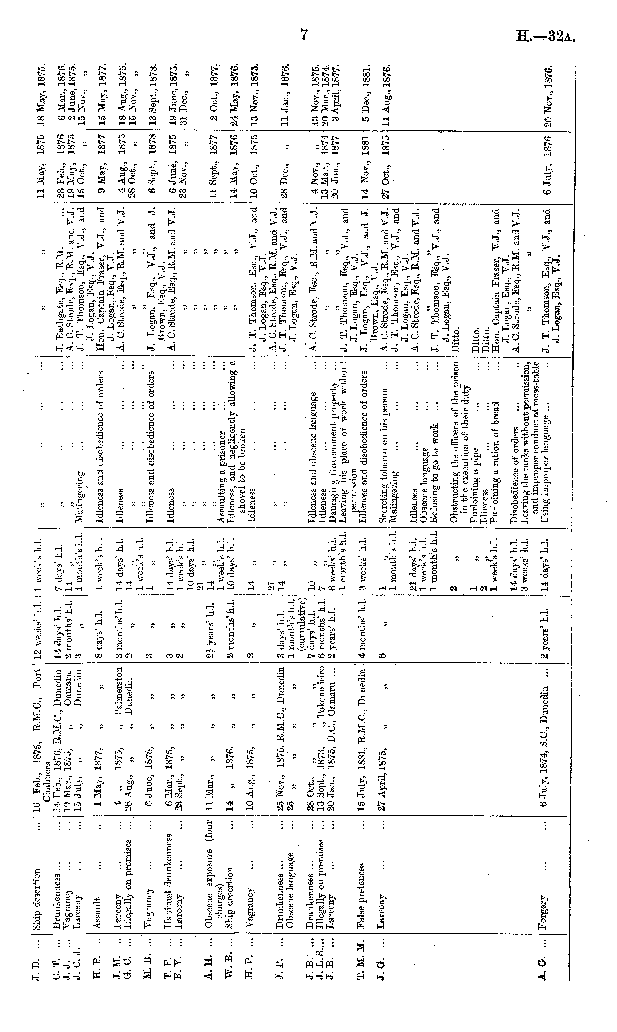 «J . XJ. C. T. ... J. J. ... J. C. J. Ship desertion Drunkenness ... Vagrancy Larceny 16 Feb., 1875, R.M.C., Port Chalmers 14 Feb., 1876, R.M.C., Dunedin 19 Mar., 1875, „ Oamaru 15 July, ,, ,, Dunedin 12 weeks' h.l. j 14 days' h.l. 2 months' h.l. 3 1 week's h.l. 7 days' h.l. 14 " „ 1 month's h.l. 33 33 J. Bathgate, Esq., R.M. A. C. Strode, Esq., R.M. and V.J. J. T. Thomson, Esq., V.J., and J. Logan, Esq., V.J. Hon. Captain Fraser, V.J., and J. Logan, Esq., V.J. A. C. Strode, Esq., R.M. and V.J. 11 May, 1875 28 Feb., 1876 19 May, 1875 15 Oct., „ 18 May, 1875. 6 Mar., 1876. 2 June, 1875. 15 Nov., „ Malingering H. P. ... Assault 1 May, 1877, „ „ 8 days' h.l. 1 week's h.l. Idleness and disobedience of orders 9 May, 1877 15 May, 1877. J. M G. C. ... Larceny Illegally on premises ... 4 „ 1875, ,, Palmerston 28 Aug., „ „ Dunedin 3 months' h.l. 2 14 davs' h.l. 14 „ 1 week's h.l. i „ Idleness 4 Aug., 1875 28 Oct., 18 Aug., 1875. 15 Nov., „ ,3 ... ... ... 33 33 M. B. ... Vagrancy 6 June, 1878, „ „ 3 3, ... ... Idleness and disobedience of orders 33 33 J. Logan, Esq., V.J., and J. Brown, Esq., V.J. A. C. Strode, Esq., R.M. and V.J. 6 Sept., 1878 13 Sept., 1878. T. F. ... F. T. ... Habitual drunkenness ... Larceny 6 Mar., 1875, 23 Sept., „ 3 2 14 days' h.l. 1 week's h.l. 10 days' h.l. 21 „ 14 „ 1 week's h.l. 10 days' h.l. Idleness 6 June, 1875 23 Nov., „ 19 June, 1875. 31 Dec, „ 33 33 Obscene exposure (four charges) Ship desertion 11 Mar., „ „ „ 2J years' h.l. 33 33 A. H. ... 33 ... ... ... 11 Sept., 1877 2 Oct., 1877. W. B. ... 14 „ 1876, „ 2 months' h.l. 3, ... ... ... Assaulting a prisoner Idleness, and negligently allowing a shovel to be broken Idleness 33 33 33 ,3 33 33 14 May, 1876 24 May, 1876. H.P. ... Vagrancy 10 Aug., 1875, „ — 33 14 „ J. T. Thomson, Esq., V.J., and J. Logan, Esq., V.J. A. C. Strode, Esq., R.M. and V.J. J. T. Thomson, Esq., V.J., and J. Logan, Esq., V.J. 10 Oct., 1875 13 Nov., 1875. J. P. ... Drunkenness ... Obscene language 25 Nov., 1875, R.M.C., Dunedin 25 „ 3 days' h.l. 1 month's h.l. (cumulative) 7 days' h.l. 6 months' h.l. 2 years' h.l. 21 ., 14 „ 33 ••• 28 Dec, ,, 11 Jan., 1876. J. B. ... J. L.S.... J. B. ... Drunkenness ... Illegally on premises ... Larceny 28 Oct., „ „ „ 13 Sept., 1873, „ Tokomairiro 20 Jan., 1875, D.C., Oamaru ... 10 „ 7 „ 6 weeks' h.l. 1 month's h.l. Idleness and obscene language Idleness Damaging Government property Leaving his place of work without permission Idleness and disobedience of orders A. C. Strode, Esq., R.M. and V.J. 4 Nov., ,, 13 Mar., 1874 20 Jan., 1877 13 Nov., 1875. 20 Mar., 1874. 3 April, 1877. 33 33 T. M. M. J. G. ... False pretences Larceny 15 July, 1881, R.M.C., Dunedin 27 April, 1875, „ 4 months' h.l. 6 3 weeks' h.l. 1 1 month's h.l. Secreting tobacco on his person Malingering 33 3, J. T. Thomson, Esq., V.J., and J. Logan, Esq., V.J. J. Logan, Esq., V.J., and J. Brown, Esq., V.J. A. C. Strode, Esq., R.M. and V.J. J. T. Thomson, Esq., V.J., and J. Logan, Esq., V.J. A. C. Strode, Esq., R.M. and V.J. 14 Nov., 1881 27 Oct., 1875 5 Dec, 1881. 11 Aug., 1876. 21 days' h.l. 1 week's h.l. 1 month's h.l. Idleness Obscene language Refusing to go to work 2 „ J. T. Thomson, Esq., V.J., and J. Logan, Esq., V.J. Ditto. 1 2 1 week's h.l. Obstructing the officers of the prison in the execution of their duty Purloining a pipe ... ■,... Idleness Purloining a ration of bread Ditto. Ditto. Hon. Captain Fraser, V.J., and J. Logan, Esq., V.J. A. C. Strode, Esq., R.M. and V.J. 14 days' h.l. 3 weeks' h.l. Disobedience of orders Leaving the ranks without permission, and improper conduct at mess-table Using improper language ... 33 33 ..Gr. ... Eorgery 6 July, 1874, S.C., Dunedin ... 2 years' h.l. 14 days' h.l. J. T. Thomson, Esq., V.J., and J. Logan, Esq., V.J. 6 July, 1876 20 Nov., 1876.