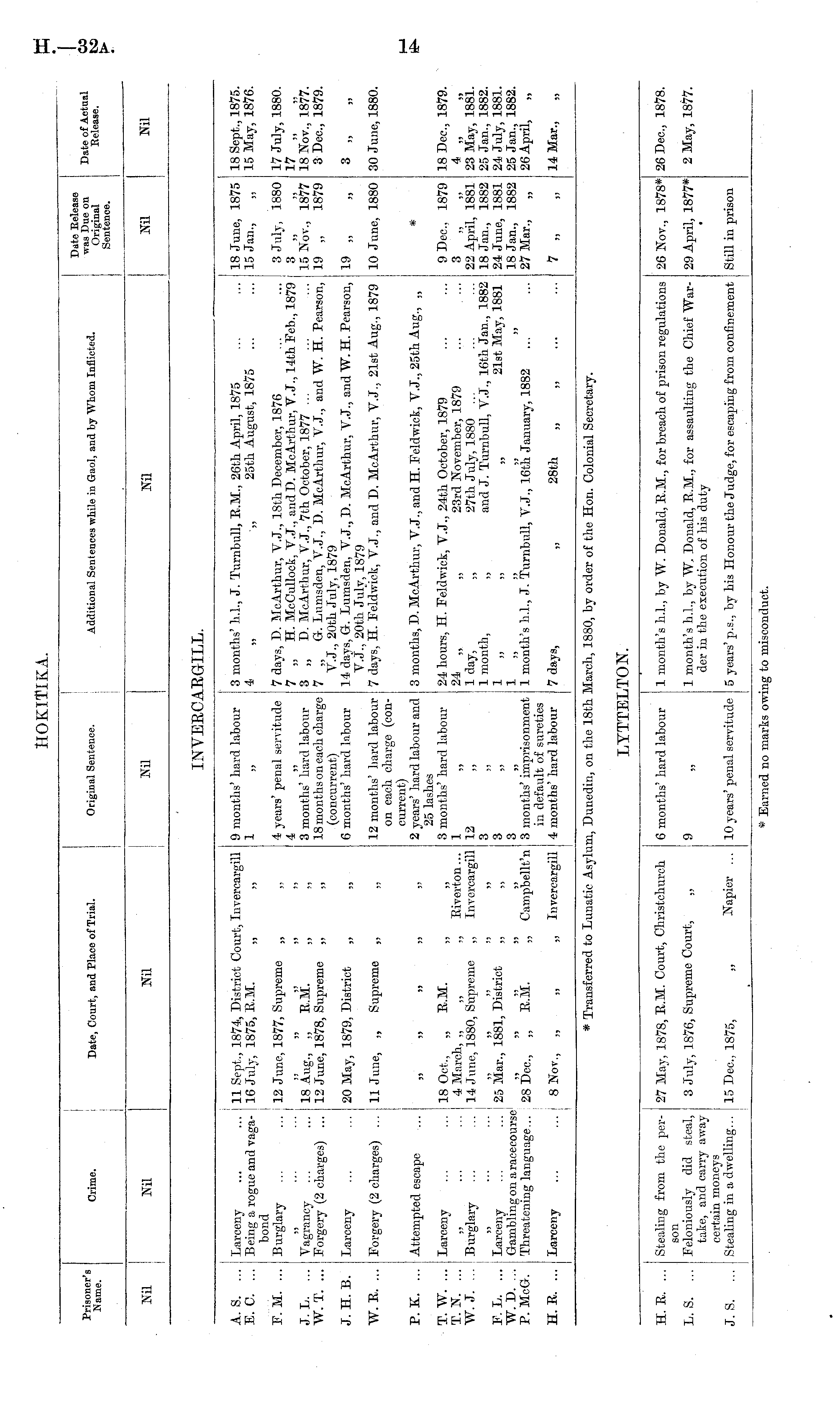 A. S. ... E. C. ... P.M. ... Larceny ... ... 11 Sept., 1874, District Court, Invercargill Being a rogue and vaga- 16 July, 1875, E.M. „ ,, bond Burglary ... ... j 12 June, 1877, Supreme „ „ Vagrancy ... ... 18 Aug., „ E.M. „ „ Forgery (2 charges) ... 12 June, 1878, Supreme „ „ 9 months' hard labour 1 4 years' penal servitude 4 3 months' hard labour 18 months on each charge (concurrent) 6 months' hard labour 3 months' h.l., J. Turnbull, E.M., 26th April, 1875 4 „ „ 25th August, 1875 7 davs, D. McArthur, V.J., 18th December, 1876 7 „ H. McCullock, V.J., and D. McArthur, V. J., 14th Feb., 1879 3 „ D. McArthur, V.J., 7th October, 1877 ... 7 „ G-. Lumsden, V.J., D. McArthur, T.J., and W. H. Pearson, V.J., 20th July, 1879 14 davs, G-. Lumsden, V. J., D. McArthur. V.J., and W. H. Pearson, Y.J., 20th July, 1879 7 days, H. Feldvrick, V.J., and D. McArthur, V.J., 21st Aug., 1879 18 June, 1875 15 Jan., ,, 3 July, 1880 3 „ 15 Not., 1877 19 „ 1879 18 Sept., 1875. 15 May, 1876. 17 July, 1880. 17 „ 18 Not., 1877. 3 Dec, 1879. J. L. ... W. T. ... J. H. B. Larceny ... ... 20 May, 1879, District „ „ 19 „ 3 „ „ W. E. ... P. K. ... T. W. ... T. N. ... W.J. ... Forgery (2 charges) ... 11 June, „ Supreme „ „ Attempted escape ... „ „ „ „ „ Larceny ... ... 18 Oct., „ E.M. ,, ... ... 4 March, ,, „ ,, Biverton... Burglary ... ... 14 June, 1880, Supreme ,, Invercargill 12 months' hard labour on each charge (eoncurrent) 2 years' hard labour and 25 lashes 3 months' hard labour 12 3 3 3 months' imprisonment in default of sureties 4 months' hard labour 3 months, D. McArthur, V.J., and H. Feldwick, V.J., 25th Aug., „ 24 hours, H. Feldwick, T.J., 24th October, 1879 24 „ „ 23rd November, 1879 1 day, „ 27th July, 1880 ... 1 month, „ and J. Turnbull, V.J., 16th Jan., 1882 1 „ „ „ 21st May, 1881 1 month's h.l., J. Turnbull, V.J., 16th January, 1882 ... 10 June, 1880 # 9 Dec. 1879 3 „ „ 22 April, 1881 18 Jan., 1882 24 June, 1881 18 Jan., 1882 27 Mar., „ 30 June, 1880. 18 Dec, 1879. 4 „ 23 May, 1881. 25 Jan., 1882. 24 July, 1881. 25 Jan., 1882. 26 April, ,, F. L. ... W. D. ... P. McG. I „ Larceny ... ... | 25 Mar., 1881, District „ „ Gambling on a racecourse 1 ,, „ ,, ,, „ Threatening language... 28 Dec, „ E.M. „ Campbellt'n H. E. ... Larceny ... ... 8 Nov., „ „ ,> Invercargill 7 days, „ 28th „ „ 1 „ 14 Mar., „ * Transferred to Lunatic Asylum, Dunedin, on the 18th March, 1880, by order of the Hon. Colonial Secretary.