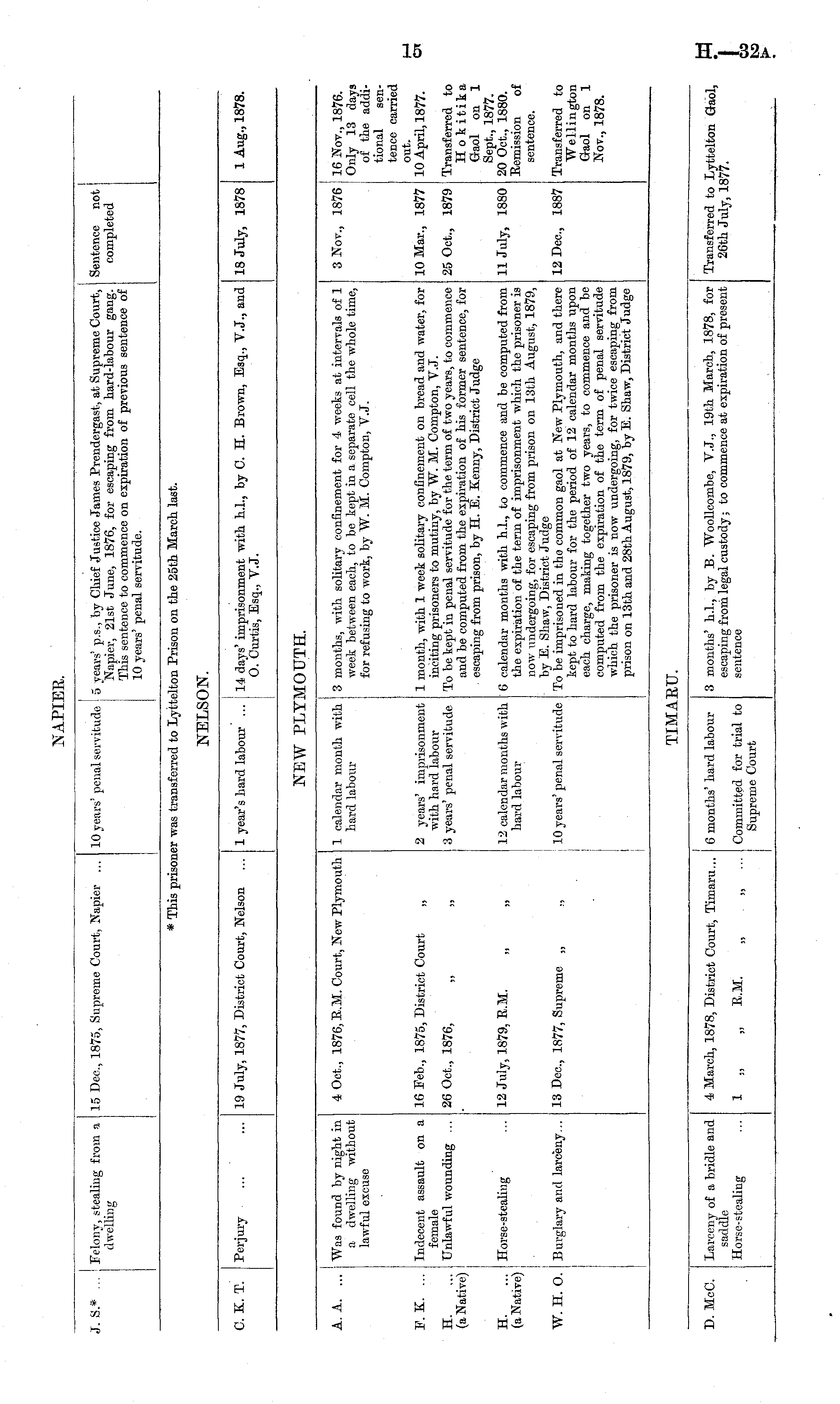 . A. ... Was found by night in a dwelling without lawful excuse 4 Oct., 1876, R.M. Court, New Plymouth 1 calendar month with hard labour 3 months, with solitary confinement for 4 weeks at intervals of 1 week between each, to be kept in a separate cell the whole time, for refusing to work, by W. M. Compton, V.J. 3 Nov., 1876 16 Nov., 1876. Only 13 days of the additional sentence carriec out. 10 April, 1877. Indecent assault on a female Unlawful wounding ... 16 Feb., 1875, District Court 26 Oct., 1876, 2 years' imprisonment with hard labour 3 years' penal servitude 1 month, with 1 week solitary confinement on bread and water, for inciting prisoners to mutiny, by W. M. Compton, V.J. To be kept in penal servitude for the term of two years, to commence and be computed from the expiration of his former sentence, for escaping from prison, by H. E. Kenny, District Judge 10 Mar., 1877 F. K. ... H. (a Native) 25 Oct., 1879 Transferred tc Hokitika Gaol on 1 Sept., 1877. 20 Oct., 1880. Remission oJ sentence. H. (a Native) Horse-stealing 12 July, 1879, R.M. 12 calendar months with hard labour 6 calendar months with h.l., to commence and be computed from the expiration of the term of imprisonment which the prisoner is now undergoing, for escaping from prison on 13th August, 1879, by E. Shaw, District Judge To be imprisoned in the common gaol at New Plymouth, and there kept to hard labour for the period of 12 calendar months upon each charge, making together two years, to commence and be computed from the expiration of the term of penal servitude which the prisoner is now undergoing, for twice escaping from prison on 13th and 28th August, 1879, by E. Shaw, District Judge 11 July, 1880 W. H. O. Burglary and larceny... 13 Dec, 1877, Supreme „ 10 years' penal servitude 12 Dec, 1887 Transferred tc Wellingtor Gaol on 1 Nov., 1878. j