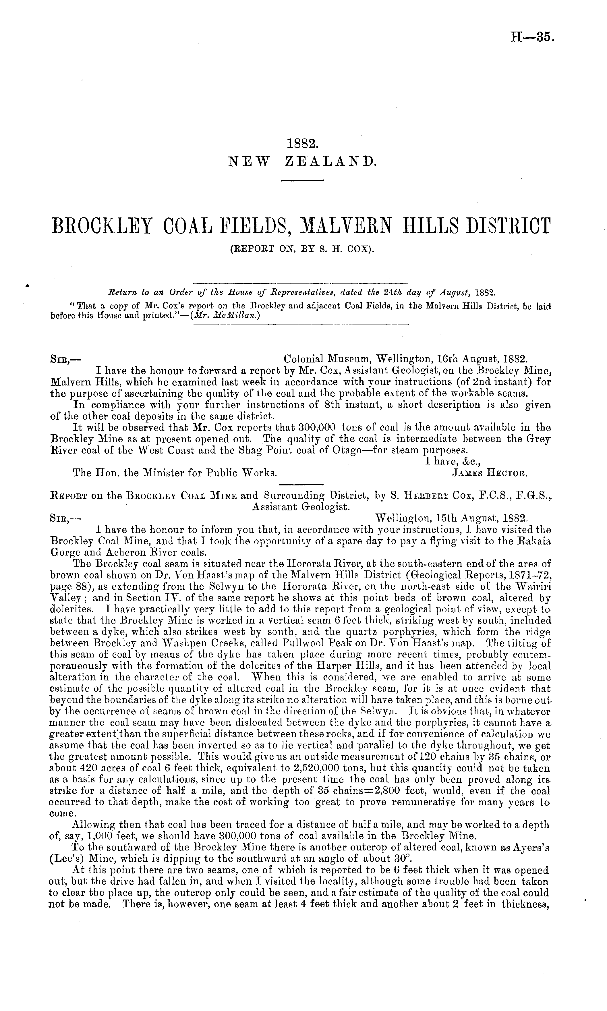 Sib, — Colonial Museum, Wellington, 16th August, 1882. I have the honour to forward a report by Mr. Cox, Assistant Geologist, on the Brockley Mine, Malvern Hills, which he examined last week in accordance with your instructions (of 2nd instant) for the purpose of ascertaining the quality of the coal and the probable extent of the workable seams. In compliance with your further instructions of Bth instant, a short description is also given of the other coal deposits in the same district. It will be observed that Mr. Cox reports that 300,000 tons of coal is the amount available in the Brockley Mine as at present opened out. The quality of the coal is intermediate between the Grey River coal of the West Coast and the Shag Point coal of Otago —for steam purposes. I have, &c, The Hon. the Minister for Public Works. James Hectoe.