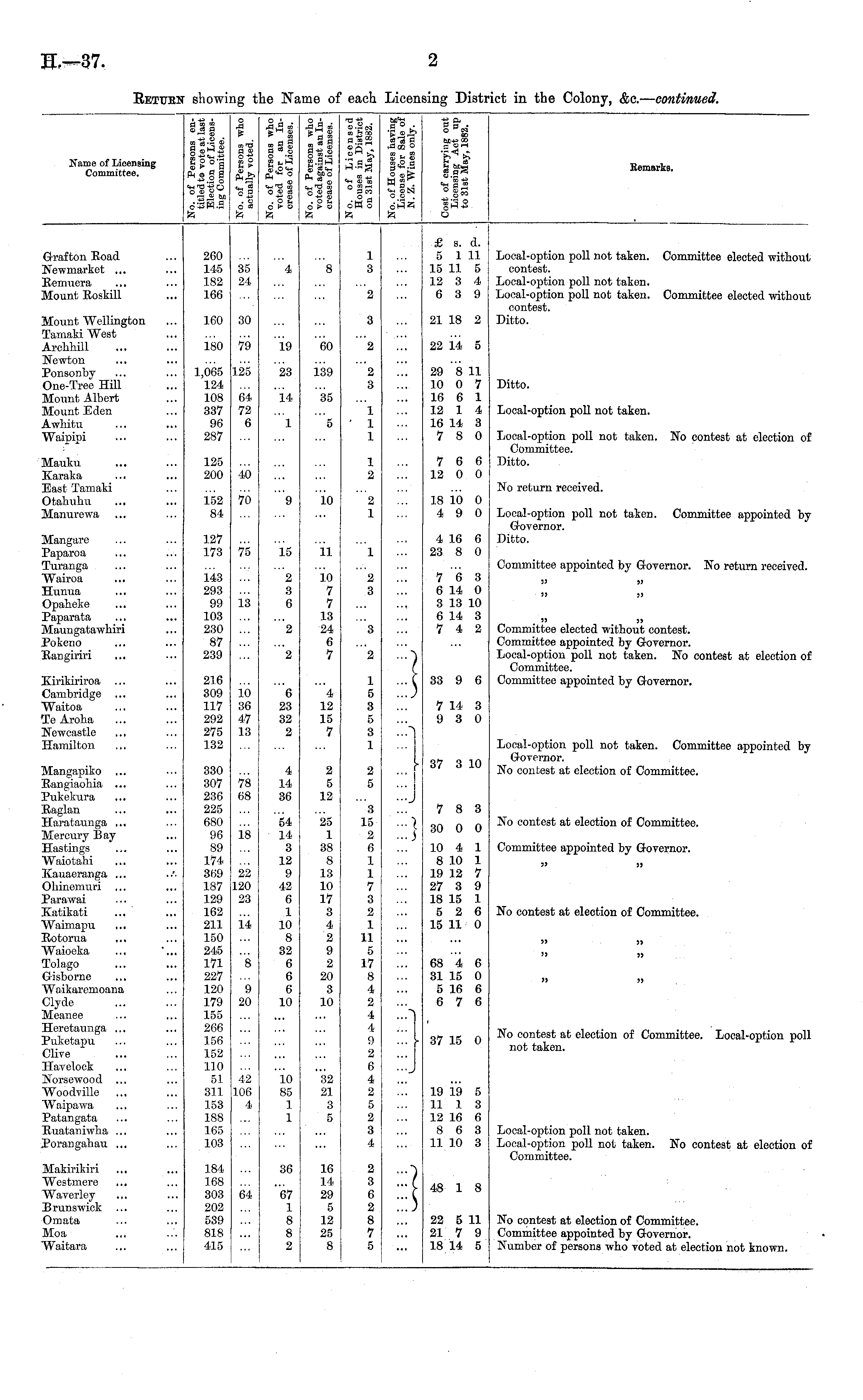 _Same of Licensing Committee. lis r\ i^S P4 o g a c » 9 r2_2> fcjj o'-SH-S o So U r~ "31 ft lis to « fl 1 * 5 Ph^ ° 0«)(8 • P o > o _■ fl« *_! 03 * S S.SS &¥* ° +s © . O fc. o f* « to - °ss oK o p tr P a * O "^(M so $*& o.Sj tMo| §H_ Q Remarks. Grafton Road Newmarket ... Remuera Mount Roskill 260 145 182 166 35 24 4 8 1 3 £ s. d. 5 1 11 15 11 5 12 3 4 6 3 9 Local-option poll not taken. Committee elected without contest. Local-option poll not taken. Local-option poll not taken. Committee elected without contest. Ditto. "a Mount Wellington Tamaki West Archhill Newton Ponsonby One-Tree Hill Mount Albert Mount Eden Awhitu Waipipi Mauku Karaka East Tamaki Otahuhu Manurewa 160 30 3 21 18 2 180 79 19 60 2 22 14 5 1,065 124 108 337 96 287 125 23 139 2 3 29 8 11 10 0 7 16 6 1 12 1 4 16 14 3 7 8 0 Ditto. 64 72 6 14 35 1 1 1 Local-option poll not taken. 1 5 7 6 6 12 0 0 Local-option poll not taken. No contest at election of Committee. Ditto. 125 200 40 1 2 152 84 70 9 10 2 1 18 10 0 4 9 0 No return received. Local-option poll not taken. Committee appointed by Governor. Ditto. Mangare Paparoa Turanga Wairoa Hunua Opaheke Paparata Maungatawhiri Pokeno Rangiriri 127 173 75 15 11 1 4 16 6 23 8 0 143 293 99 103 230 87 239 2 8 6 10 7 7 13 24 6 7 2 3 7 6 3 6 14 0 3 13 10 6 14 3 7 4 2 Committee appointed by Governor. No return received. 35 33 13 33 ,5 "a 2 3 2 33 9 6 33 ,, Committee elected without contest. Committee appointed by Governor. Local-option poll not taken. No contest at election of Committee. Committee appointed by Governor. Kirikiriroa Cambridge ... Waitoa Te Aroha Newcastle Hamilton 216 309 117 292 275 132 10 36 47 13 6 23 32 2 4 12 15 7 1 5 3 5 3 1 7 14 3 9 3 0 ... ! ... j -J 37 3 10 Local-option poll not taken. Committee appointed by Governor. No contest at election of Committee. Mangapiko ... Rangiaohia ... Pukekura Raglan Harataunga ... Mercury Bay Hastings Waiotahi Kauaeranga ... Ohinemuri ... Parawai Katikati Waimapu ... Rotorua Waioeka Tolago Gisborne Waikarcmoana Clyde Meanee Heretaunga ... Puketapu Clive Havelock Norsewood ... Woodville Waipawa Patangata Ruataniwha ... Porangahau ... 330 307 236 225 680 96 89 174 369 187 129 162 211 150 245 171 227 120 179 155 266 156 152 110 51 311 153 188 165 103 78 68 18 22 120 23 14 "8 4 14 36 54 14 3 12 9 42 6 1 10 8 32 6 6 6 10 2 5 12 25 1 38 8 13 10 17 3 4 2 9 2 20 3 10 2 5 8 15 2 6 1 1 7 3 2 1 11 5 17 8 4 2 4 4 9 2 6 4 2 5 2 3 4 ...j 7 8 3 30 0 0 10 4 1 8 10 1 19 12 7 27 3 9 18 15 1 5 2 6 15 11 0 68 4 6 31 15 0 5 16 6 6 7 6 No contest at election of Committee. Committee appointed by Governor. 33 33 No contest at election of Committee. 33 55 33 55 9 20 33 » ... > 37 15 0 No contest at election of Committee. Local-option poll not taken. 42 106 4 10 85 1 1 32 21 3 5 19 19 5 11 1 3 12 16 6 8 6 3 11 10 3 Local-option poll not taken. Local-option poll not taken. No contest at election of Committee. Makirikiri Westmere Waverley Brunswick Omata 184 168 303 202 539 818 415 64 36 67 1 8 8 2 16 14 29 5 12 25 8 2 3 6 2 8 7 5 :::! 48 1 8 Moa Waitara 22 5 11 21 7 9 18 14 5 No contest at election of Committee. Committee appointed by Governor. Number of persons who voted at election not known.