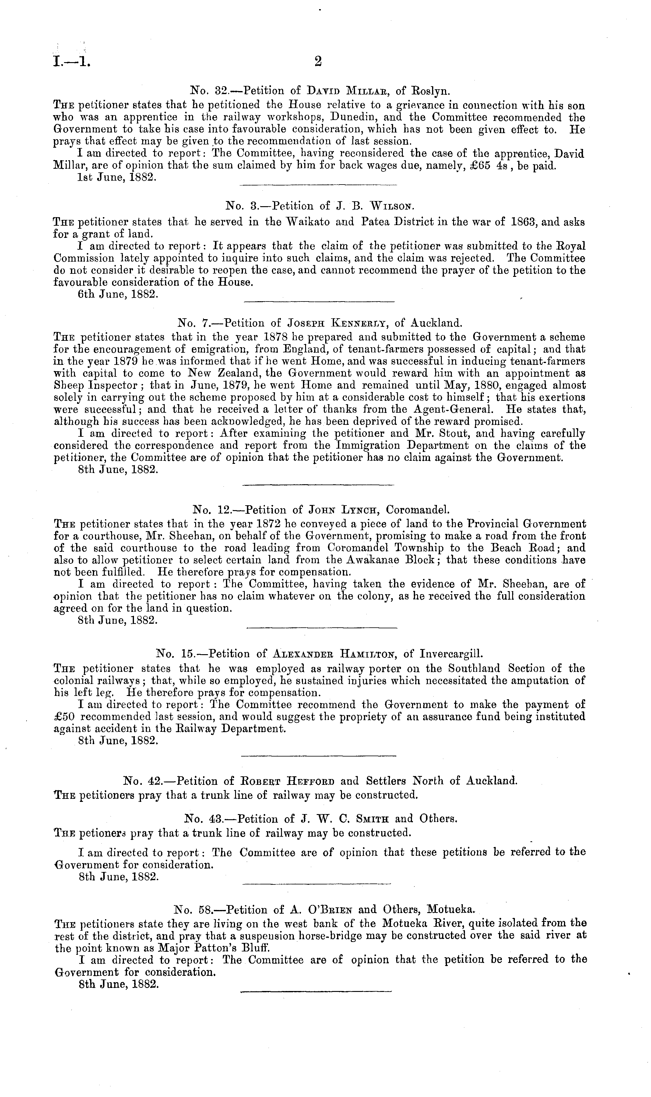 No. 32.—Petition of Dayid Millar, of Roslyn. The petitioner states that he petitioned the House relative to a grievance in connection with his son who was an apprentice in the railway workshops, Dunedin, and the Committee recommended the Government to take his case into favourable consideration, which has not been given effect to. He prays that effect may be given to the recommendation of last session. lam directed to report: The Committee, having reconsidered the case of the apprentice, David Millar, are of opinion that the sum claimed by him for back wages due, namely, £65 4s , be paid. Ist June, 1882.