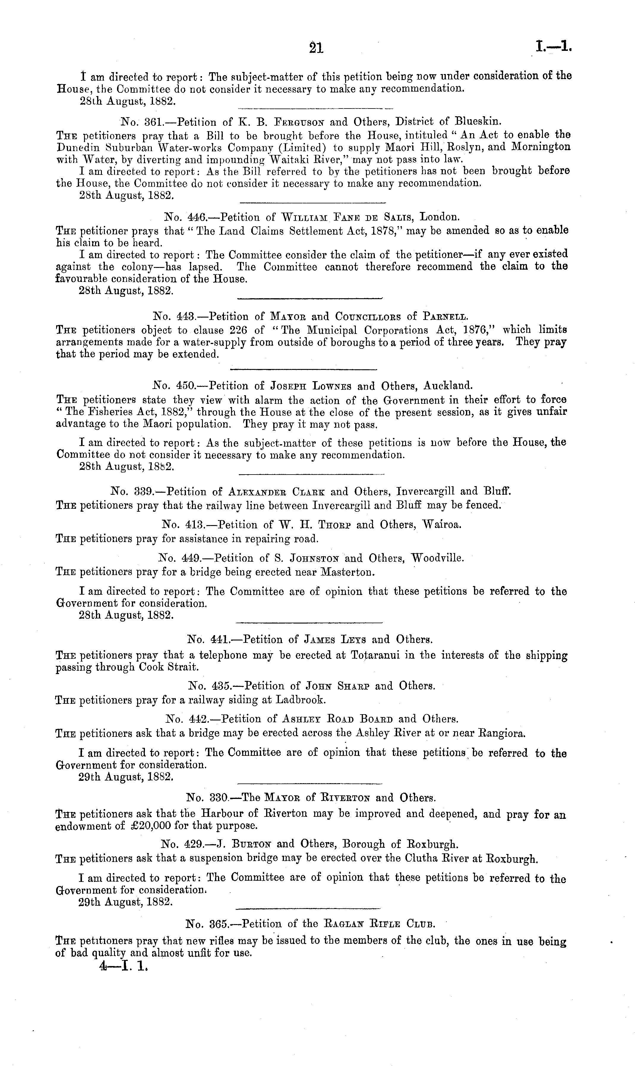 No. 330.—The Mayor of Rivebton and Others. The petitioners ask that the Harbour of Riverton may be improved and deepened, and pray for an endowment of £20,000 for that purpose. No. 429.—J. Bitbton and Others, Borough of Roxburgh. The petitioners ask that a suspension bridge may be erected over the Clutha River at Roxburgh. lam directed to report: The Committee are of opinion, that these petitions be referred to the Government for consideration. 29th August, 1882.