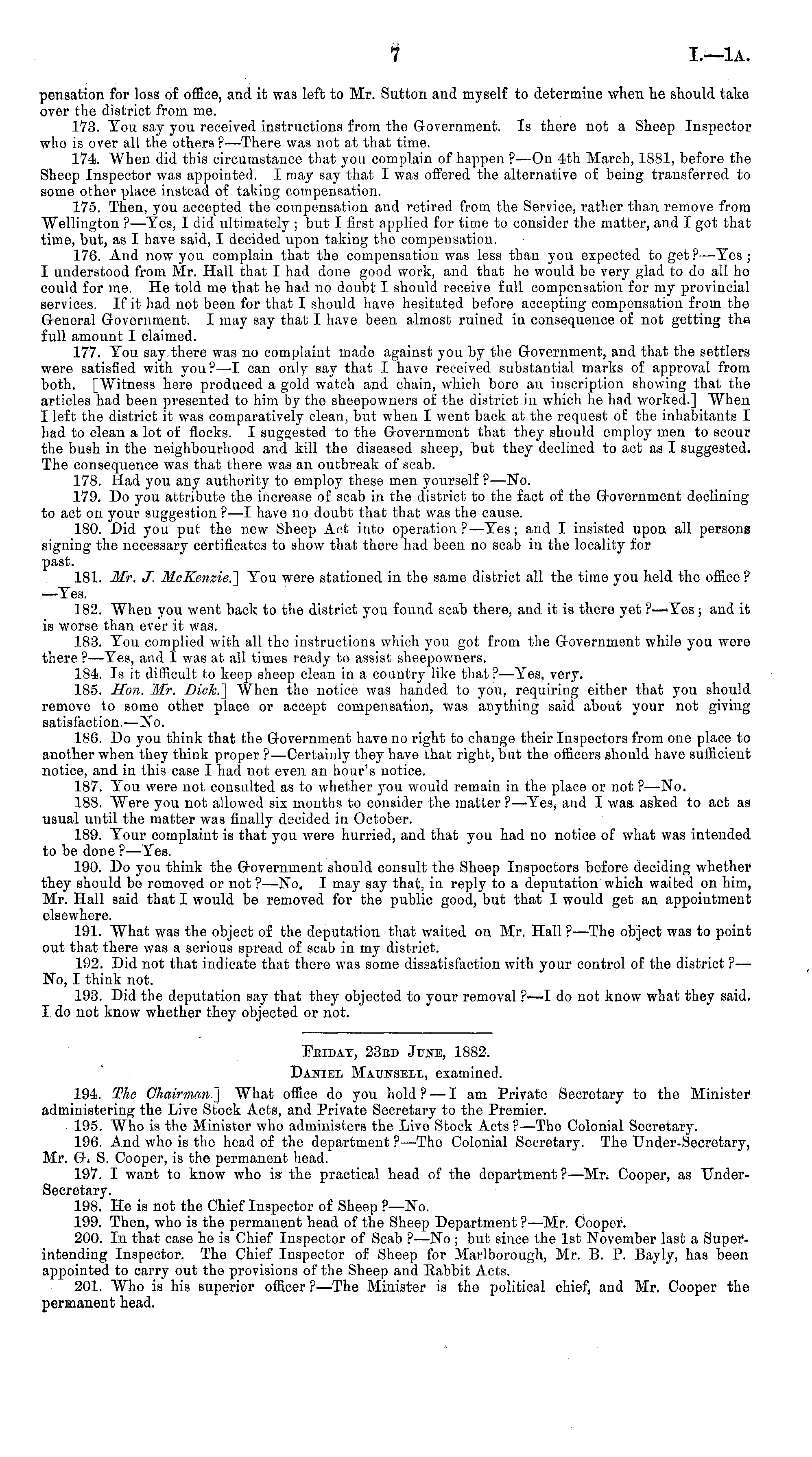 Fbidat, 23rd June, 1882. Danieii Maunsell, examined. 194. The Chairman'] What office do you hold? — I am Private Secretary to the Minister1 administering the Live Stock Acts, and Private Secretary to the Premier. 195. Who is the Minister who administers the Live Stock Acts ? —The Colonial Secretary. 196. And who is the head of the department ? —The Colonial Secretary. The ITnder-Seeretary, Mr. GK S. Cooper, is the permanent head. 197. I want to know who is- the practical head of the department ?—Mr. Cooper, as Undersecretary. 198. He is not the Chief Inspector of Sheep ?—No. 199. Then, who is the permanent head of the Sheep Department ?—Mr. Cooper. 200. In that case he is Chief Inspector of Scab ?—No ; but since the Ist November last a Superintending Inspector. The Chief Inspector of Sheep for Marlborough, Mr. B. P. Bayly, has been appointed to carry out the provisions of the Sheep and Rabbit Acts. 201. Who is his superior officer ?—The Minister is the political chief, and Mr. Cooper the permanent head.