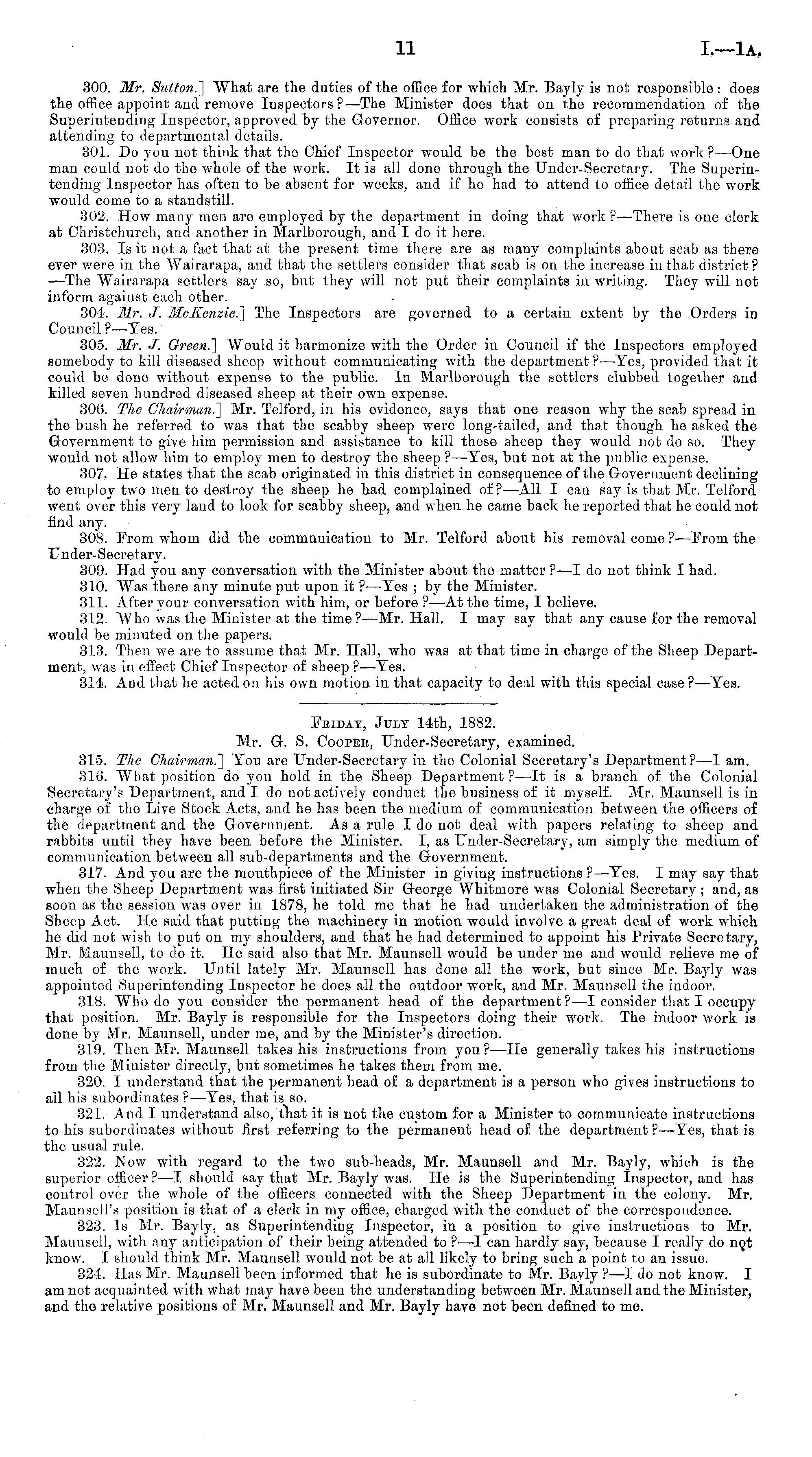 Fbiday, July 14th, 1882. Mr. G. S. Cooper, Under-Secretary, examined. 315. The Chairman.'] You. are Under-Secretary in the Colonial Secretary's Department? —1 am. 316. What position do you hold in the Sheep Department ? —lt is a branch of the Colonial Secretary's Department, and I do not actively conduct the business of it myself. Mr. Maunsell is in charge of tho Live Stock Acts, and he has been the medium of communication between the officers of the department and the Government. As a rule Ido not deal with papers relating to sheep and rabbits until they have been before the Minister. I, as Under-Secretary, am simply the medium of communication between all sub-departments and the Government. 317. And you are the mouthpiece of the Minister in giving instructions ? —Yes. I may say that when the Sheep Department was first initiated Sir George Whitmore was Colonial Secretary ; and, as soon as the session was over in 1878, he told me that he had undertaken the administration of the Sheep Act. He said that putting the machinery in motion would involve a great deal of work which he did not wish to put on my shoulders, and that he had determined to appoint his Private Secretary, Mr. Maunsell, to do it. He said also that Mr. Maunsell would be under me and would relieve me of much of the work. Until lately Mr. Maunsell has done all the work, but since Mr. Bayly was appointed Superintending Inspector he does all the outdoor work, and Mr. Maunsell the indoor. 318. Who do you consider the permanent head of the department?' —I consider tliat I occupy that position. Mr. Bayly is responsible for the Inspectors doing their work. The indoor work is done by Mr. Maunsell, under me, and by the Minister's direction. 319. Then Mr. Maunsell takes his instructions from you? —He generally takes his instructions from the Minister directly, but sometimes he takes them from me. 320. I understand that the permanent head of a department is a person who gives instructions to all his subordinates ? —Yes, that is so. 321. And I understand also, that it is not the custom for a Minister to communicate instructions to his subordinates without first referring to the permanent head of the department ?—Yes, that is the usual rule. 322. Now with regard to the two sub-heads, Mr. Maunsell and Mr. Bayly, which is the superior officer? —I should say that Mr. Bayly was. He is the Superintending Inspector, and has control over the whole of the officers connected with the Sheep Department in the colony. Mr. Maunsell's position is that of a clerk in my office, charged with the conduct of the correspondence. 323. Is Mr. Bayly, as Superintending Inspector, in a position to give instructions to Mr. Maunsell, with any anticipation of their being attended to ? —-I can hardly say, because I really do no_t know. I should think Mr. Maunsell would not be at all likely to bring such a point to an issue. 324. Has Mr. Maunsell been informed that he is subordinate to Mr. Bayly ? —I do not know. I am not acquainted with what may have been the understanding between Mr. Maunsell and the Minister, and the relative positions of Mr. Maunsell and Mr. Bayly have not been defined to me.
