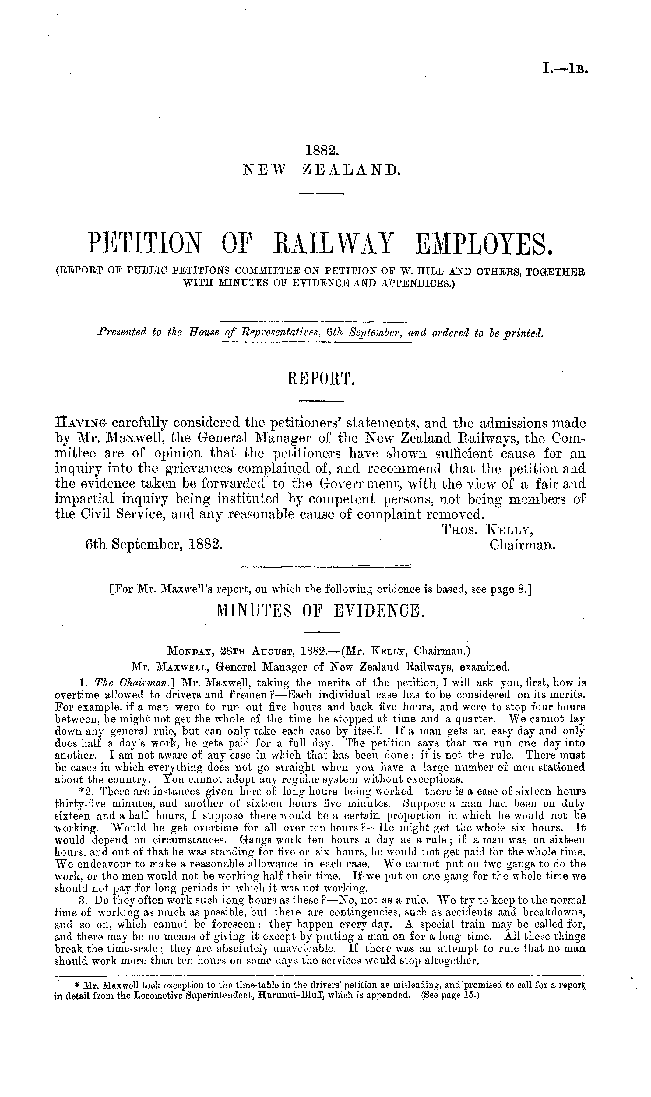 REPORT. Having carefully considered the petitioners' statements, and the admissions made by Mr. Maxwell, the General Manager of the New Zealand Railways, the Committee are of opinion that the petitioners have shown sufficient cause for an inquiry into the grievances complained of, and recommend that the petition and the evidence taken be forwarded to the Government, with the view of a fair and impartial inquiry being instituted by competent persons, not being members of the Civil Service, and any reasonable cause of complaint removed. Thos. Kelly, 6th September, 1882. Chairman.
