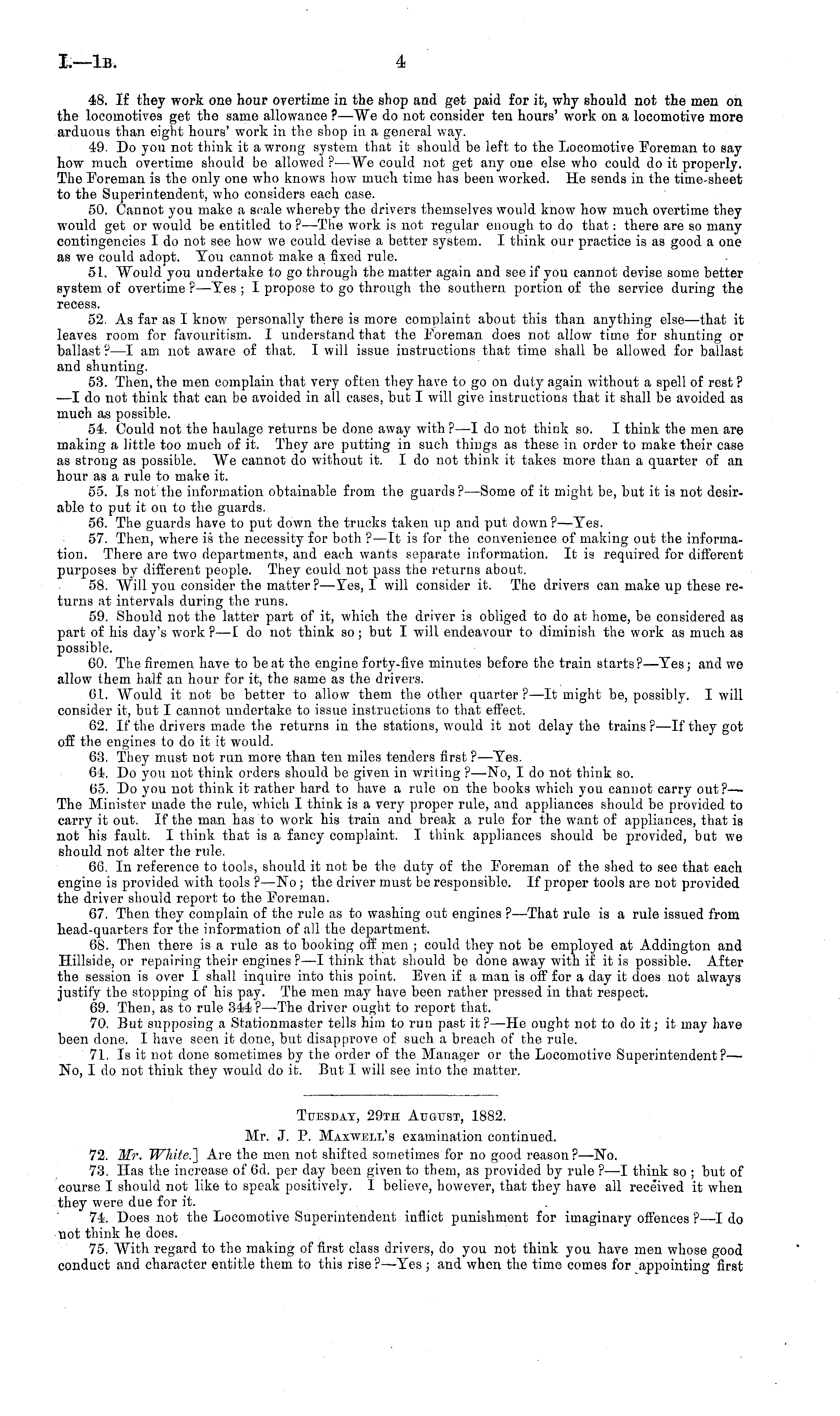 Tuesday, 29th August, 1882. Mr. J. P. Maxwell's examination continued. 72. Mr. White.] Are the men not shifted sometimes for no good reason?—No. 73. Has the increase of Cd. per day been given to them, as provided by rule ?—I think so ; but of course I should not like to speak positively. 1 believe, however, that they have all received it when they were due for it. 74. Does not the Locomotive Superintendent inflict punishment for imaginary offences ?—I do not think he does. 75. With regard to the making of first class drivers, do you not think you have men whose good conduct and character entitle them to this rise?—Tes ; and when the time comes for appointing first