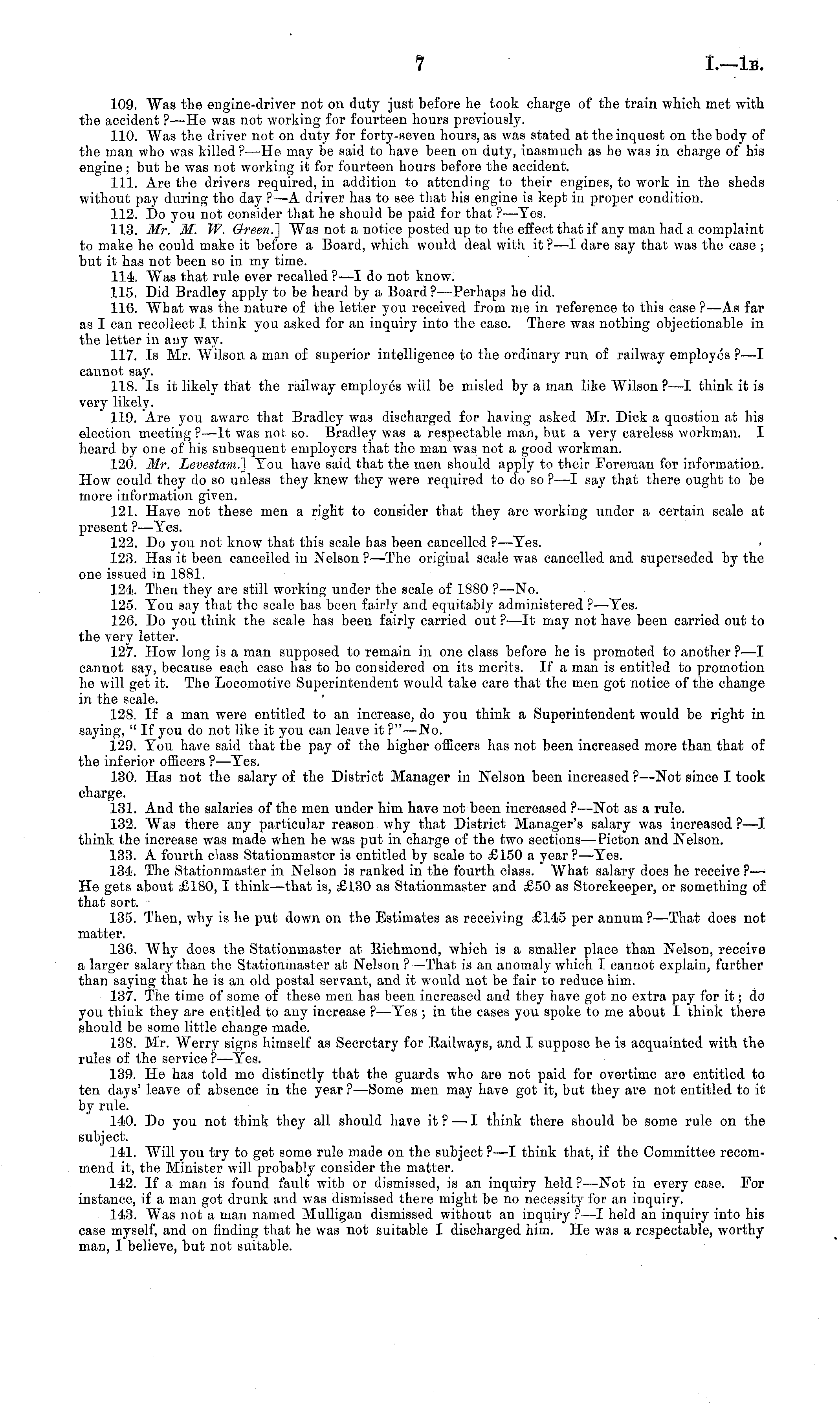 109. Was the engine-driver not on duty just before he took charge of the train which met with the accident ? —He was not working for fourteen hours previously. 110. Was the driver not on duty for forty-seven hours, as was stated at the inquest on the body of the man who was killed ? —He may be said to have been on duty, inasmuch as he was in charge of his engine; but he was not working it for fourteen hours before the accident. 111. Are the drivers required, in addition to attending to their engines, to work in the sheds without pay during the day ?—A driver has to see that his engine is kept in proper condition. 112. Do you not consider that he should be paid for that ? —Tes. 113. Mr. M. W. Green.] Was not a notice posted up to the effect that if any man had a complaint to make he could make it before a Board, which would deal with it ?—-I dare say that was the case ; but it has not been so in my time. 114. Was that rule ever recalled ?—I do not know. 115. Did Bradley apply to be heard by a Board? —Perhaps he did. 116. What was the nature of the letter you received from me in reference to this case ?—-As far as I can recollect 1 think you asked for an inquiry into the case. There was nothing objectionable in the letter in any way. 117. Is Mr. Wilson a man of superior intelligence to the ordinary run of railway employes ?—I cannot say. 118. Is it likely that the railway employes will be misled by a man like Wilson ? —I think it is very likely. 119. Are you aware that Bradley was discharged for having asked Mr. Dick a question at his election meeting ? —lt was not so. Bradley was a respectable man, but a very careless workman. I heard by one of his subsequent employers that the man was not a good workman. 120. Mr. Levestam^] Tou have said that the men should apply to their Foreman for information. How could they do so unless they knew they were required to do so ? —I say that there ought to be more information given. 121. Have not these men a right to consider that they are working under a certain scale at present ?—Tes. 122. Do you not know that this scale has been cancelled ? —Tes. 123. Has it been cancelled in Nelson ? —The original scale was cancelled and superseded by the one issued in 1881. 124. Then they are still working under the scale of 1880 ?—No. 125. Tou say that the scale has been fairly and equitably administered ?—Tes. 126. Do you think the scale has been fairly carried out ? —lt may not have been carried out to the very letter. 127. How long is a man supposed to remain in one class before he is promoted to another ?—I cannot say, because each case has to be considered on its merits. If a man is entitled to promotion he will get it. The Locomotive Superintendent would take care that the men got notice of the change in the scale. 128. If a man were entitled to an increase, do you think a Superintendent would be right in saying, " If you do not like it you can leave it ?" —No. 129. Tou have said that the pay of the higher officers has not been increased more than that of the inferior officers ?—Tes. 130. Has not the salary of the District Manager in Nelson been increased ?—Not since I took charge. 131. And the salaries of the men under him have not been increased ?—-Not as a rule. 132. Was there any particular reason why that District Manager's salary was increased ? —I think the increase was made when he was put in charge of the two sections—Picton and Nelson. 133. A fourth class Stationmaster is entitled by scale to £150 a year? —Tes. 134. The Stationmaster in Nelson is ranked in the fourth class. What salary does he receive ?—- He gets about £180, I think—that is, £130 as Stationmaster and £50 as Storekeeper, or something of that sort. * 135. Then, why is he put down on the Estimates as receiving £145 per annum ? —That does not matter. 136. Why does the Stationmaster at Richmond, which is a smaller place than Nelson, receive a larger salary than the Stationmaster at Nelson ? —That is an anomaly which I cannot explain, further than saying that he is an old postal servant, and it would not be fair to reduce him. 137. The time of some of these men has been increased and they have got no extra pay for it; do you think they are entitled to any increase ? —Tes ; in the cases you spoke to me about I think there should be some little change made. 138. Mr. Werry signs himself as Secretary for Railways, and I suppose he is acquainted with the rules of the service ?—Tes. 139. He has told me distinctly that the guards who are not paid for overtime are entitled to ten days' leave of absence in the year? —Some men may have got it, but they are not entitled to it by rule. 140. Do you not think they all should have it ?— I think there should be some rule on the subject. 141. Will you try to get some rule made on the subject ?—I think that, if the Committee recommend it, the Minister will probably consider the matter. 142. If a man is found fault with or dismissed, is an inquiry held?—Not in every case. For instance, if a man got drunk and was dismissed there might be no necessity for an inquiry. 143. Was not a man named Mulligan dismissed without an inquiry ? —I held an inquiry into his case myself, and on finding that he was not suitable I discharged him. He was a respectable, worthy man, I believe, but not suitable.
