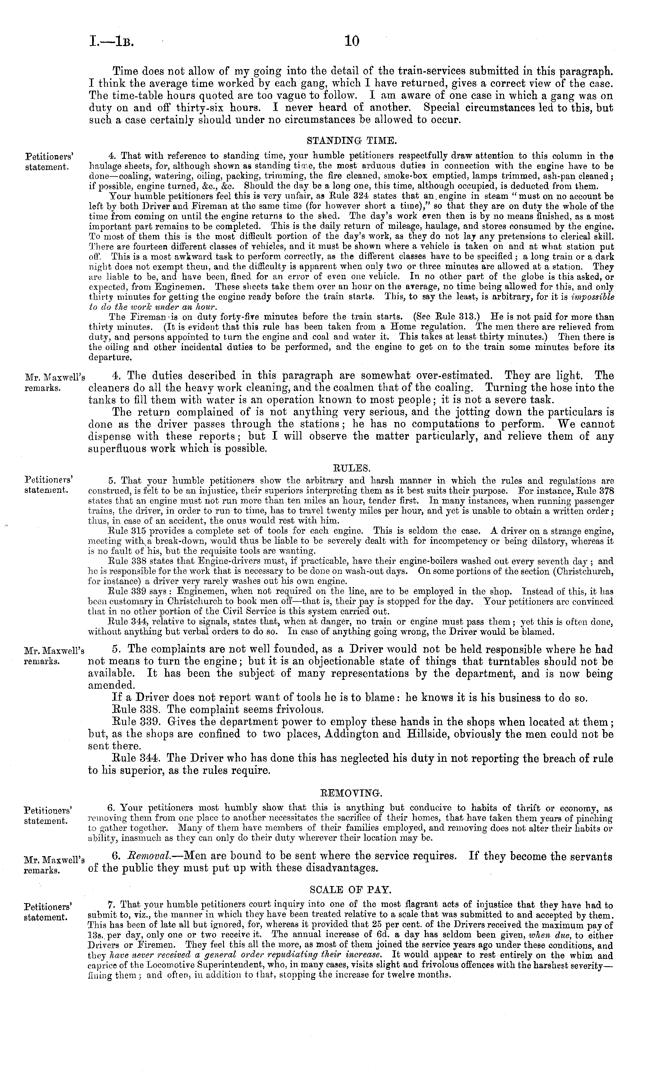 Time does not allow of my going into the detail of the train-services submitted in this paragraph. I think the average time worked by each gang, which I have returned, gives a correct view of the case. The time-table hours quoted are too vague to follow. I am aware of one case in which a gang was on duty on and off thirty-six hours. I never heard of another. Special circumstances led to this, but such a case certainly should under no circumstances be allowed to occur. STANDING TIME. 4. That with reference to standing time, your humble petitioners respectfully draw attention to this column in the haulage sheets, for, although shown as standing ti-re, the most arduous duties in connection with the engine have to be done—coaling, watering, oiling, packing, trimming, the fire cleaned, smoke-box emptied, lamps trimmed, ash-pan cleaned; if possible, engine turned, &c, &c. Should the day be a long one, this time, although occupied, is deducted from them. Your humble petitioners feel this is very unfair, as Eule 324 states that an.engine in steam "must on no account be left by both Driver and Fireman at the same time (for however short a time)," so that they are on duty the whole of the time from coming on until the engine returns to the shed. The day's work ereu then is by no means finished, as a most important part remains to be completed. This is the daily return of mileage, haulage, and stores consumed by the engine. To most of them this is the most difficult portion of the day's work, as they do not lay any pretensions to clerical skill. There are fourteen different classes of vehicles, and it must be shown where a vehicle is taken on and at what station put off. This is a most awkward task to perform correctly, as the different classes have to be specified ; a long train or a dark night does not exempt them, and the difficulty is apparent when only two or three minutes are allowed at a station. They are liable to be, and have been, fined for an error of even one vehicle. In no other part of the globe is this asked, or expected, from _snginemen. These sheets take them over an hour on the average, no time being allowed for this, and only thirty minutes for getting the engine ready before the train starts. This, to say the least, is arbitrary, for it is impossible to do the work under an hour. The Fireman is on duty forty-five minutes before the train starts. (See Eule 313.) He is not paid for more than thirty minutes. (It is evident that this rule has been taken from a Home regulation. The men there are relieved from duty, and persons appointed to turn the engine and coal and water it. This takes at least thirty minutes.) Then there is the oiling and other incidental duties to be performed, and the engine to get on to the train some minutes before its departure. 4. The duties described in this paragraph are somewhat over-estimated. They are light. The cleaners do all the heavy work cleaning, and the coalmen that of the coaling. Turning the hose into the tanks to fill them with water is an operation known to most people; it is not a severe task. The return complained of is not anything very serious, and the jotting down the particulars is done as the driver passes through the stations; he has no computations to perform. We cannot dispense with these reports; but I will observe the matter particularly, and relieve them of any superfluous work which is possible. EHLES. 5. That your humble petitioners show the arbitrary and harsh manner in which the rules and regulations are construed, is felt to be an injustice, their superiors interpreting them as it best suits their purpose. For instance, Eule 378 states that an engine must not run more than ten miles an hour, tender first. In many instances, w-hen running passenger trains, the driver, in order to run to time, has to travel twenty miles per hour, and yet is unable to obtain a written order; thus, in case of an accident, the onus would rest with him. Eule 315 provides a complete set of tools for each engine. This is seldom the ease. A driver on a strange engine, meeting witi\a break-down, would thus be liable to be severely dealt with for incompetency or being dilatory, whereas it is no fault of his, but the requisite tools are wanting. Eule 338 states that Engine-drivers must, if practicable, have their engine-boilers washed out every seventh day ; and he is responsible for the work that is necessary to be done on wash-out days. On some portions of the section (Christchureh, for instance) a driver very rarely washes out his own engine. Eule 339 says : Enginemen, when not required on the line, are to he employed in tho shop. Instead of this, it has been customary in Christchureh to book men off —that is, their pay is stopped for the day. Your petitioners are convinced that in no other portion of the Civil Service is this system carried out. Eule 344, relative to signals, states that, when at danger, no train or engine must pass them; yet this is often done, without anything hut verbal orders to do so. In case of anything going wrong, the Driver would be blamed. 5. The complaints are not well founded, as a Driver would not be held responsible where he had not means to turn the engine; but it is an objectionable state of things that turntables should not be available. It has been the subject of many representations by the department, and is now being amended. If a Driver does not report want of tools he is to blame: he knows it is his business to do so. Rule 338. The complaint seems frivolous. Rule 339. Gives the department power to employ these hands in the shops when located at them; but, as the shops are confined to two places, Addington and Hillside, obviously the men could not be sent there. Rule 344. The Driver who has done this has neglected his duty in not reporting the breach of rule to his superior, as the rules require. EEMOYING. 6. Your petitioners most humbly show that this is anything but conducive to habits of thrift or econom