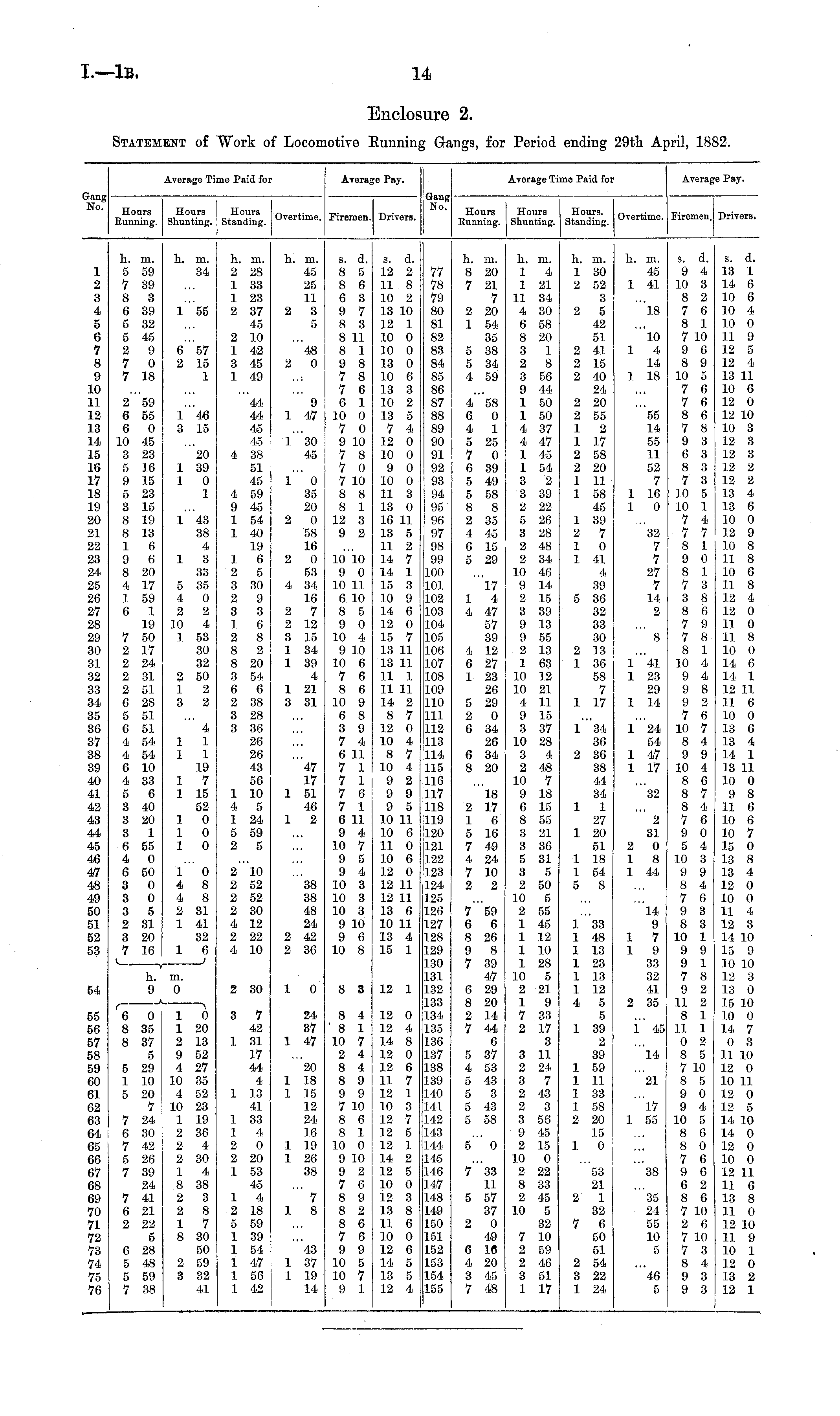 Enclosure 2. Statement of Work of Locomotive Running Gangs, for Period ending 29th April, 1882.