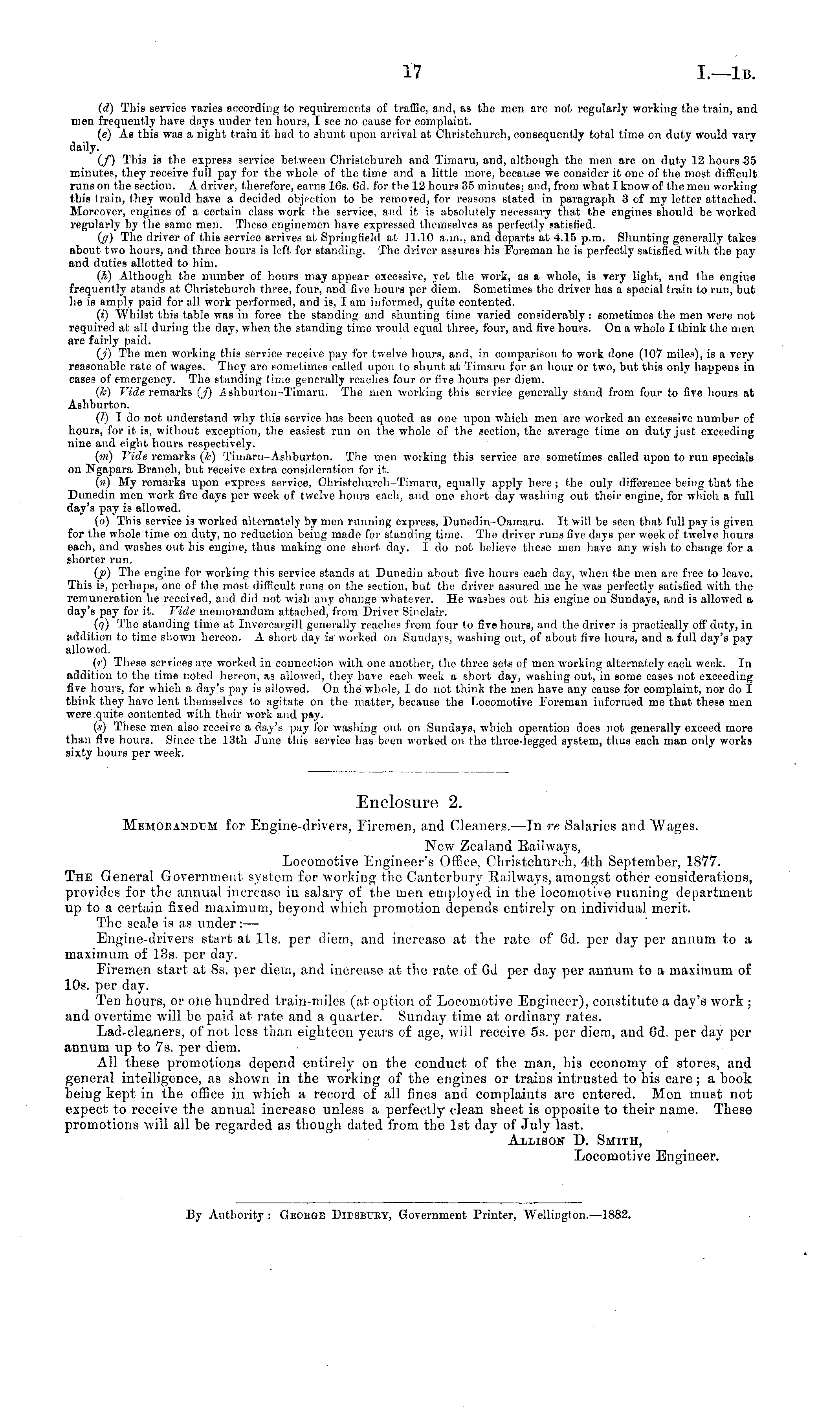 Enclosure 2. Memobandtjm for Engine-drivers, Firemen, and Cleaners. —In re Salaries and Wages. New Zealand Railways, Locomotive Engineer's Office, Christchureh, 4th September, 1877. The General Government system for working the Canterbury Railways, amongst other considerations, provides for the annual increase in salary of the men employed in the locomotive running department up to a certain fixed maximum, beyond which promotion depends entirely on individual merit. The scale is as under: — Engine-drivers start at lis. per diem, and increase at the rate of 6d. per day per annum to a maximum of 13s. per day. Firemen start at Bs. per diem, and increase at the rate of 6d per day per annum to a maximum of 10s. per day. Ten hours, or one hundred train-miles (at option of Locomotive Engineer), constitute a day's work ; and overtime will be paid at rate and a quarter. Sunday time at ordinary rates. Lad-cleaners, of not less than eighteen years of age, will receive ss. per diem, and 6d. per day per annum up to 7s. per diem. All these promotions depend entirely on the conduct of the man, his economy of stores, and general intelligence, as shown in the working of the engines or trains intrusted to his care; a book being kept in the office in which a record of all fines and complaints are entered. Men must not expect to receive the annual increase unless a perfectly clean sheet is opposite to their name. These promotions will all be regarded as though dated from the Ist day of July last. Allisok D. Smith, Locomotive Engineer.