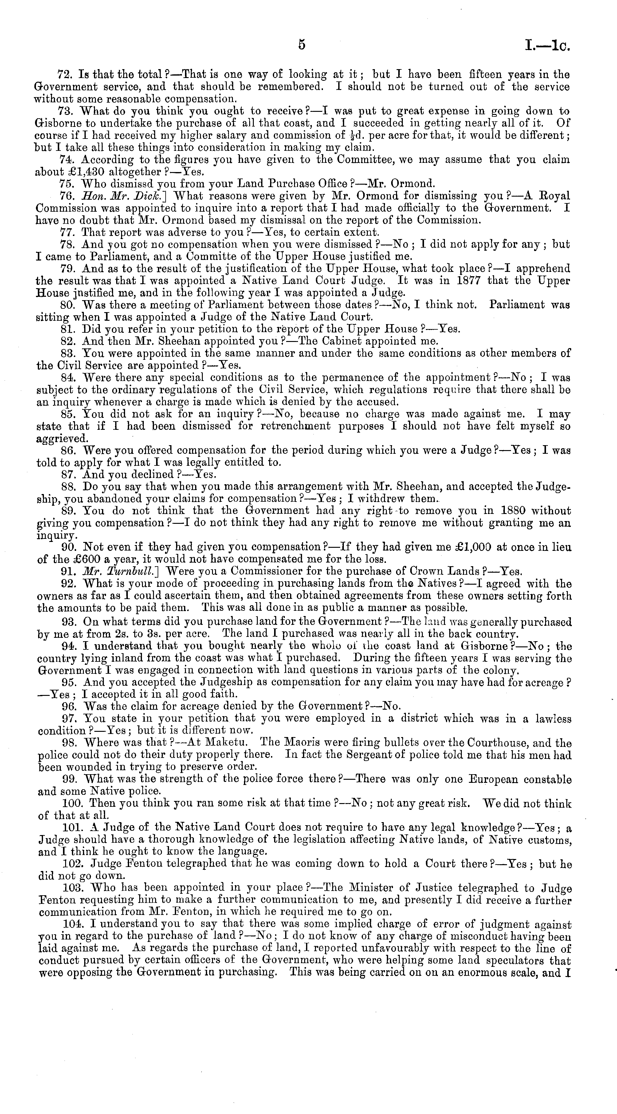 72. Is that the total ?—That is one way of looking at it; but I have been fifteen years in the Government service, and that should be remembered. I should not be turned out of the service without some reasonable compensation. 73. What do you think you ought to receive? —I was put to great expense in going down to G-isborne to undertake the purchase of all that coast, and I succeeded in getting nearly all of it. Of course if I had received my higher salary and commission of id. per acre for that, it would be different; but I take all these things into consideration in making my claim. 74. According to the figures you have given to the Committee, we may assume that you claim, about £1,430 altogether ?—Yes. 75. Who dismissd you from your Land Purchase Office ? —Mr. Ormond. 76. Hon. Mr. Dick.~\ What reasons were given by Mr. Ormond for dismissing you ? —A Royal Commission was appointed to inquire into a report that I had made officially to the Government. I have no doubt that Mr. Ormond based my dismissal on the report of the Commission. 77. That report was adverse to you ? —Yes, to certain extent. 78. And you got no compensation when you were dismissed ? —No ; I did not apply for any ; but I came to Parliament, and a Committe of the Upper House justified me. 79. And as to the result of the justification of the Upper House, what took place ?—I apprehend the result was that I was appointed a Native Land Court Judge. It was in 1877 that the Upper House jnstified me, and in the following year I was appointed a Judge. 80. Was there a meeting of Parliament between those dates ? —No, I think not. Parliament was sitting when I was appointed a Judge of the Native Land Court. 81. Did you refer in your petition to the report of the Upper House ? —Yes. 82. And then Mr. Sheehan appointed you ? —The Cabinet appointed me. 83. You were appointed in the same manner and under the same conditions as other members of the Civil Service are appointed ?—Yes. 84. Were there any special conditions as to the permanence of the appointment ?—No ; I was subject to the ordinary regulations of the Civil Service, which regulations require that there shall be an inquiry whenever a charge is made which is denied by the accused. 85. You did not ask for an inquiry ? —No, because no charge was made against me. I may state that if I had been dismissed for retrenchment purposes I should not have felt myself so aggrieved. 86. Were you offered compensation for the period during which you were a Judge ?—Yes ; I was told to apply for what I was legally entitled to. 87. And you declined ? —Yes. 88. Do you say that when you made this arrangement with Mr. Sheehan, and accepted the Judgeship, you abandoned your claims for compensation ?—Yes ; I withdrew them. 89. You do not think that the Government had any right to remove you in 1880 without giving you compensation ? —I do not think they had any right to remove me without granting me an inquiry. 90. Not even if they had given you compensation ? —If they had given me £1,000 at once in lieu of the £600 a year, it would not have compensated me for the loss. 91. Mr. Turnbull.~\ Were you a Commissioner for the purchase of Crown Lands ? —Yes. 92. What is your mode of proceeding in purchasing lands from the Natives?—I agreed with the owners as far as I could ascertain them, and then obtained agreements from these owners setting forth the amounts to be paid them. This was all done in as public a manner as possible. 93. On what terms did you purchase land for the Government ? —The land was generally purchased by me at from 2s. to 3s. per acre. The land I purchased was nearly all in the back country. 94. I understand that you bought nearly the wholo of the coast land at Gisborne ? —No ; the country lying inland from the coast was what I purchased. During the fifteen years I was serving the Government I was engaged in connection with land questions in various parts of the colony. 95. And you accepted the Judgeship as compensation for any claim you may have had for acreage ? —Yes ; I accepted it in all good faith. 96. Was the claim for acreage denied by the Government ?—No. 97. You state in your petition that you were employed in a district which was in a lawless condition ? —Yes ; but it is different now. 98. Where was that ?—At Maketu. The Maoris were firing bullets over the Courthouse, and the police could not do their duty properly there. In fact the Sergeant of police told me that his men had been wounded in trying to preserve order. 99. What was the strength of the police force there ? —There was only one European constable and some Native police. 100. Then you think you ran some risk at that time ? —No ; not any great risk. We did not think of that at all. 101. A Judge of the Native Land Court does not require to have any legal knowledge?—Yes; a Judge should have a thorough knowledge of the legislation affecting Native lands, of Native customs, and I think he ought to know the language. 102. Judge Fentou telegraphed that he was coming down to hold a Court there ? —Yes ; but he did not go down. 103. Who has been appointed in your place ?—The Minister of Justice telegraphed to Judge Fenton requesting him to make a further communication to me, and presently I did receive a further communication from Mr. Fenton, in which he required me to go on. 104. I understand you to say that there was some implied charge of error of judgment against you in regard to the purchase of land ? —No ; I do not know of any charge of misconduct having been laid against me. As regards the purchase of land, I reported unfavourably with respect to the line of conduct pursued by certain officers of the Government, who were helping some land, speculators that were opposing the Government in purchasing. This was being carried on on an enormous scale, and I